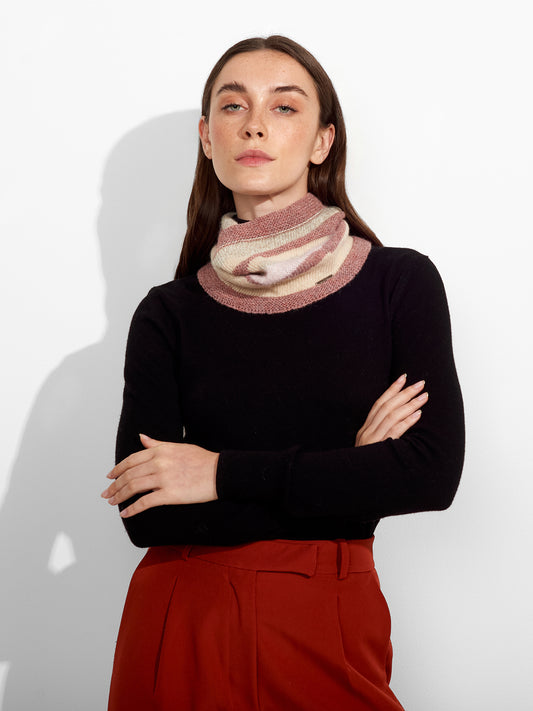 Zanni Knit Neckwarmer in pink tone, featuring horizontal stripes of varying widths. The defined edges...