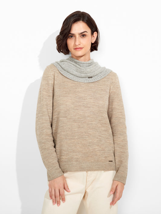 Zegovia Knit Neckwarmer in beige tone, featuring an irregular horizontal stripe design that adds visual...