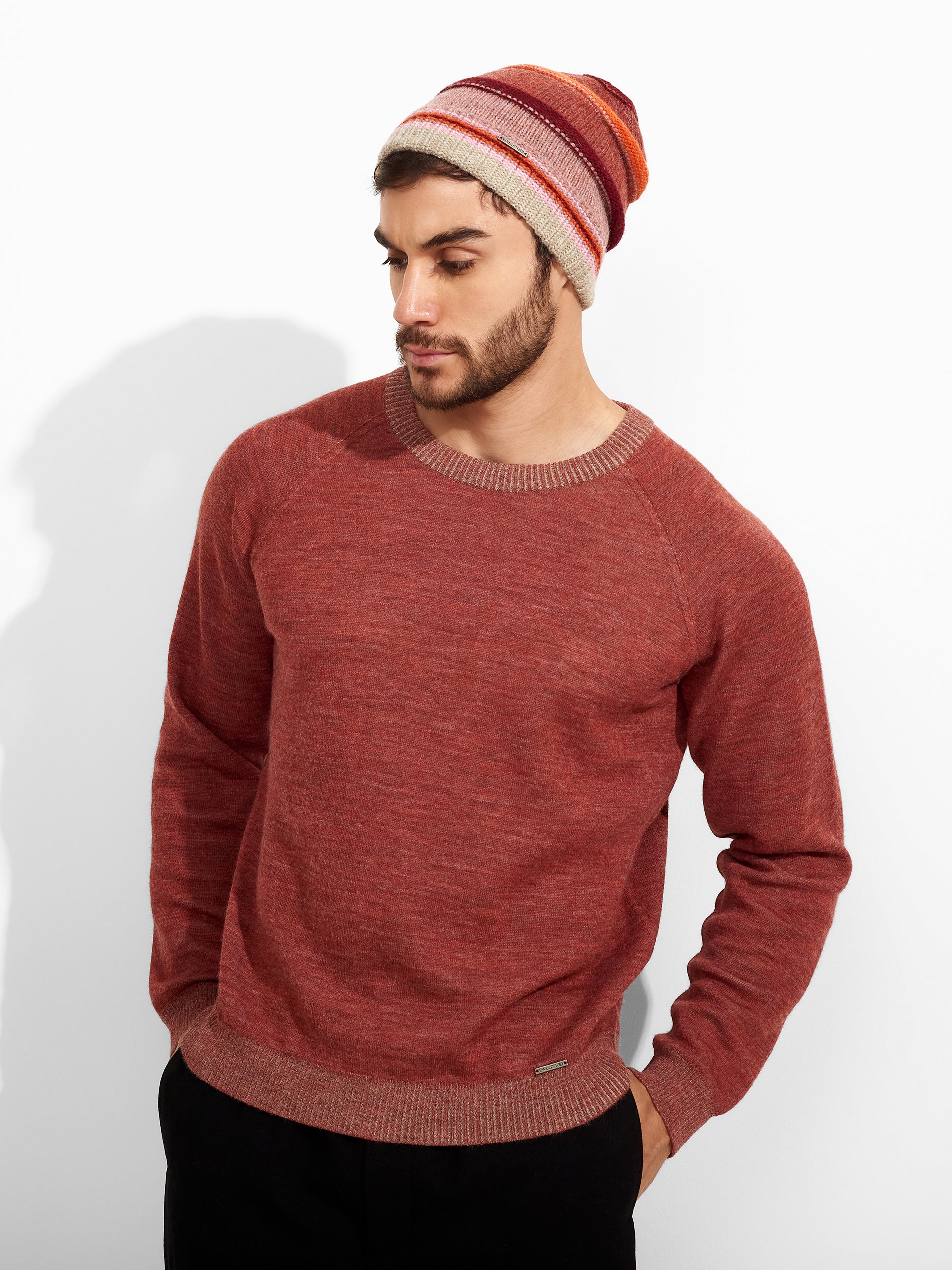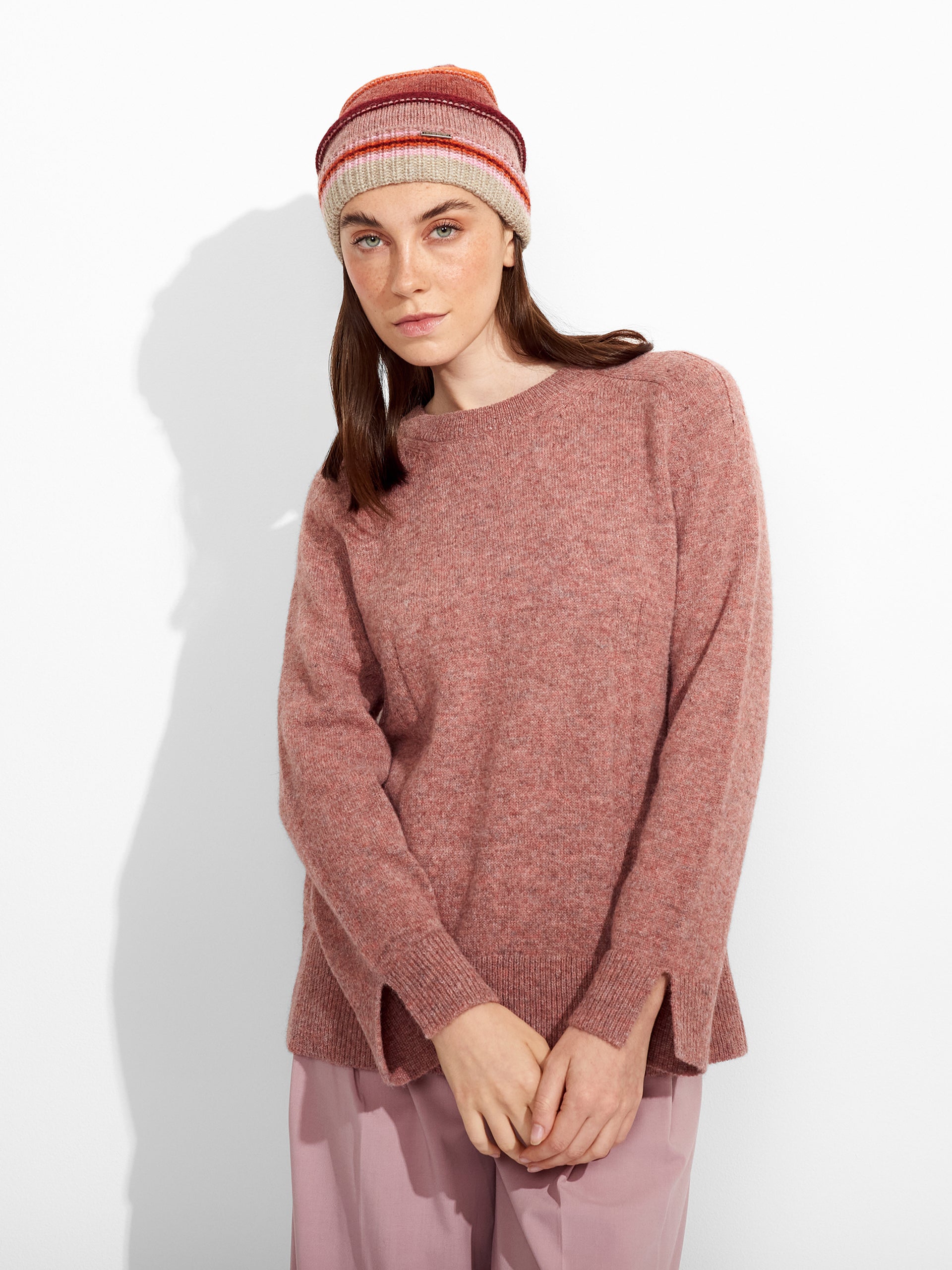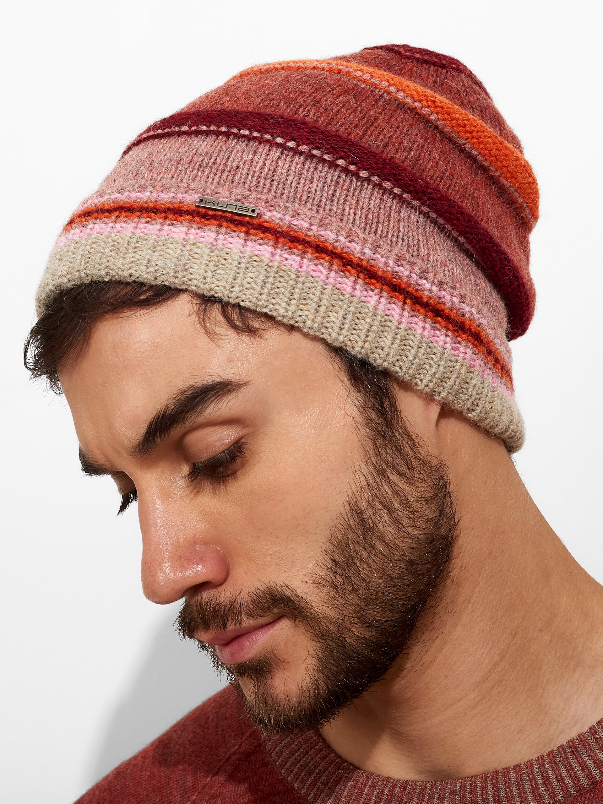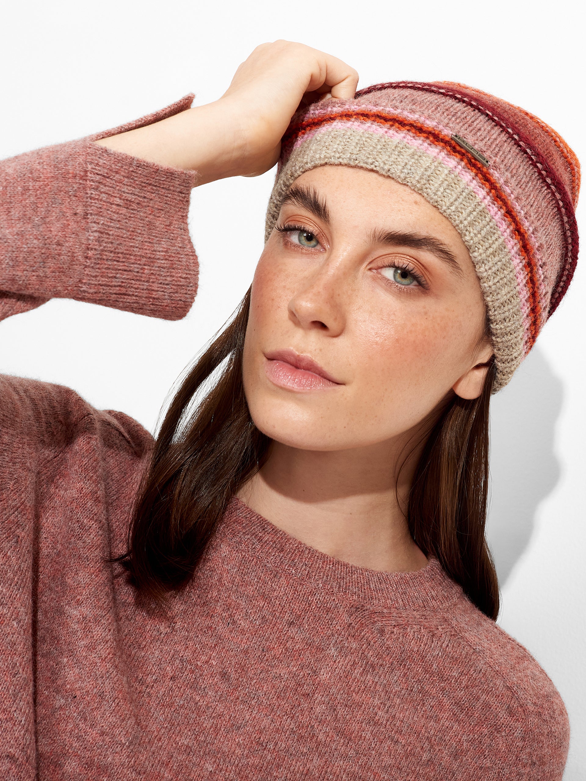 Zanni Hat in pink tone, featuring horizontal stripes that add a distinctive style. It offers a snug fit. Crafted from baby alpaca, it provides softness, warmth, and comfort. | Predominant material: Baby Alpaca
