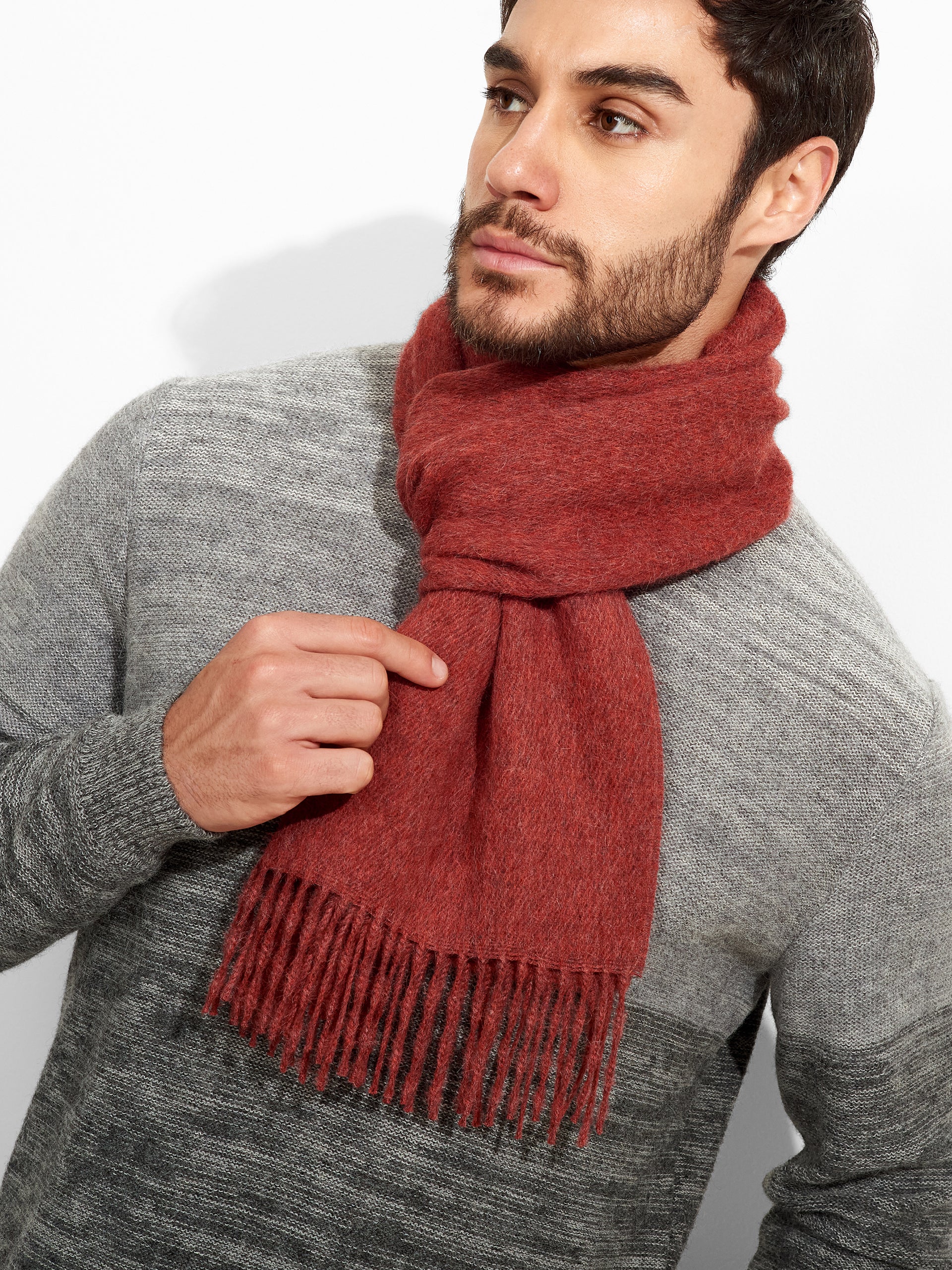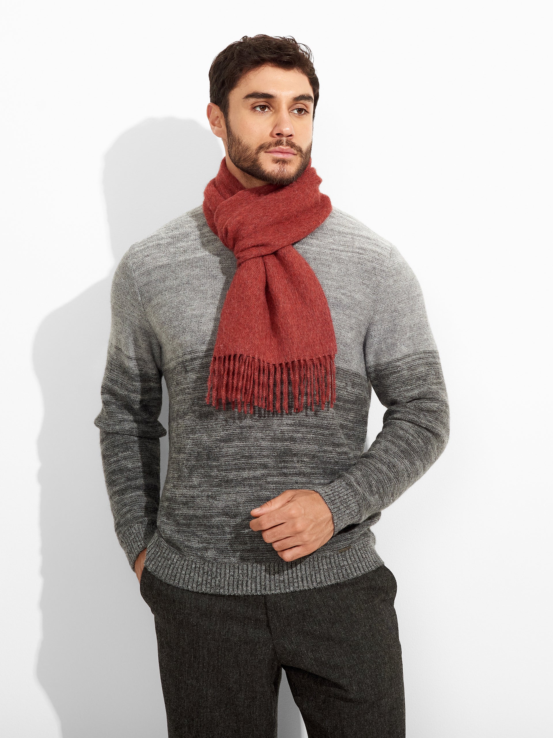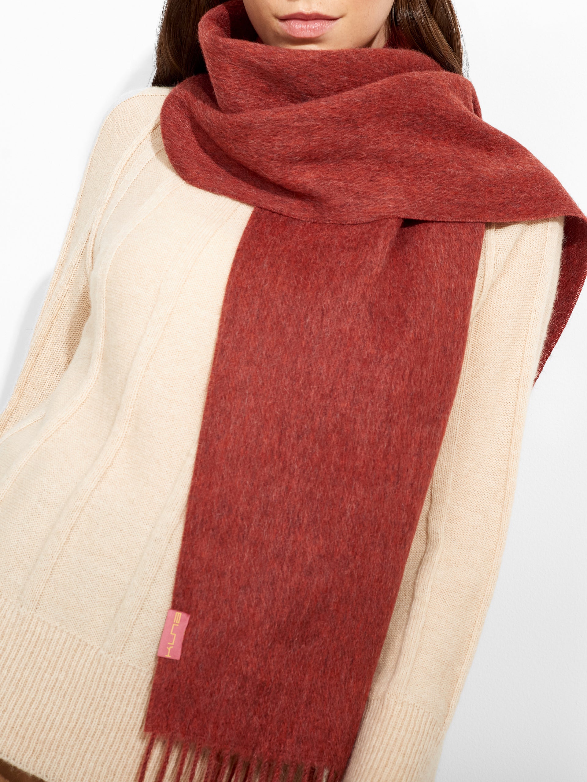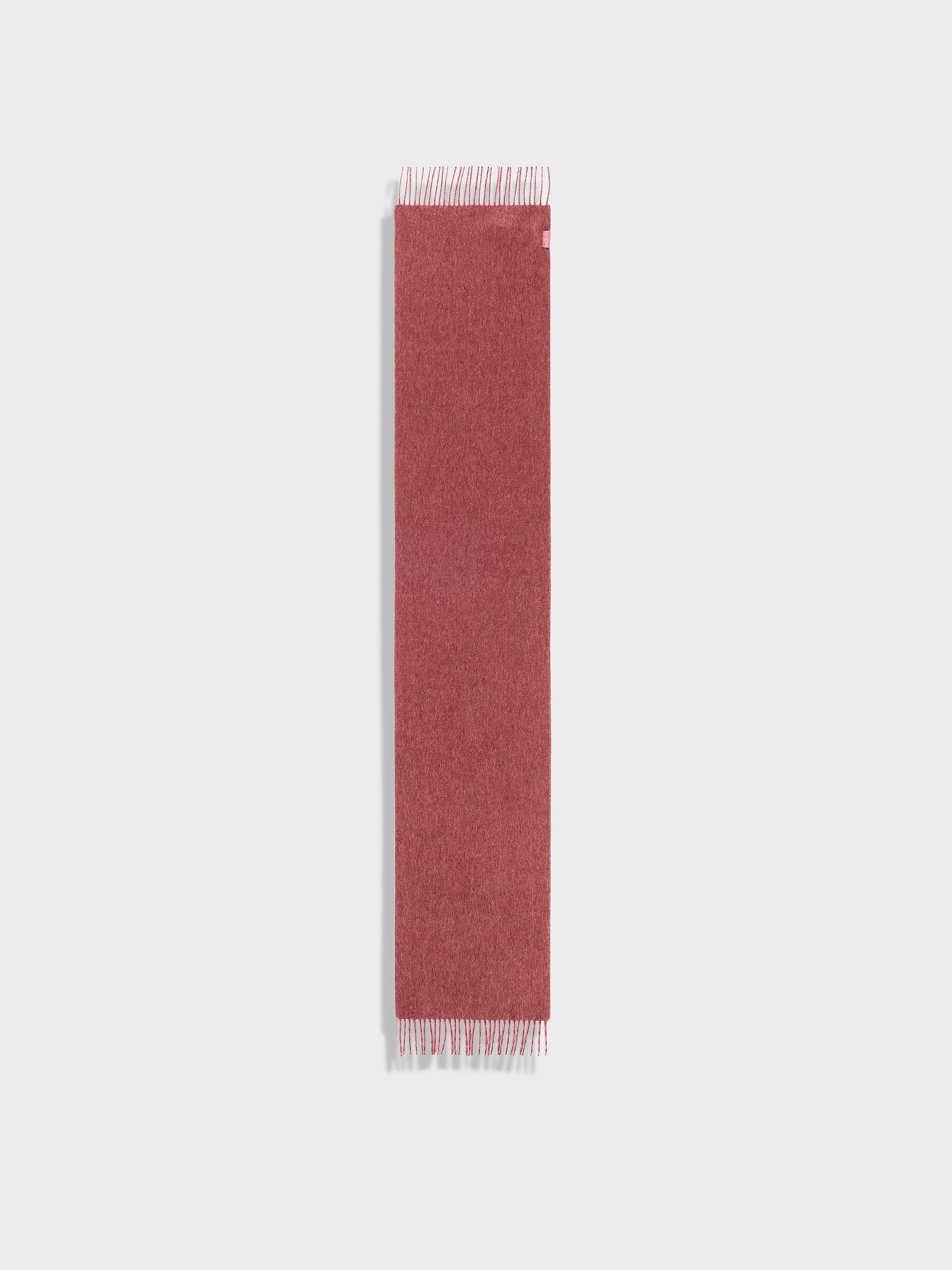 Zeta Scarf in red tone, designed in solid color with thick fringed edges. Crafted from baby alpaca, it offers warmth and exceptional softness. | Predominant material: Baby Alpaca