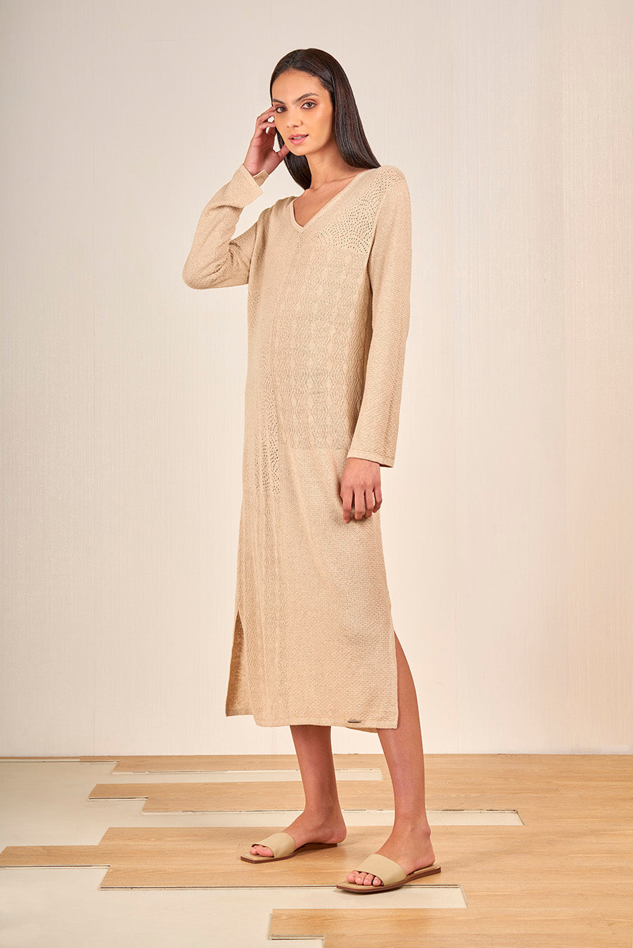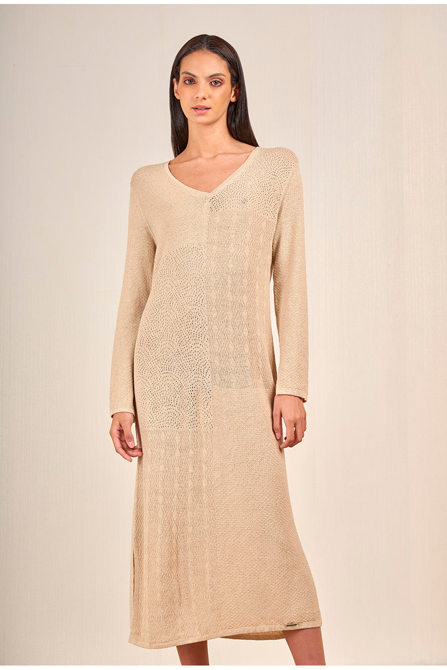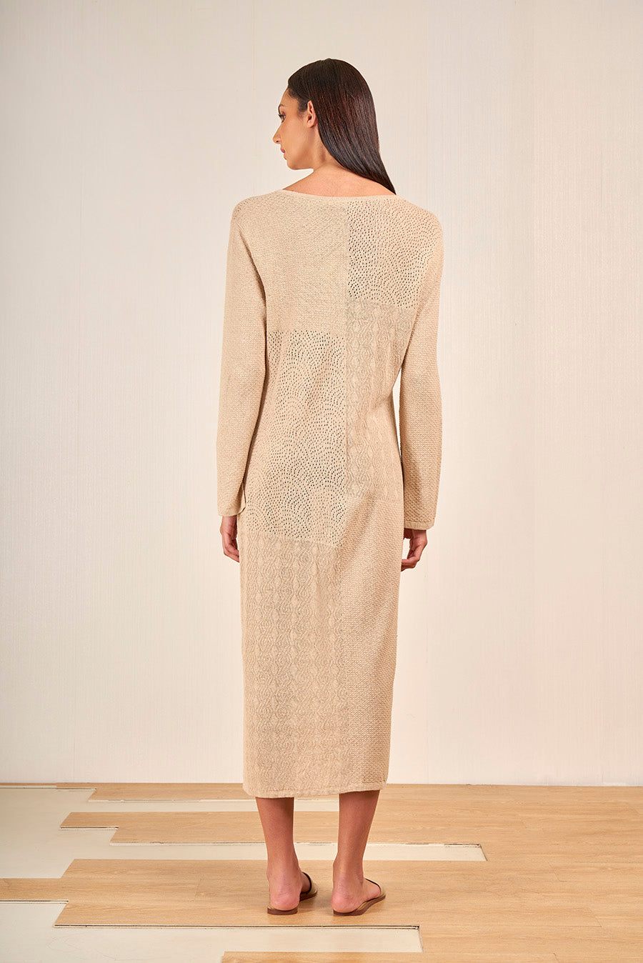 Vestido largo hecho con algodón y lino. Cuenta con un mix de puntos calados y estructuras, dándole un toque especial a una prenda clásica. | Material predominante: Lino & Algodón