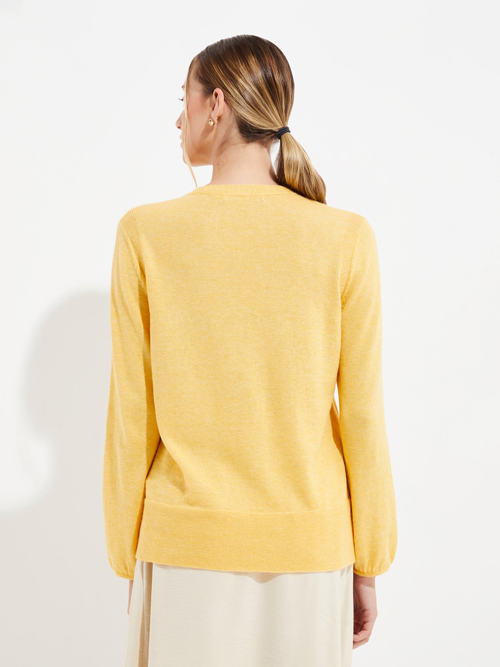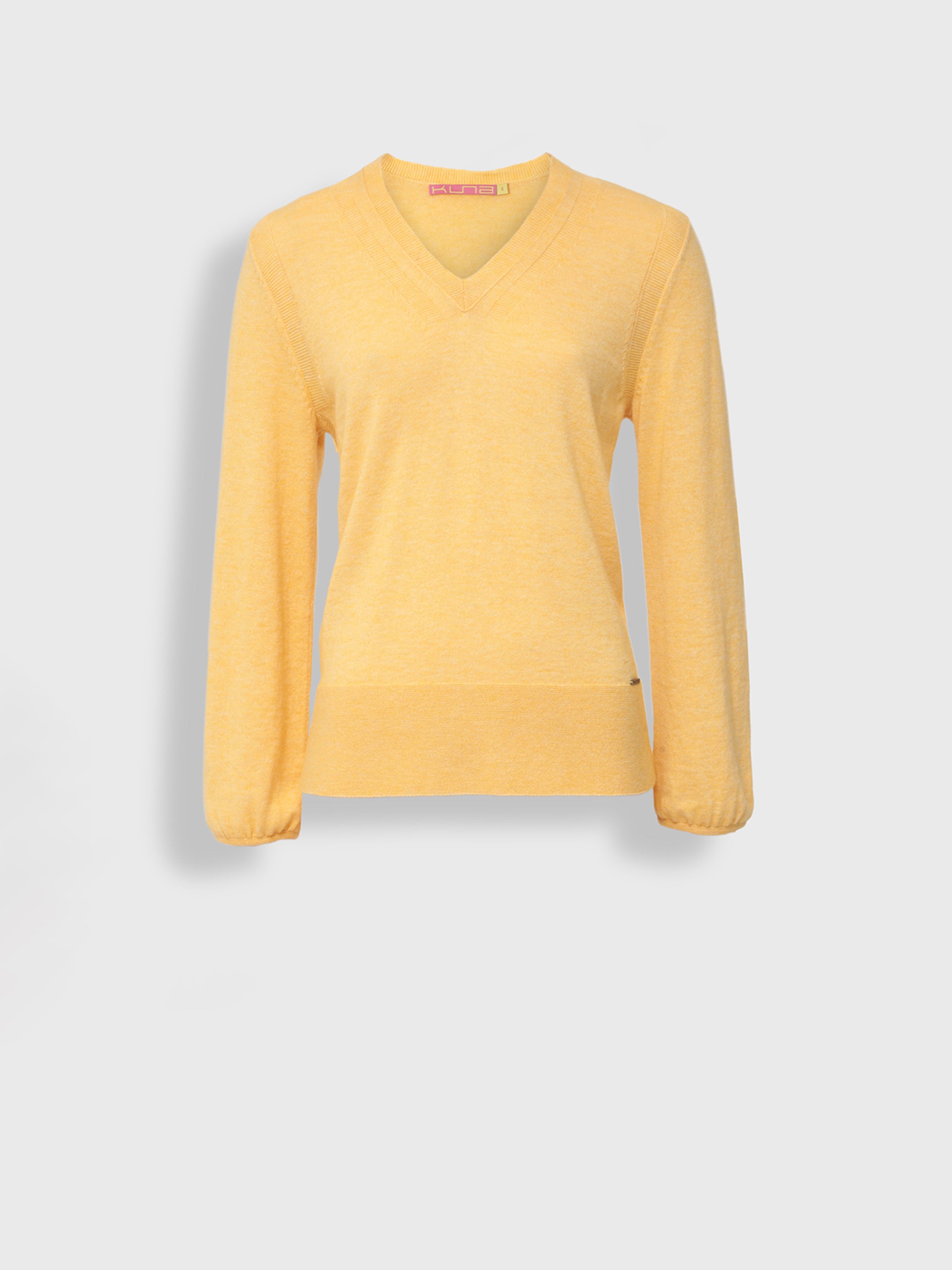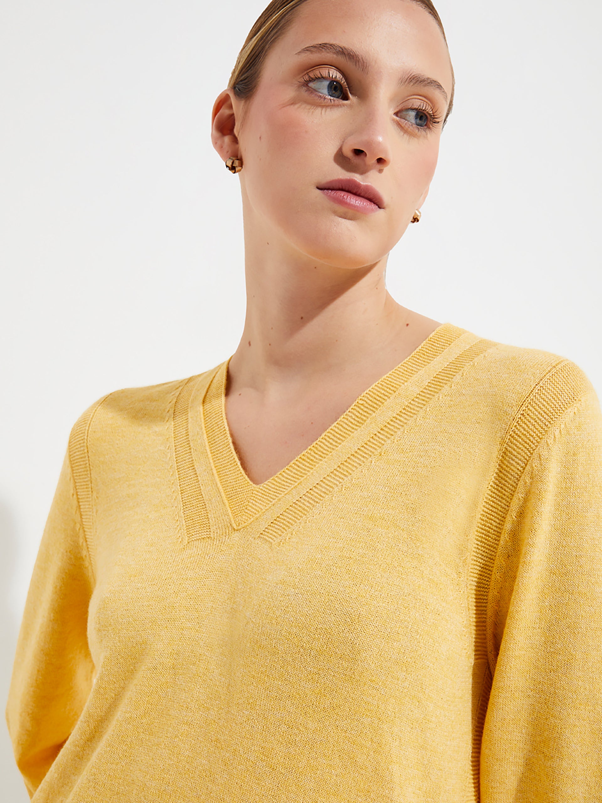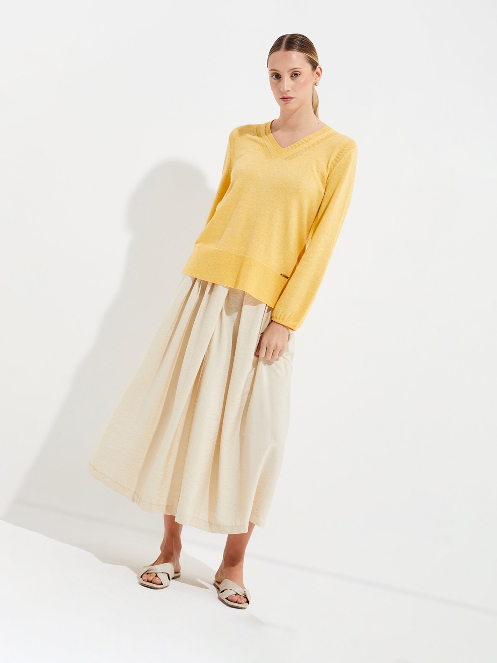 The Yliada sweater, knitted in jersey stitch, combines organic cotton and baby alpaca for greater softness. With a V-neckline, wide sleeves, gathered cuffs and oversize style, it offers a modern and comfortable look. Available in three warm tones, it is perfect for a casual and cozy style. | Predominant material: Cotton
