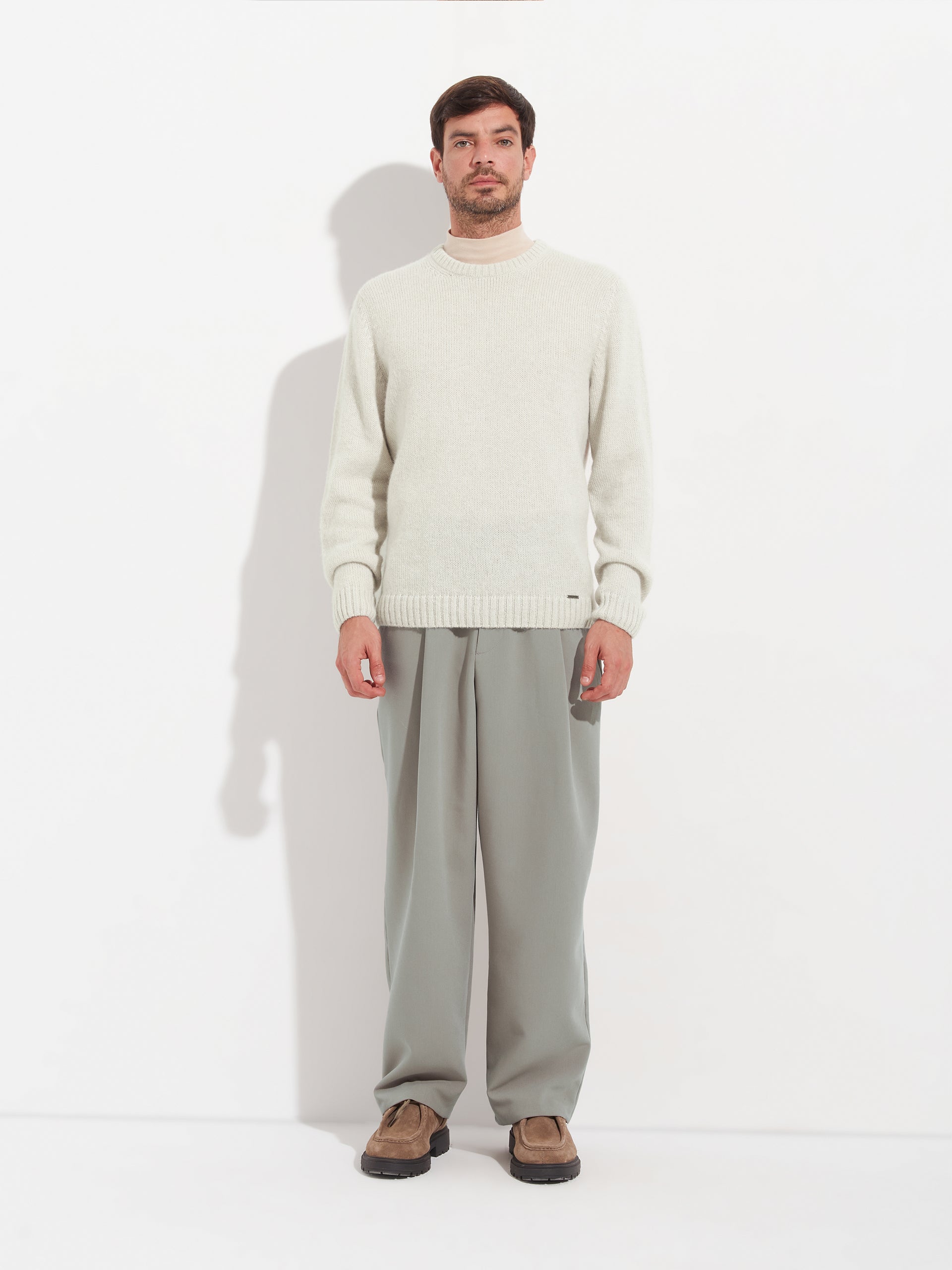 Arequipa sweater in beige, unisex design and slightly relaxed silhouette. Made of 100% baby alpaca, it offers a soft and warm texture. Full color, it has a classic round neck and waistband and cuffs that provide structure and a neat finish. | Predominant material: Baby Alpaca