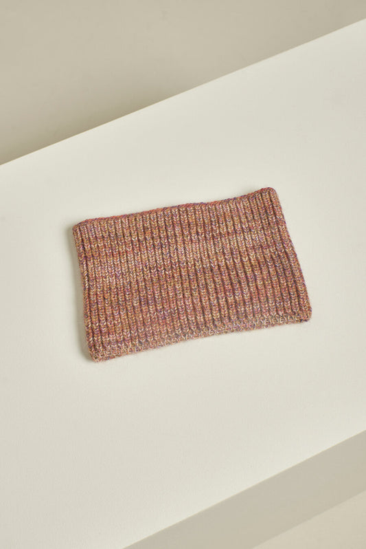 Zanni Knit Neckwarmer in pink tone, featuring horizontal stripes of varying widths. The defined edges...
