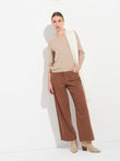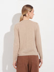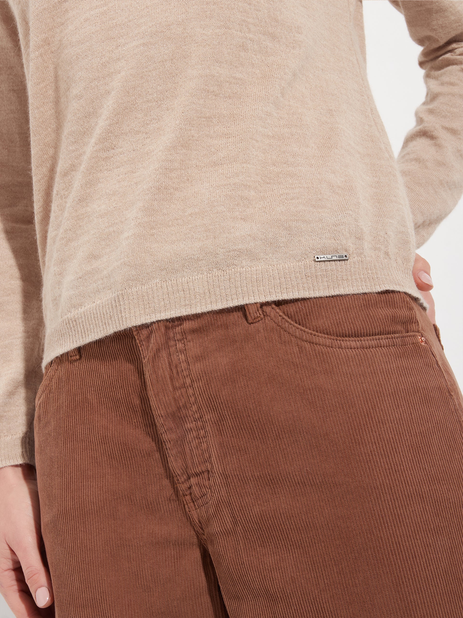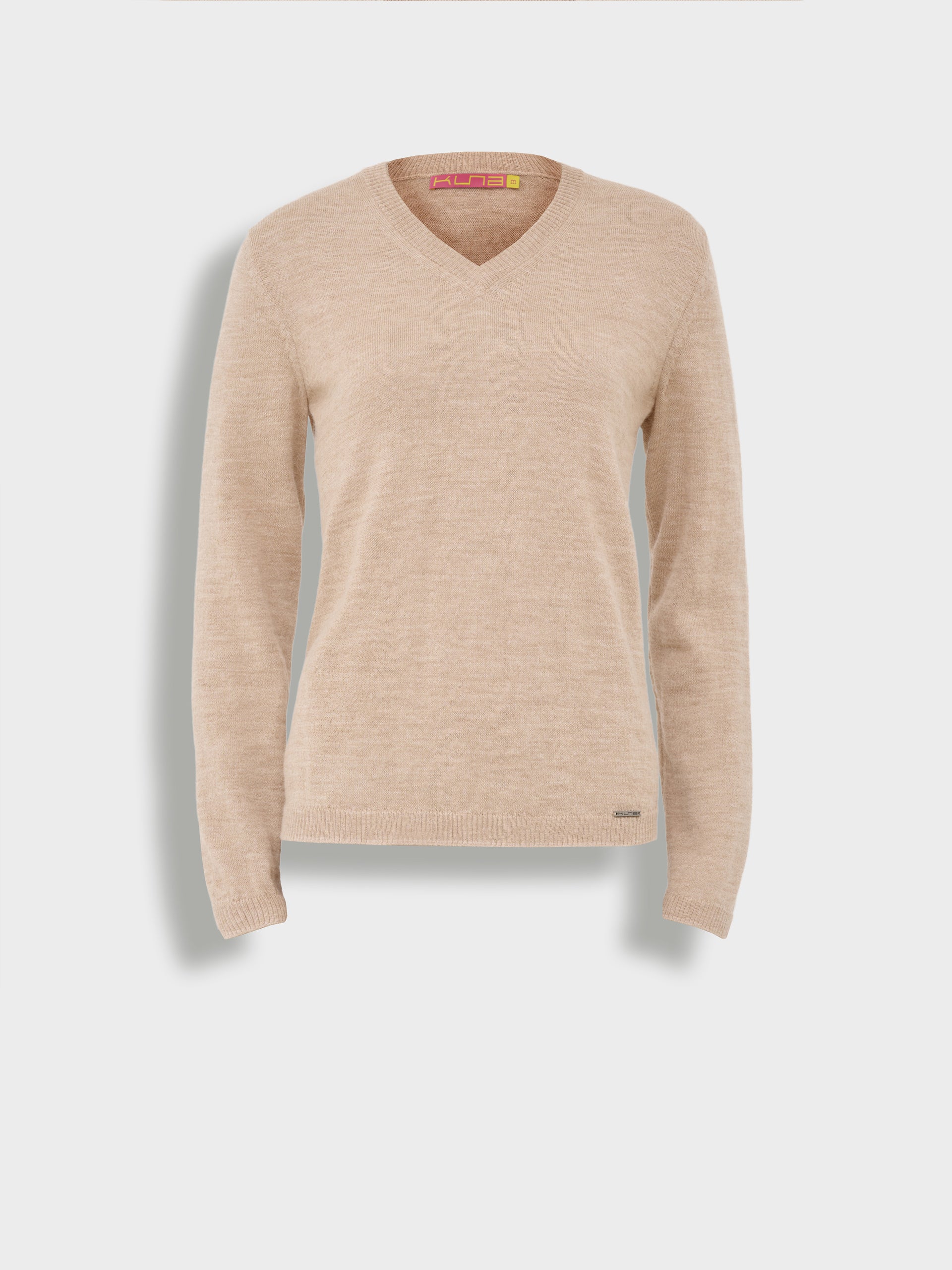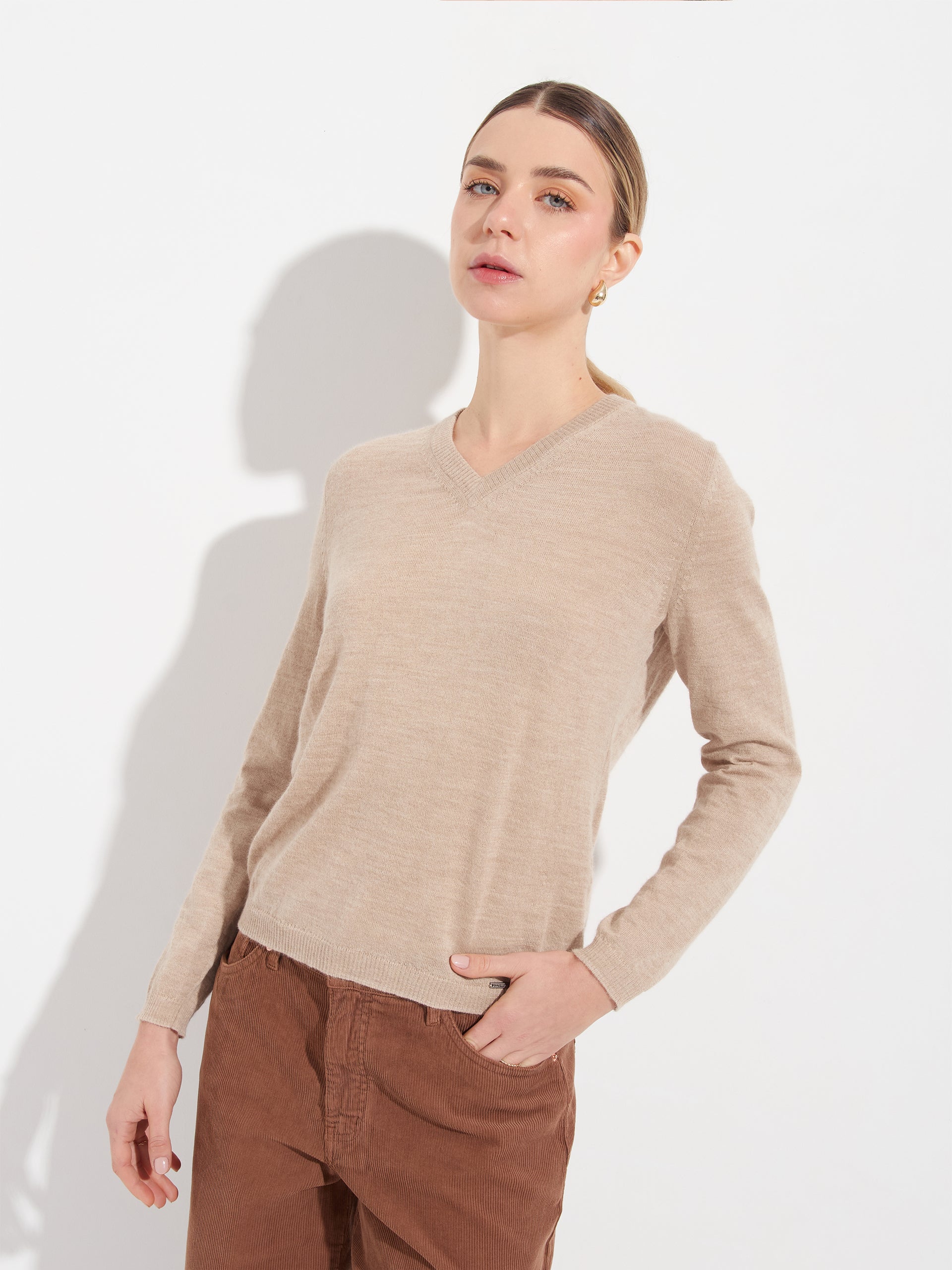 Abril sweater in beige, made in 100% baby alpaca. It features a classic full-color design, with an elegant V-neck that adds a feminine and versatile touch. Ribbed waist and cuffs ensure a comfortable and stylish fit. | Predominant material: Baby Alpaca
