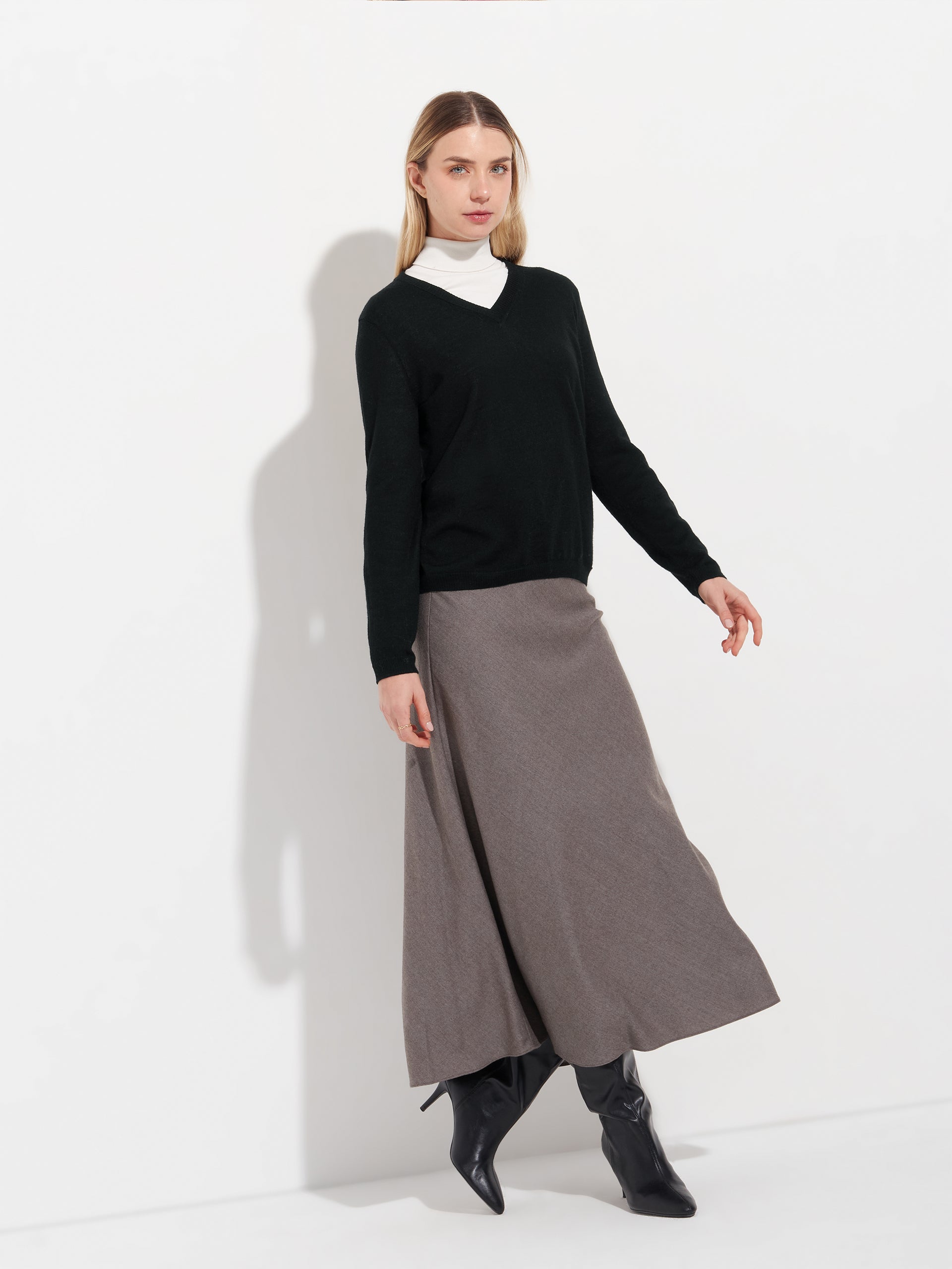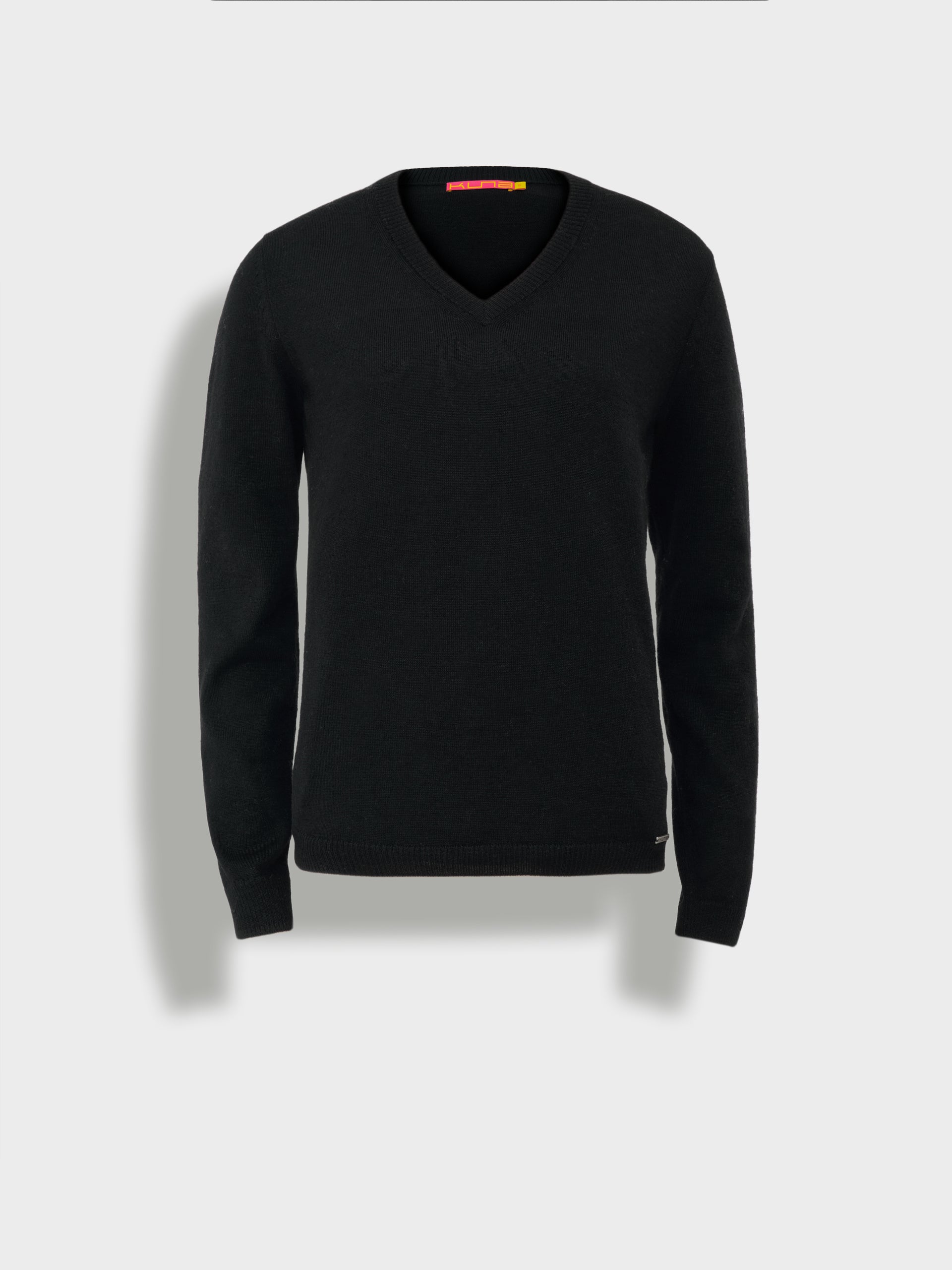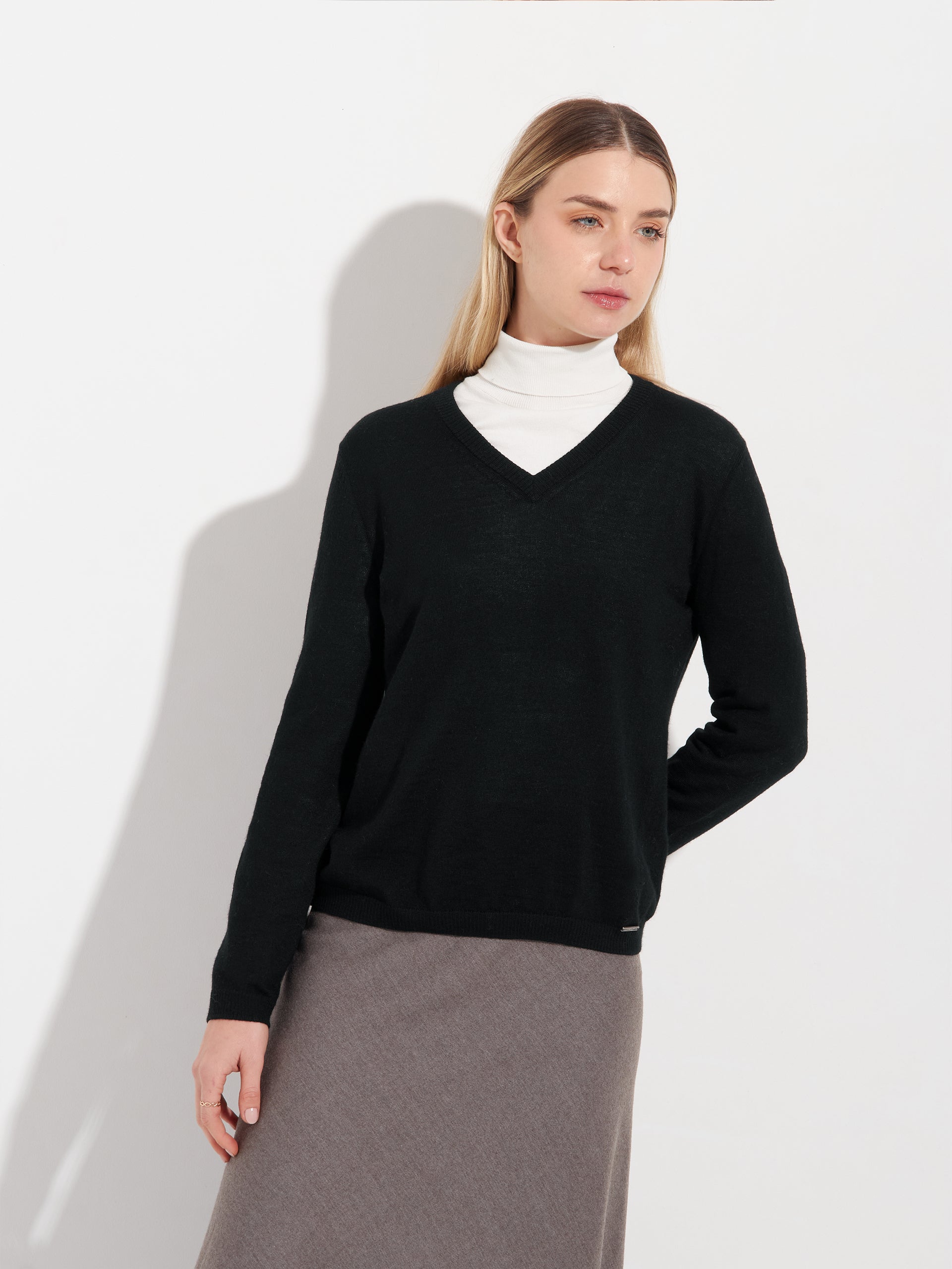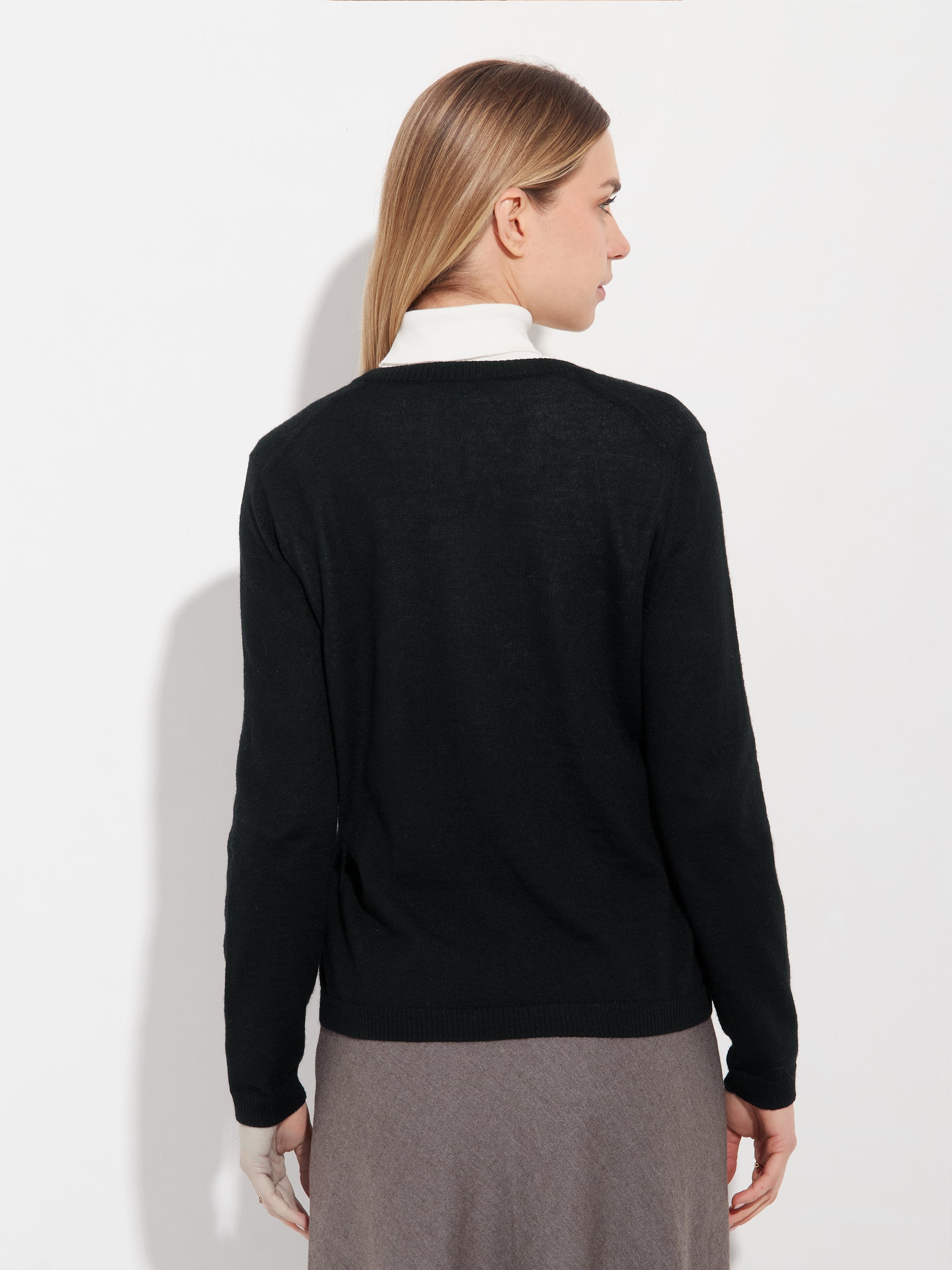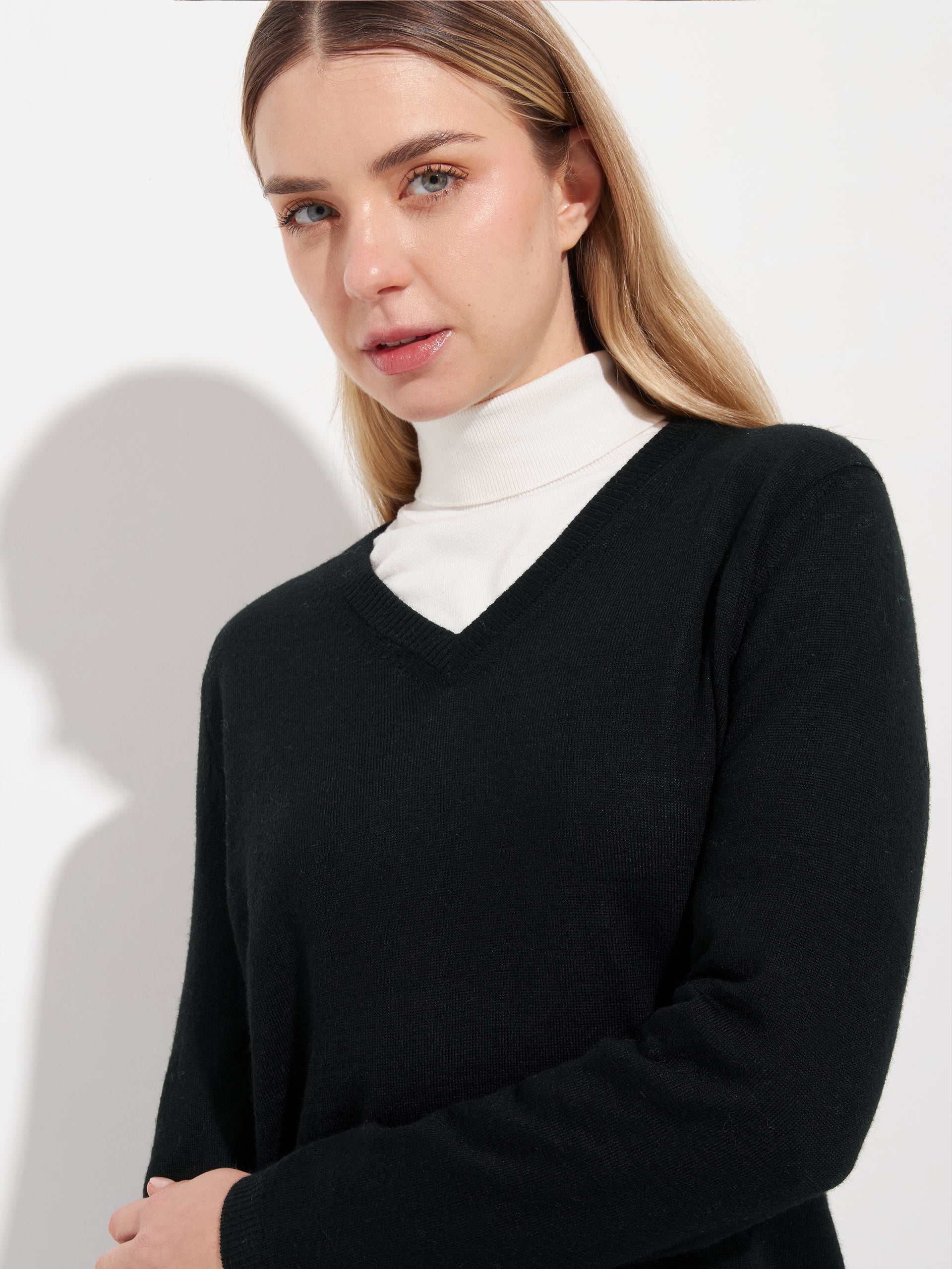 Abril sweater in black, made of 100% baby alpaca. It features a classic full-color design, with an elegant V-neck that adds a feminine and versatile touch. Ribbed waist and cuffs ensure a comfortable and stylish fit. | Predominant material: Baby Alpaca