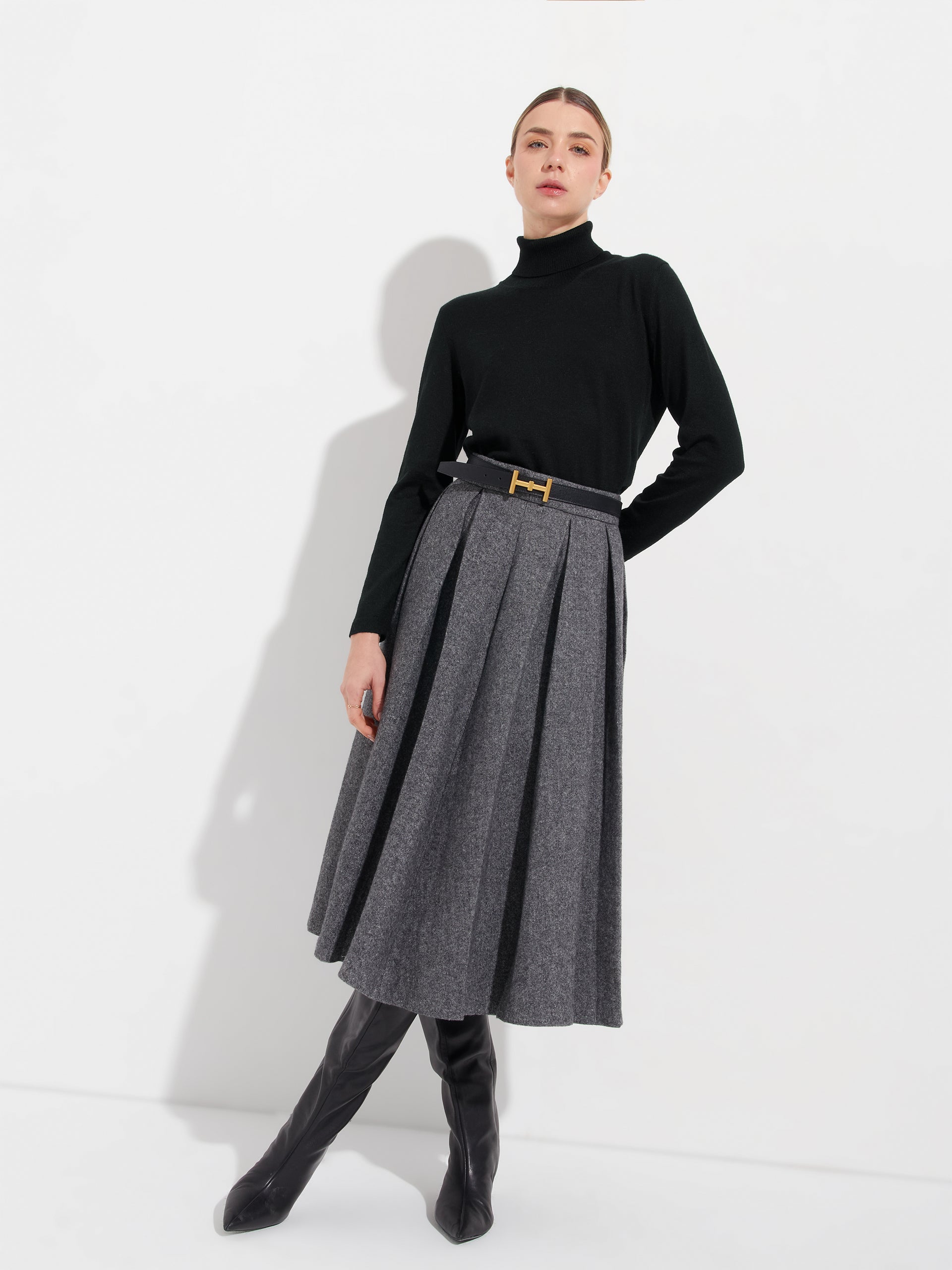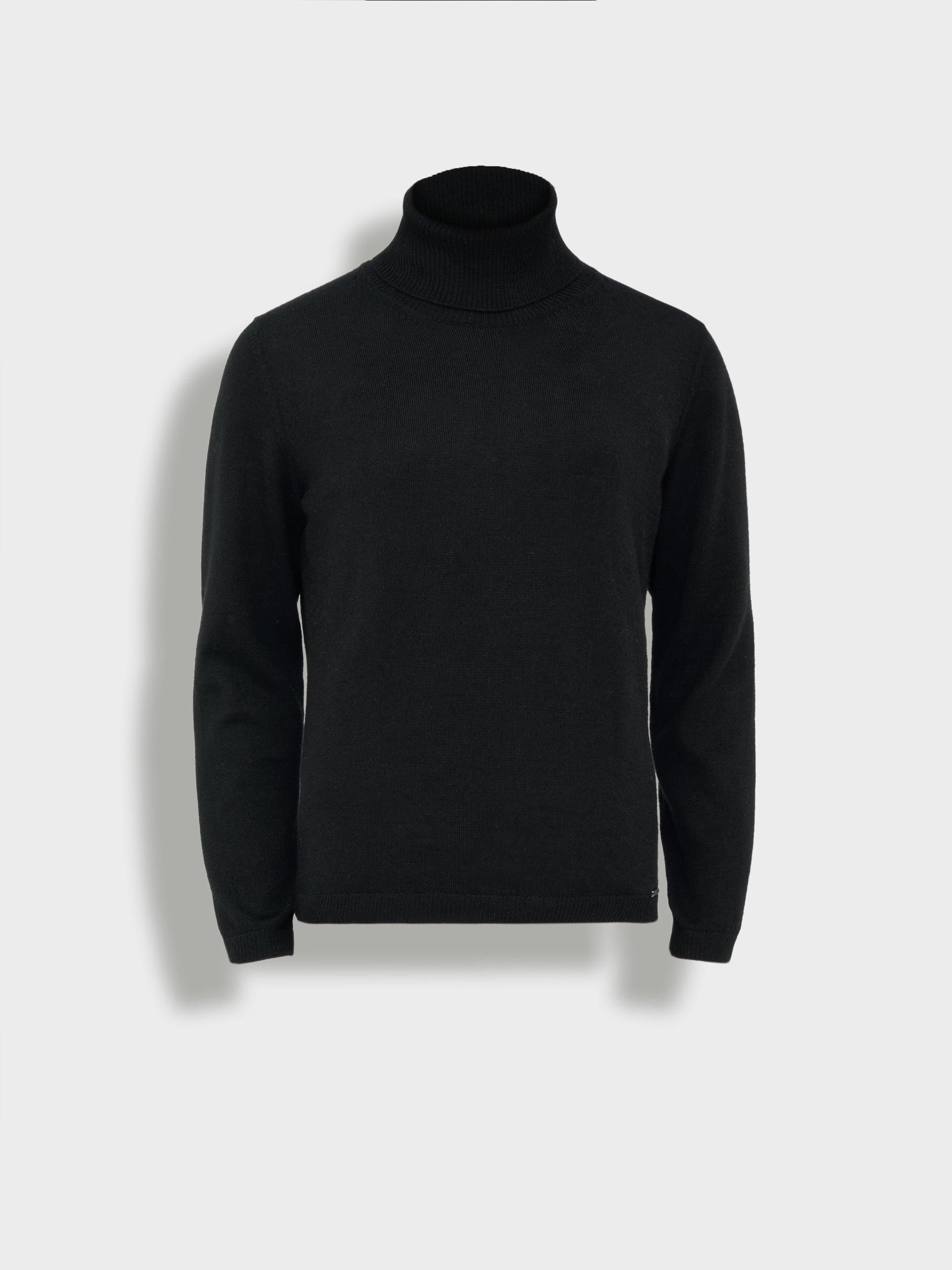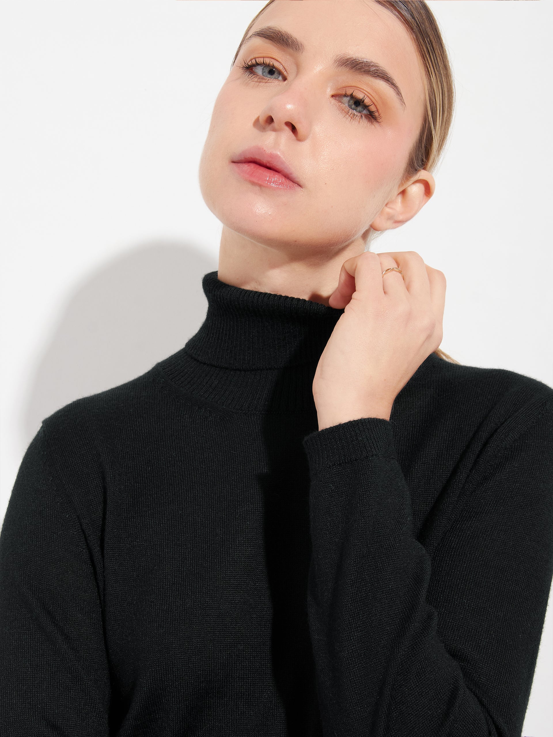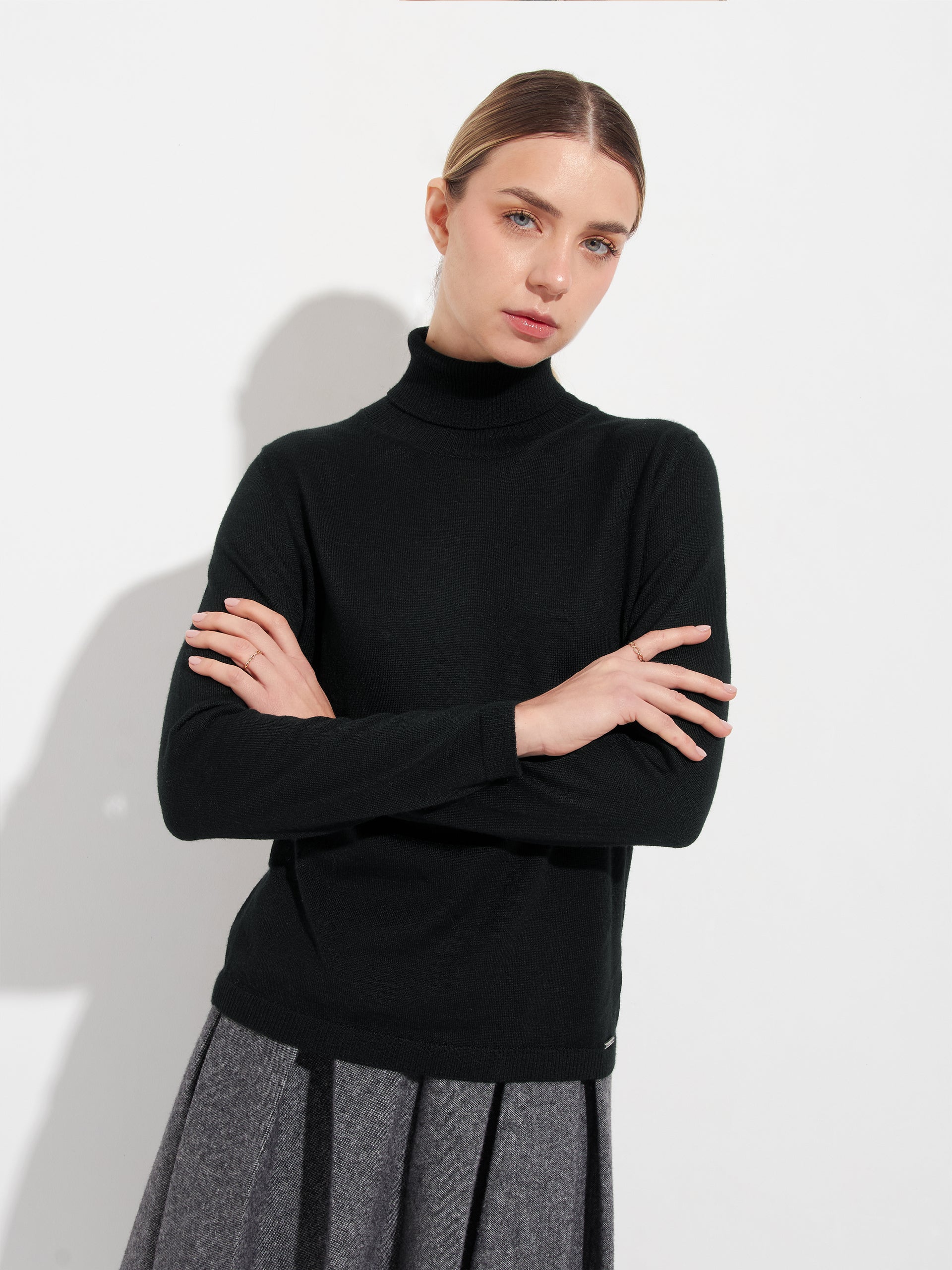Amber sweater in black, made of a delicate blend of baby alpaca and silk, which offers a soft, light and exceptionally warm texture. The classic, full-color design features a sophisticated turtleneck for elegance and versatility. Waist and cuff waistbands provide a comfortable and stylish fit. | Predominant material: Baby Alpaca