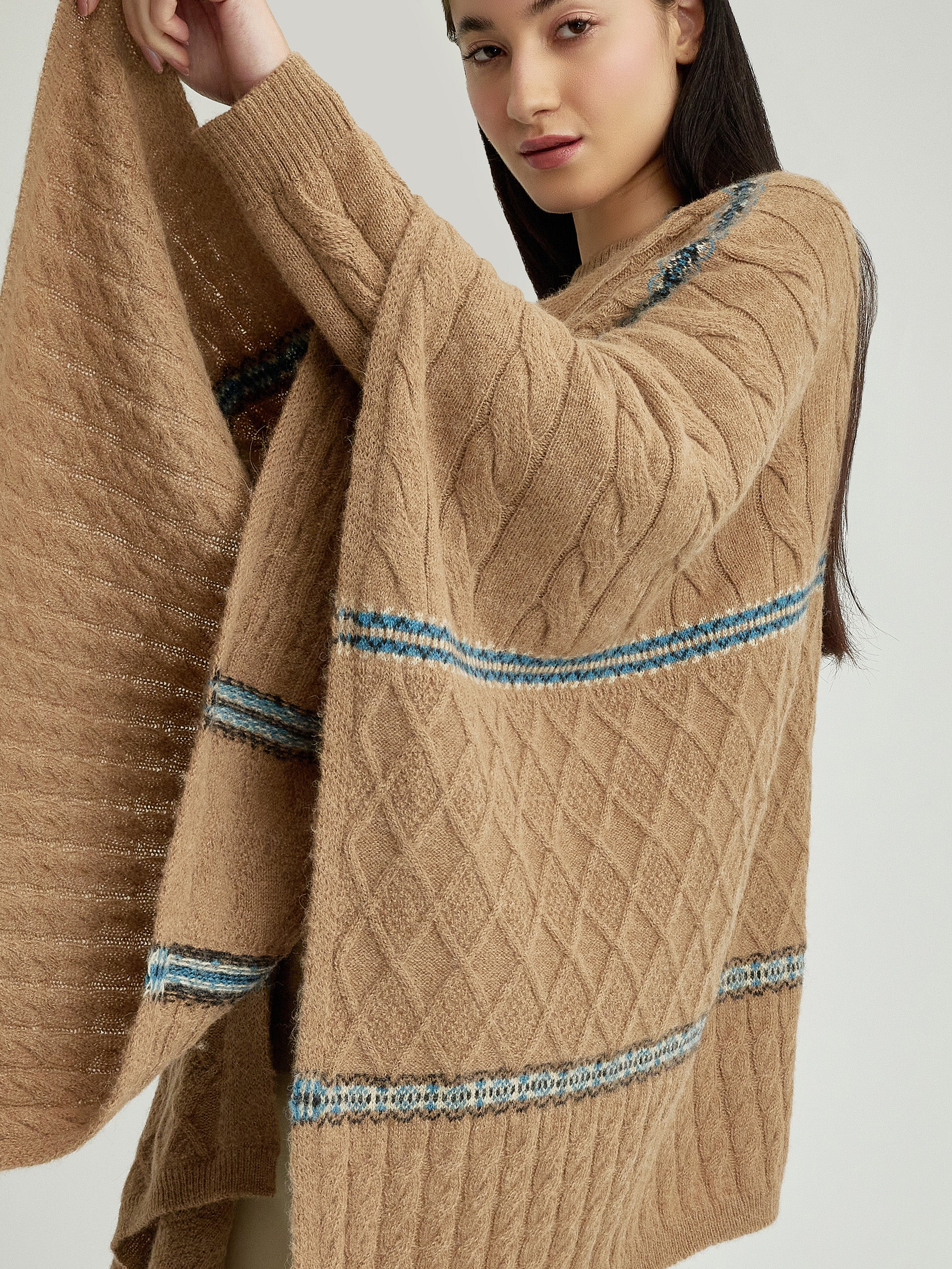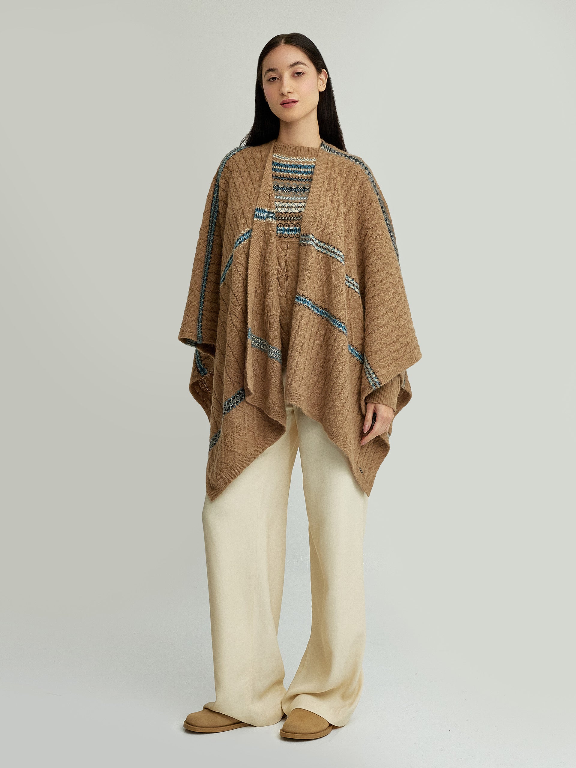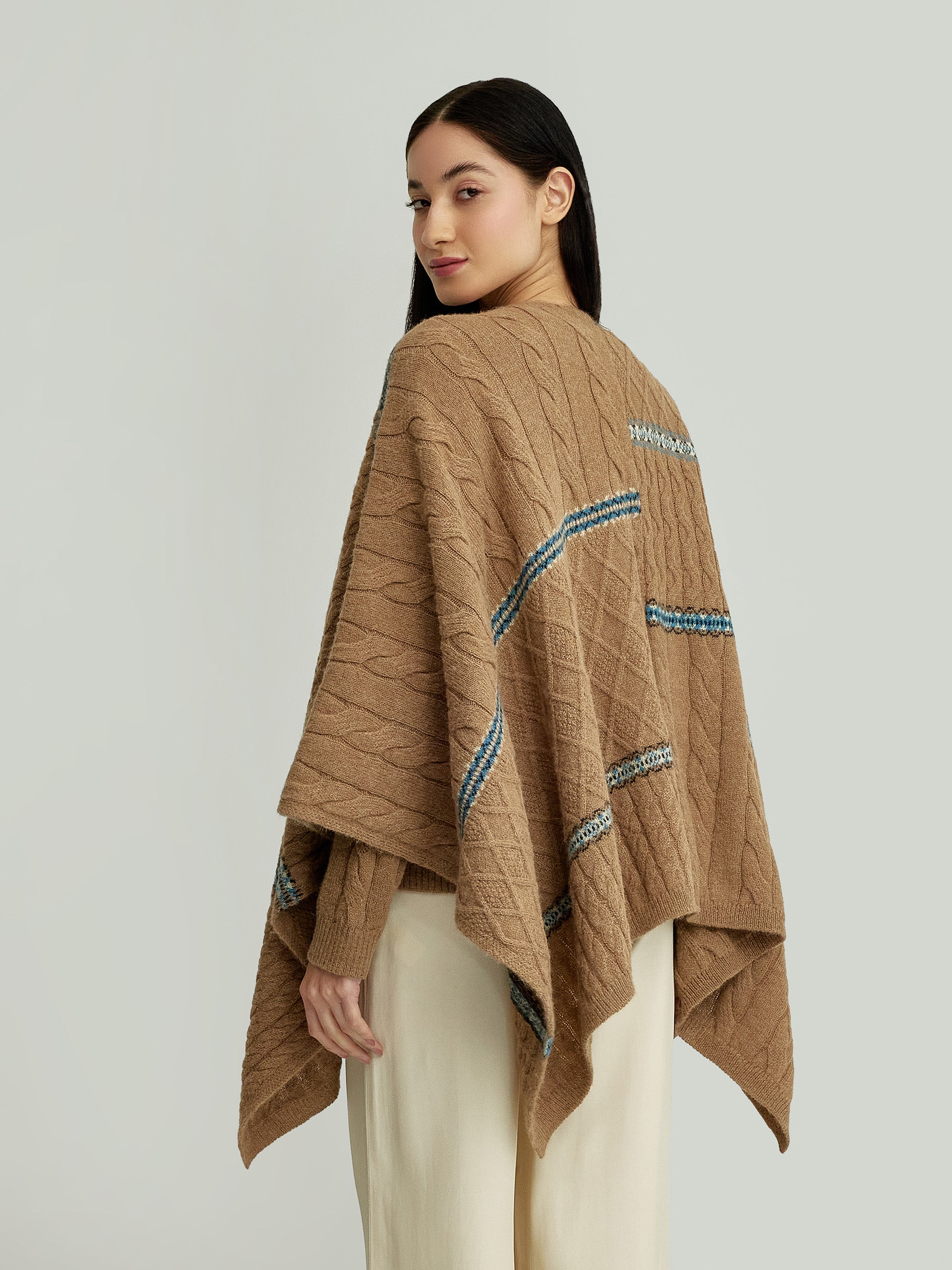 The Yael cape, made of soft baby alpaca, is a masterpiece of style and comfort. Its natural-color braided design, enhanced with colorful details, adds a touch of sophistication and originality to any outfit. It is the perfect item to wear elegantly during the coldest days of the year. | Predominant material: Baby Alpaca
