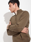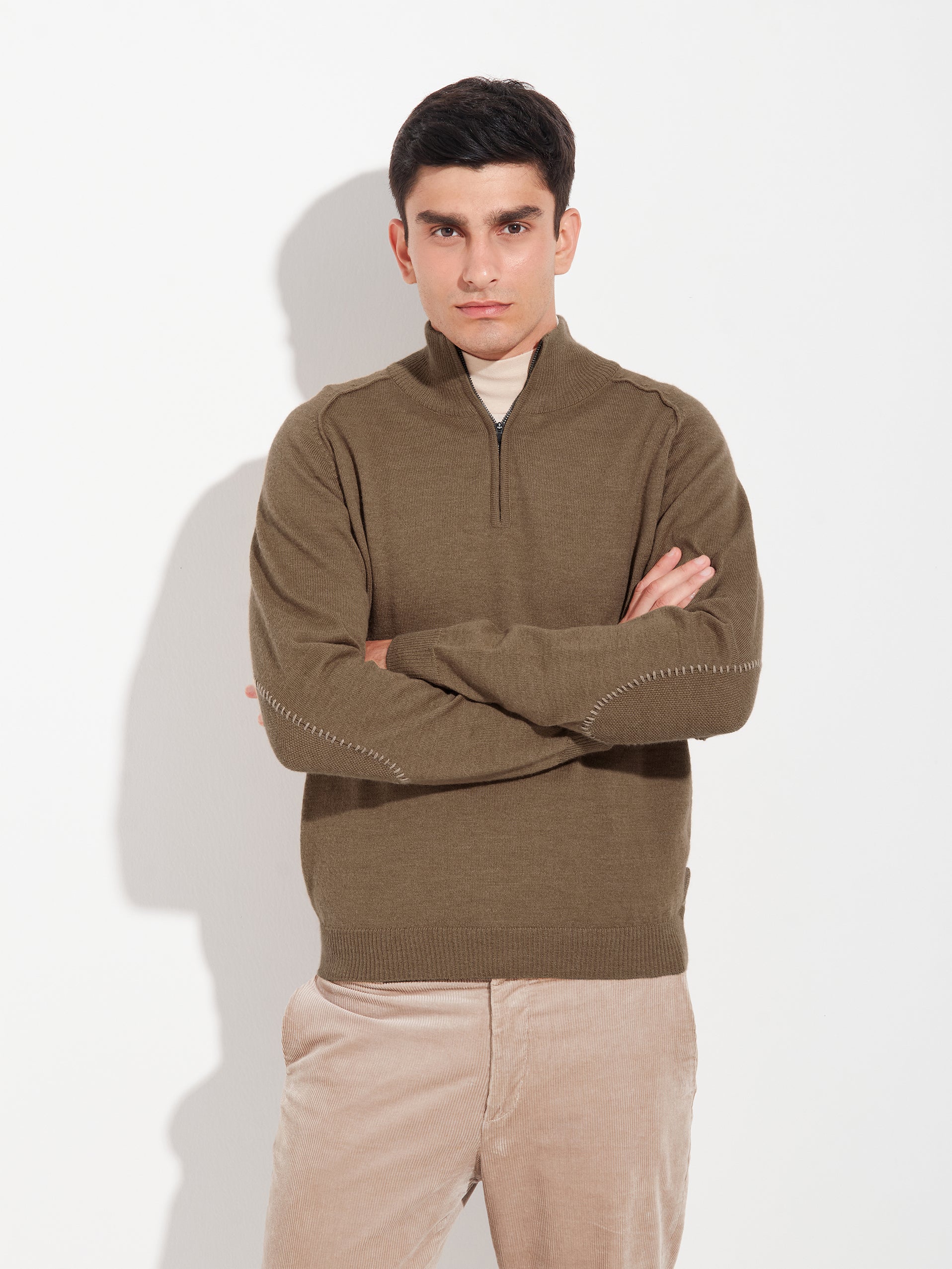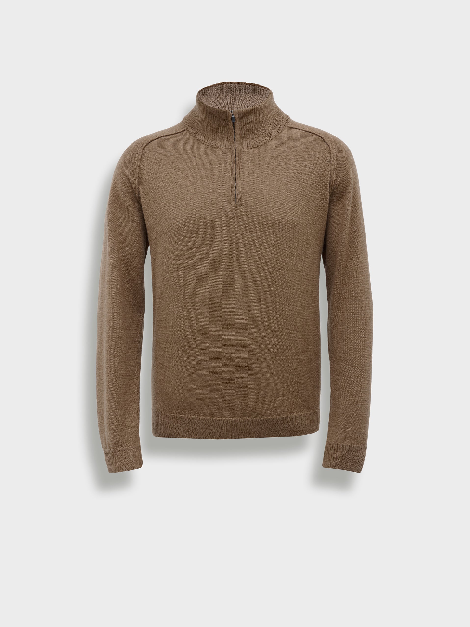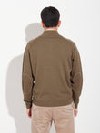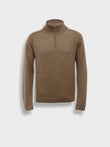 Bugatti sweater in camel, with a high neck and front closure. Made from 100% RAS baby alpaca and knitted in jersey stitch. It features contrasting colors on the inside of the neck and elbow patches integrated into the fabric, adding a functional and distinctive detail. Includes RAS certification for responsible sourcing and animal welfare. | Predominant material: Baby Alpaca