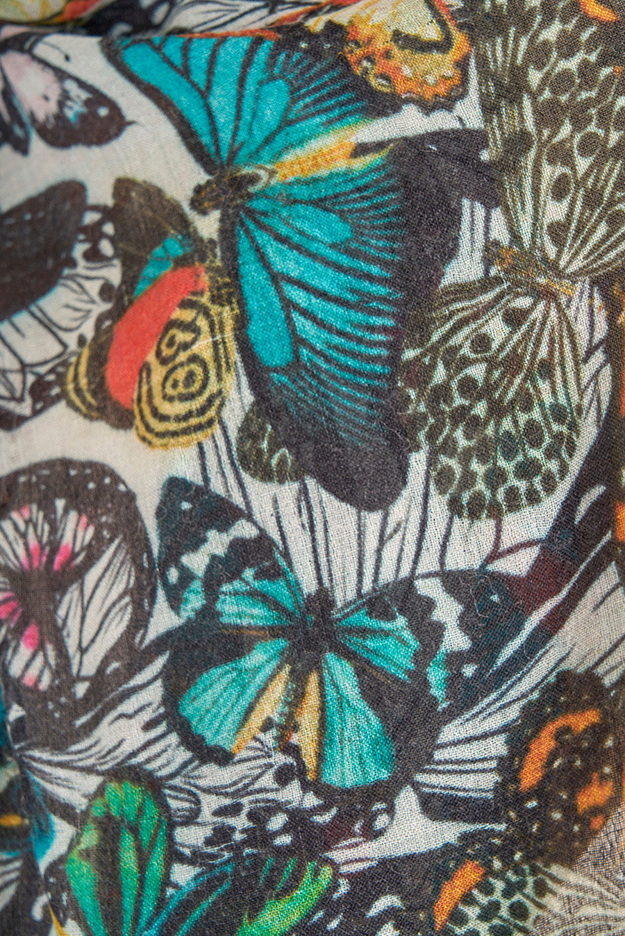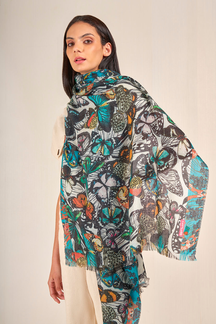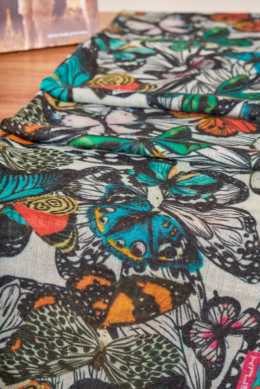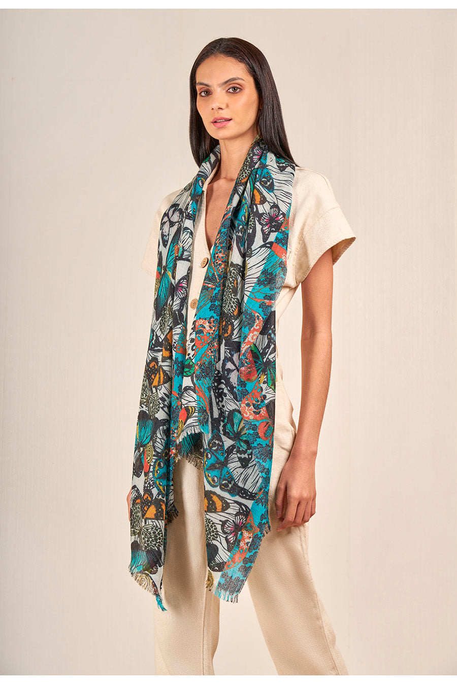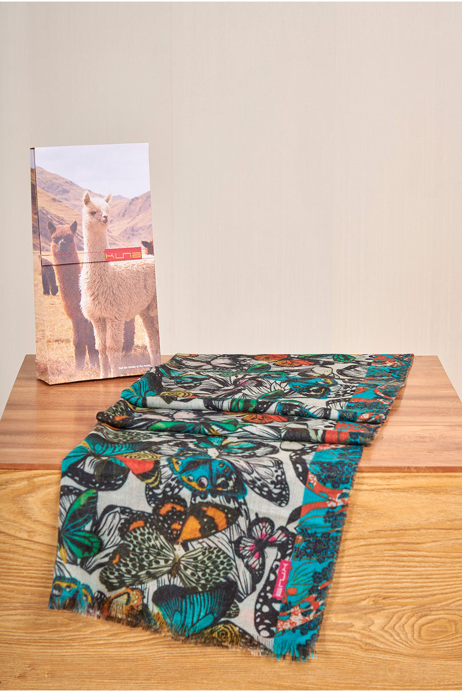 Estola única en colores vivos, estampada con mariposas de distintos tipos en la fibra más suave de baby alpaca con seda. | Material predominante: Baby Alpaca