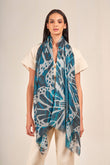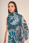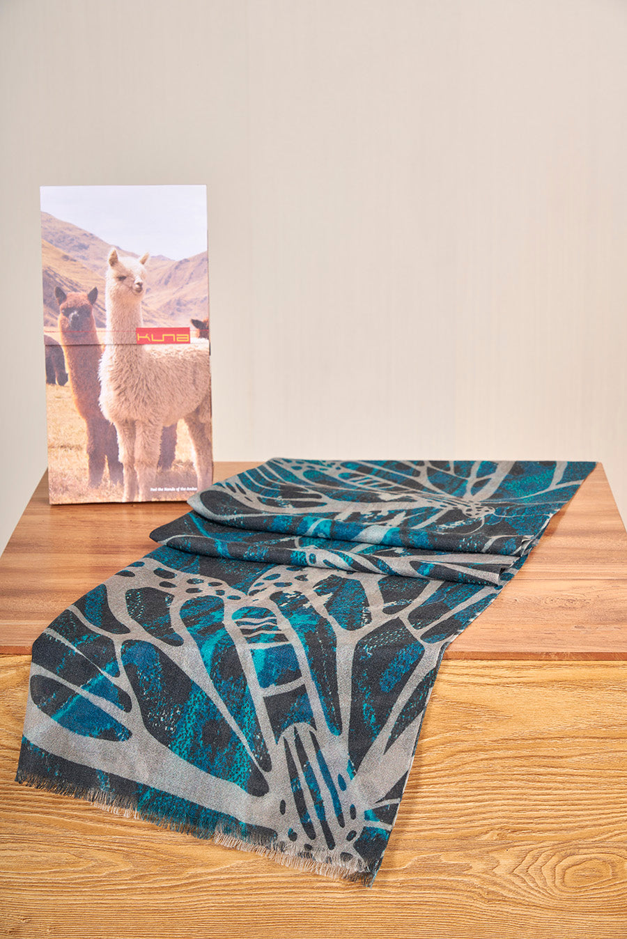Hermosa estola con la más exclusiva fibra de baby alpaca con seda. Cuenta con patrones de mariposa en tonos fríos. Perfecta para complementar cualquier tenida. | Material predominante: Baby Alpaca