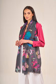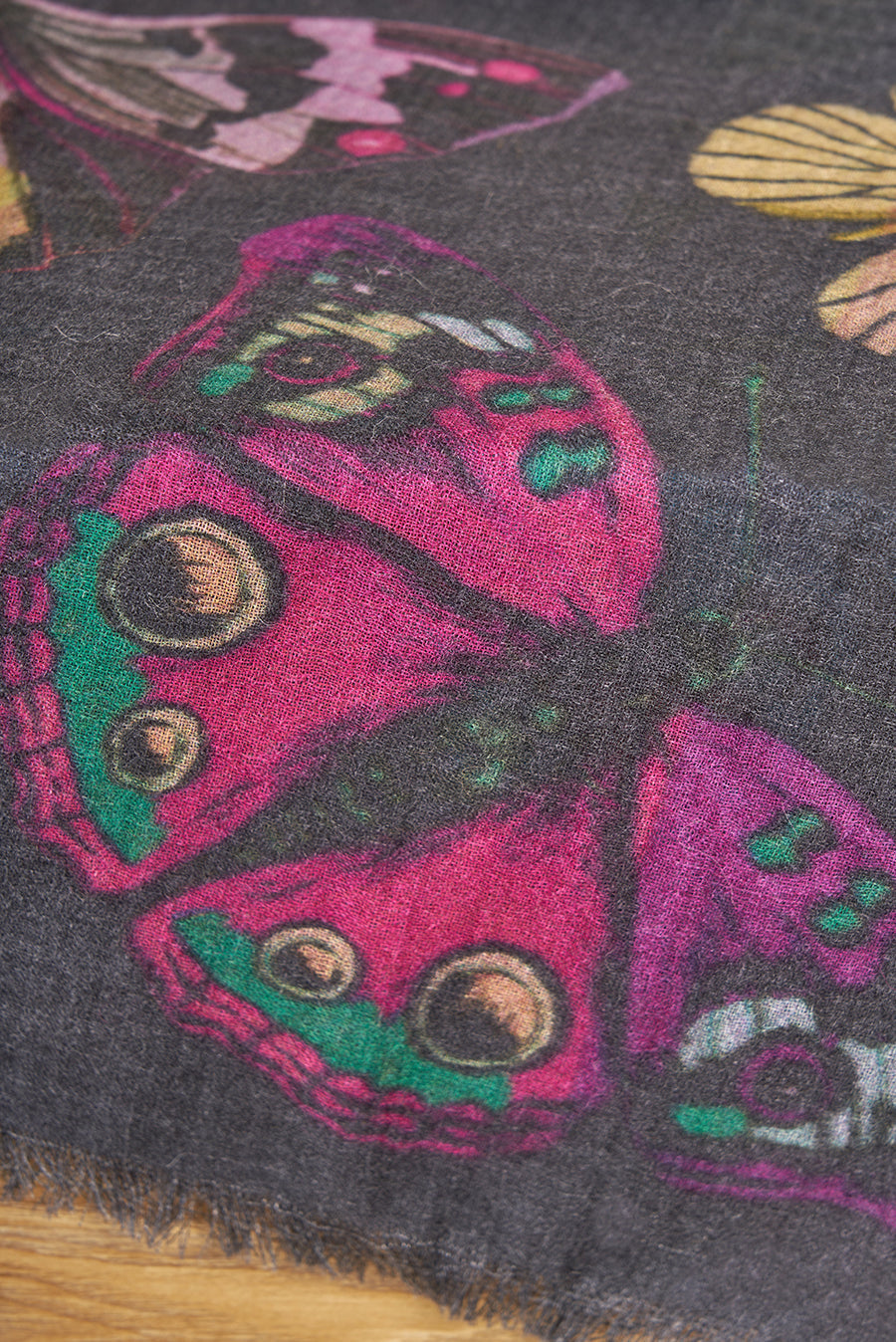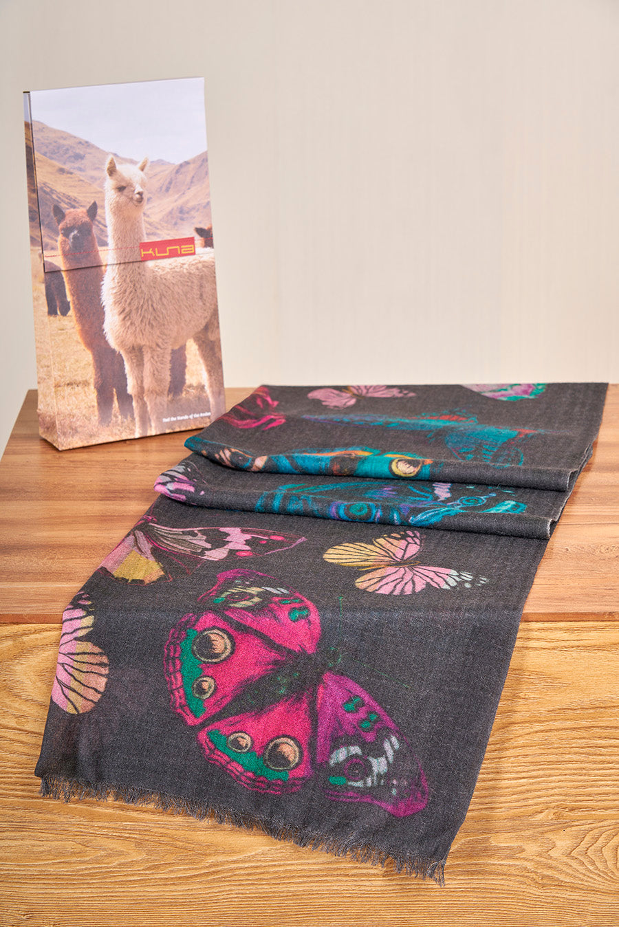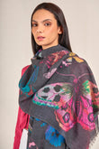 Las más suaves fibras de baby alpaca con seda en nuestra estola Vico. Una prenda que tiene como color base el negro. Cuenta con estampado de mariposas de colores vibrantes, el cual resalta y le da un toque único. | Material predominante: Baby Alpaca