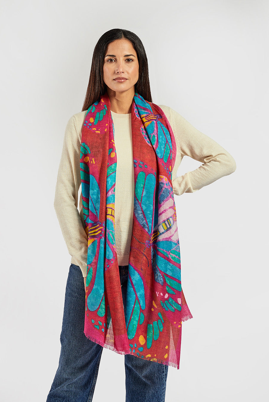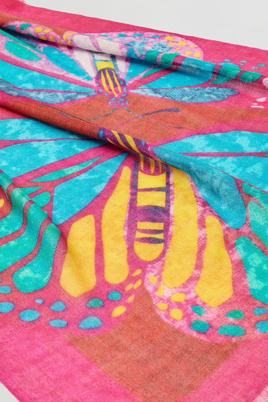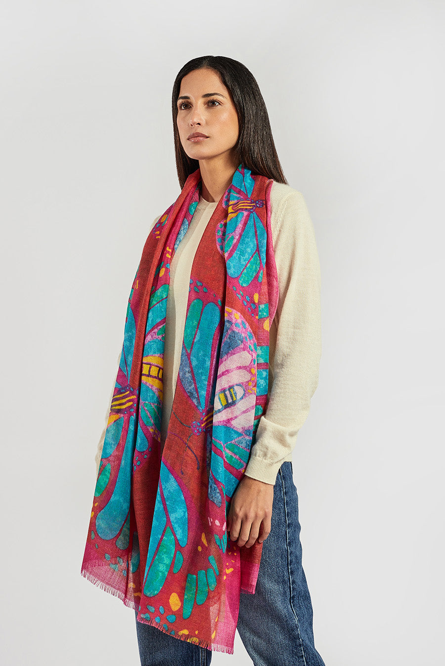 Estola exclusiva de la colección con las fibras más suaves de baby alpaca con seda. Tiene un estampado único de mariposas con una paleta en colores cálidos vibrantes. | Material predominante: Baby Alpaca