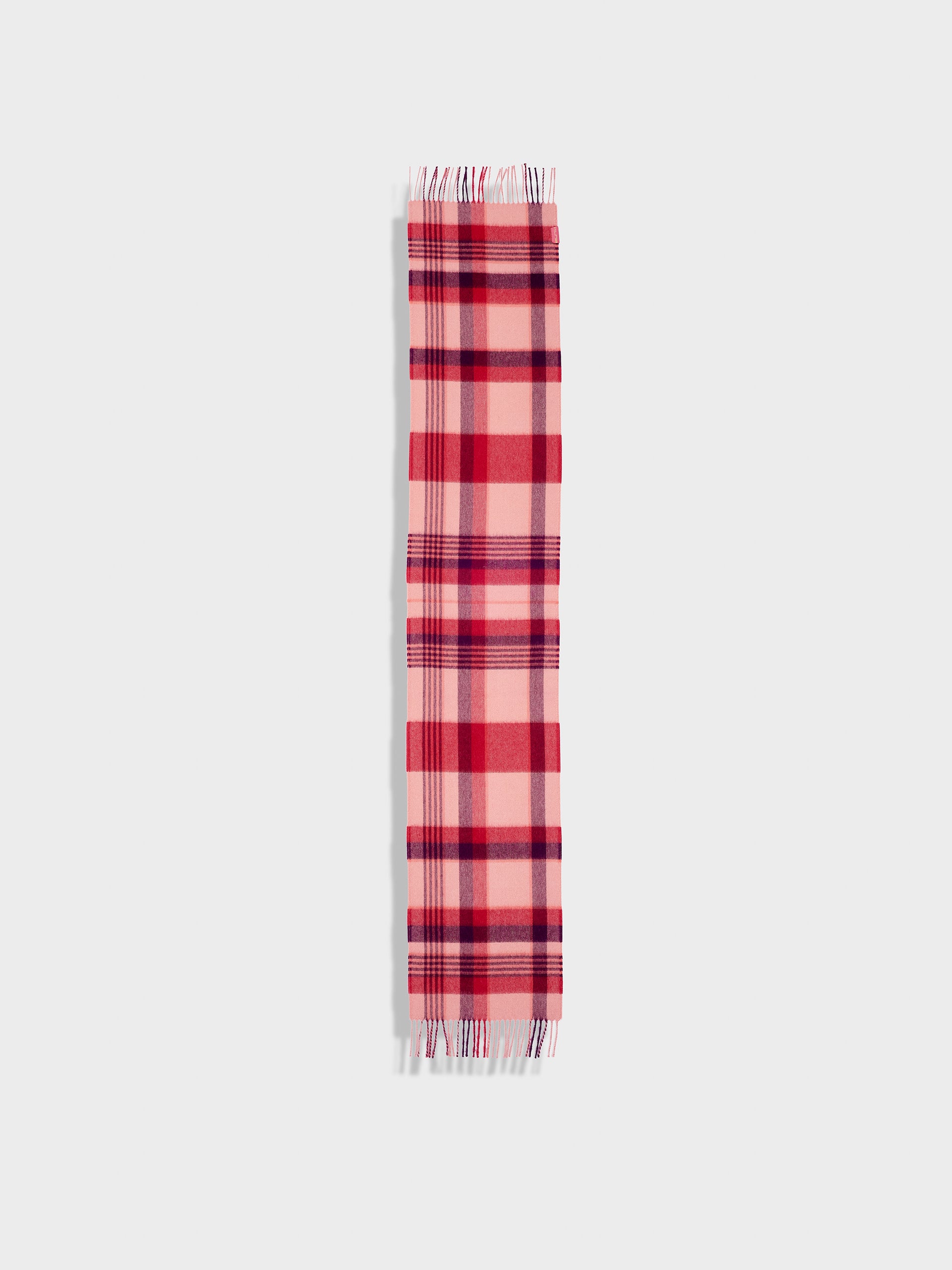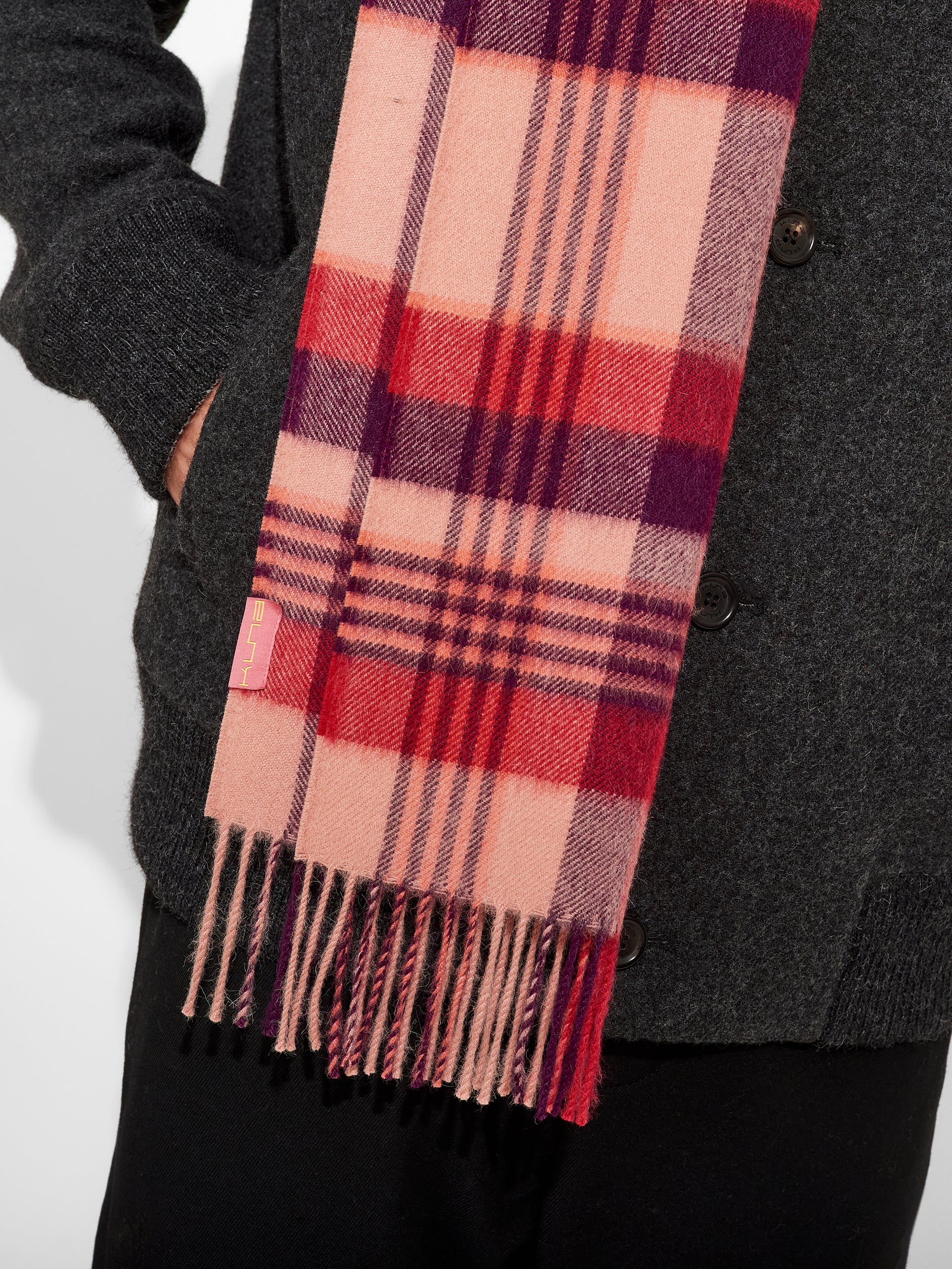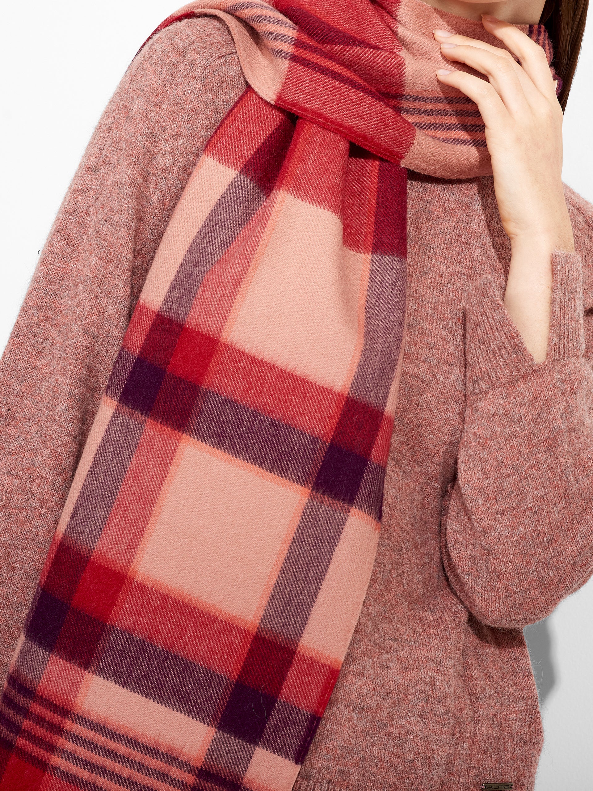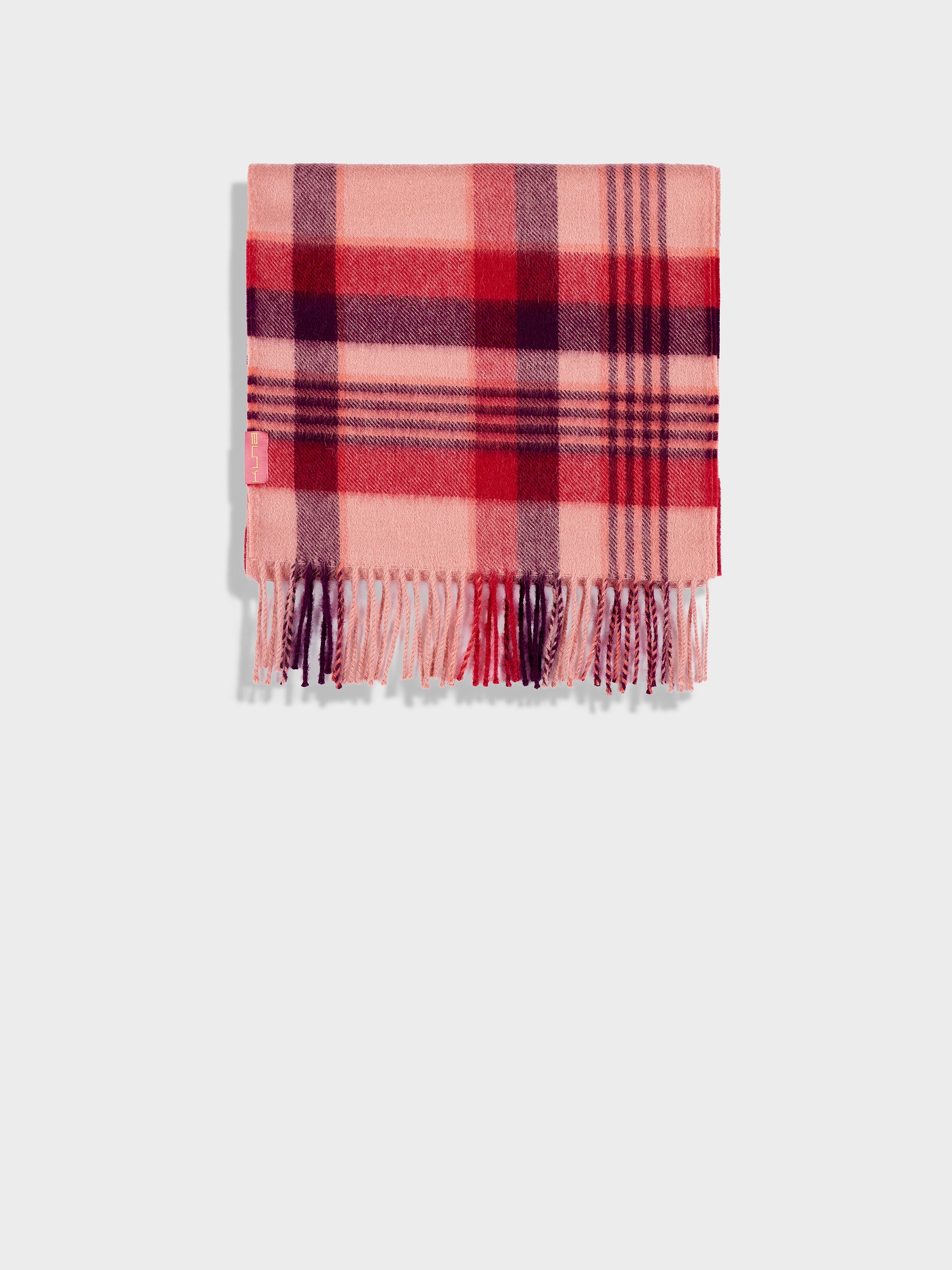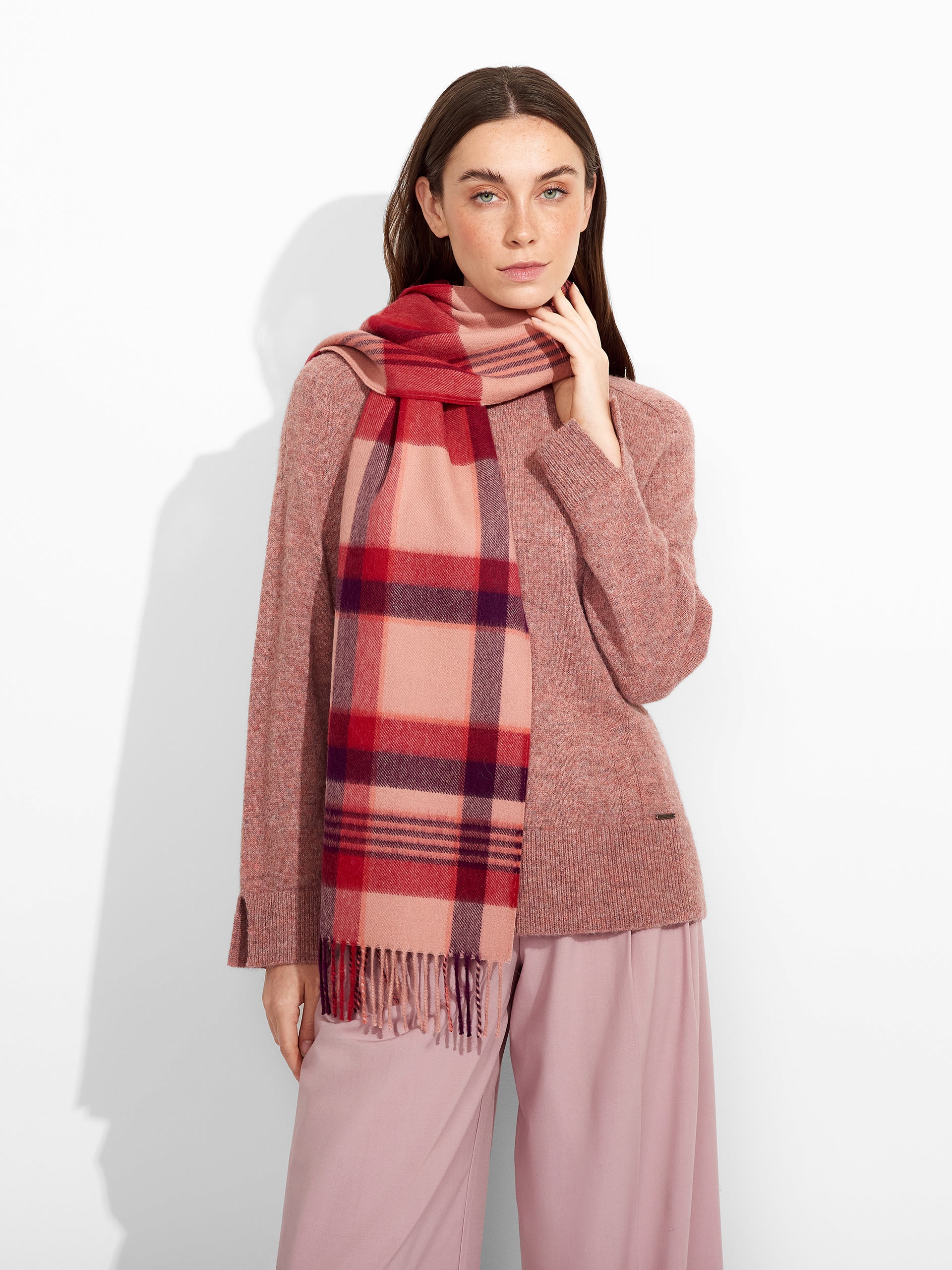 Ratti Scarf in pink tone, featuring a checkered pattern. The fringed edges add movement and texture. Crafted from baby alpaca, it stands out for its warmth and exceptional softness. | Predominant material: Baby Alpaca