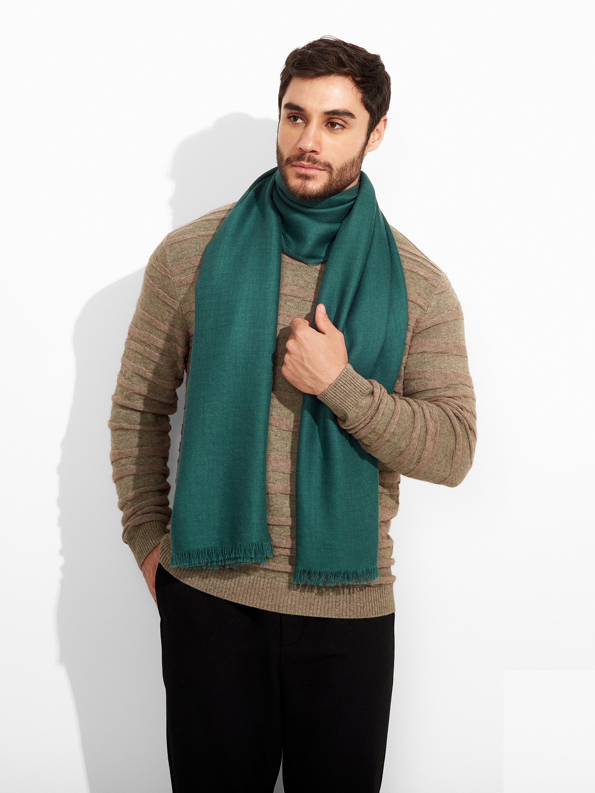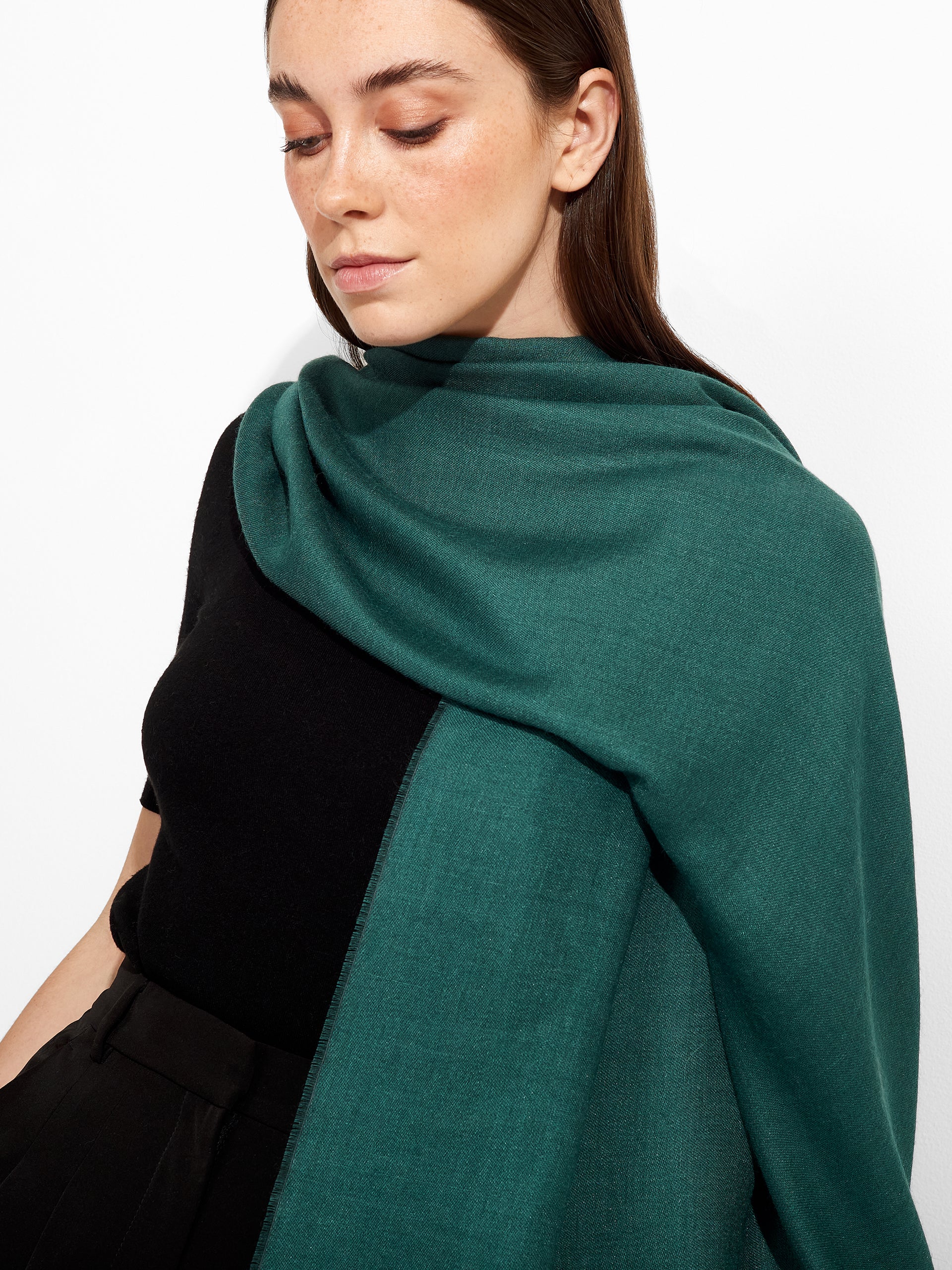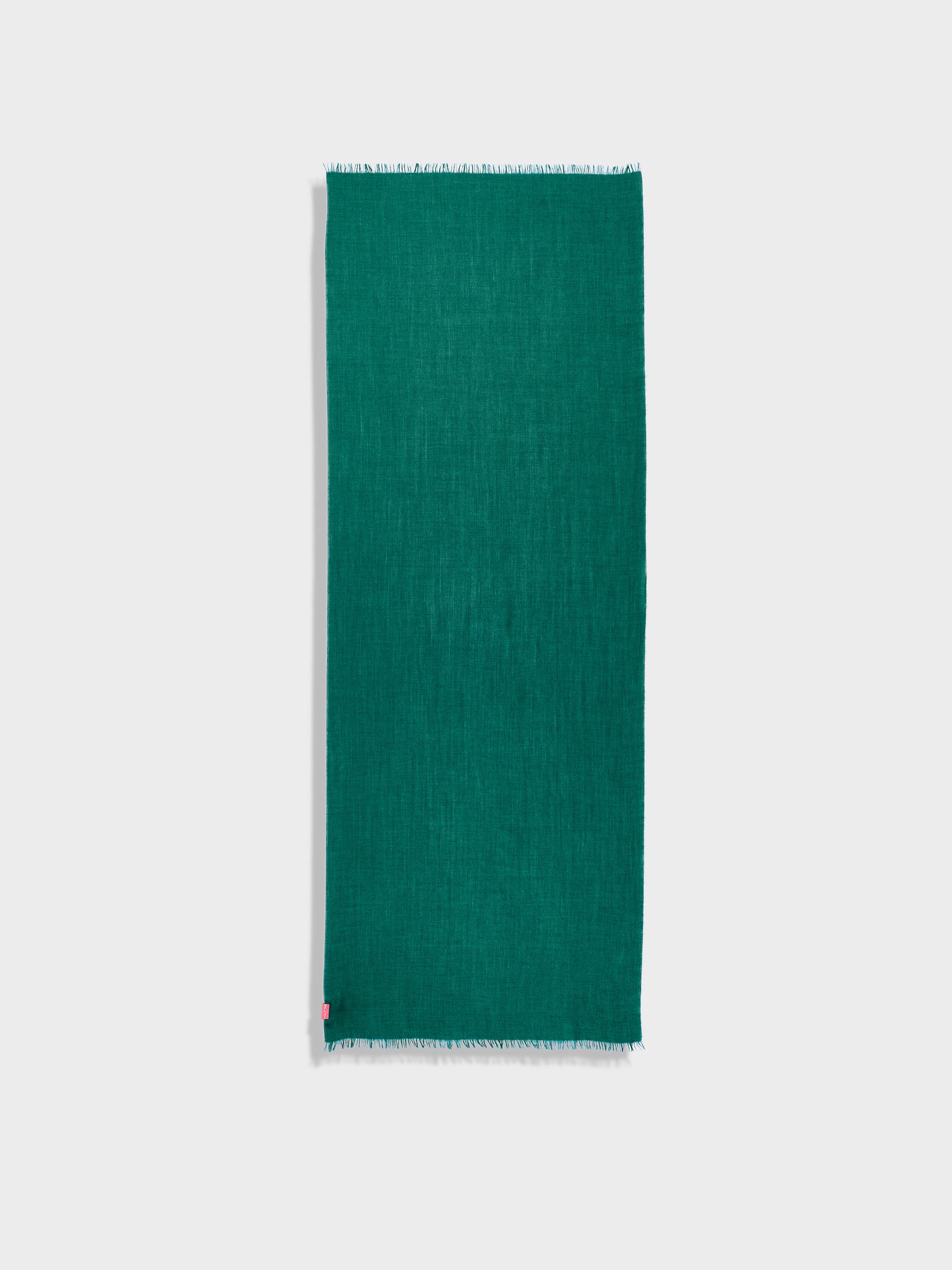 Teaberry Stole in green tone, featuring a solid color and fine fringed edges that provide a delicate finish. Crafted from baby alpaca and silk. | Predominant material: Baby Alpaca