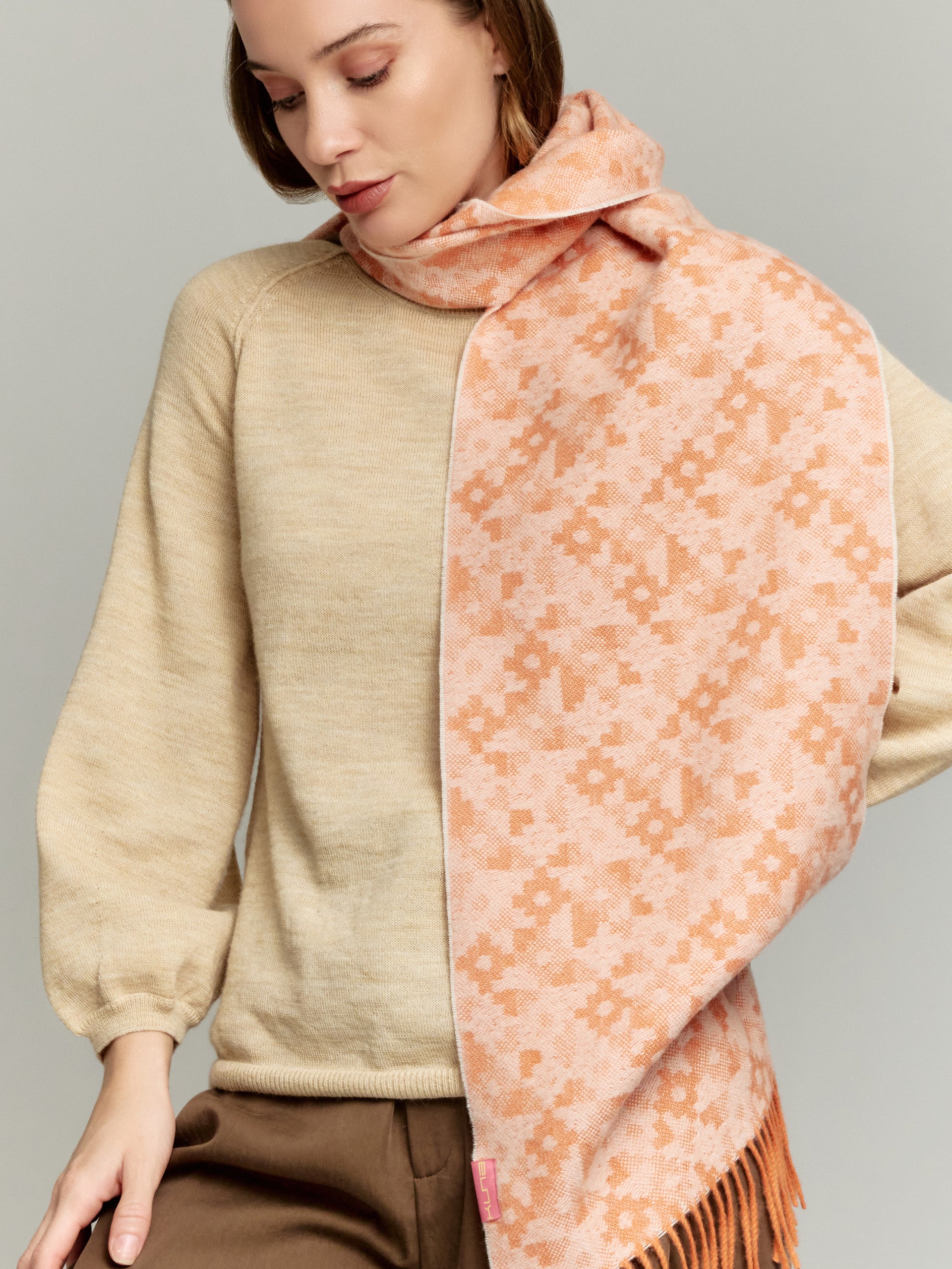 The Yldis scarf stands out for its boldness, urban style and original patterns. Perfect for adding a touch of personality to any outfit. Made of 100% baby alpaca and available in three warm colors, it is the ideal choice for those looking to stand out with elegance and sophistication. | Material predominante: Baby Alpaca