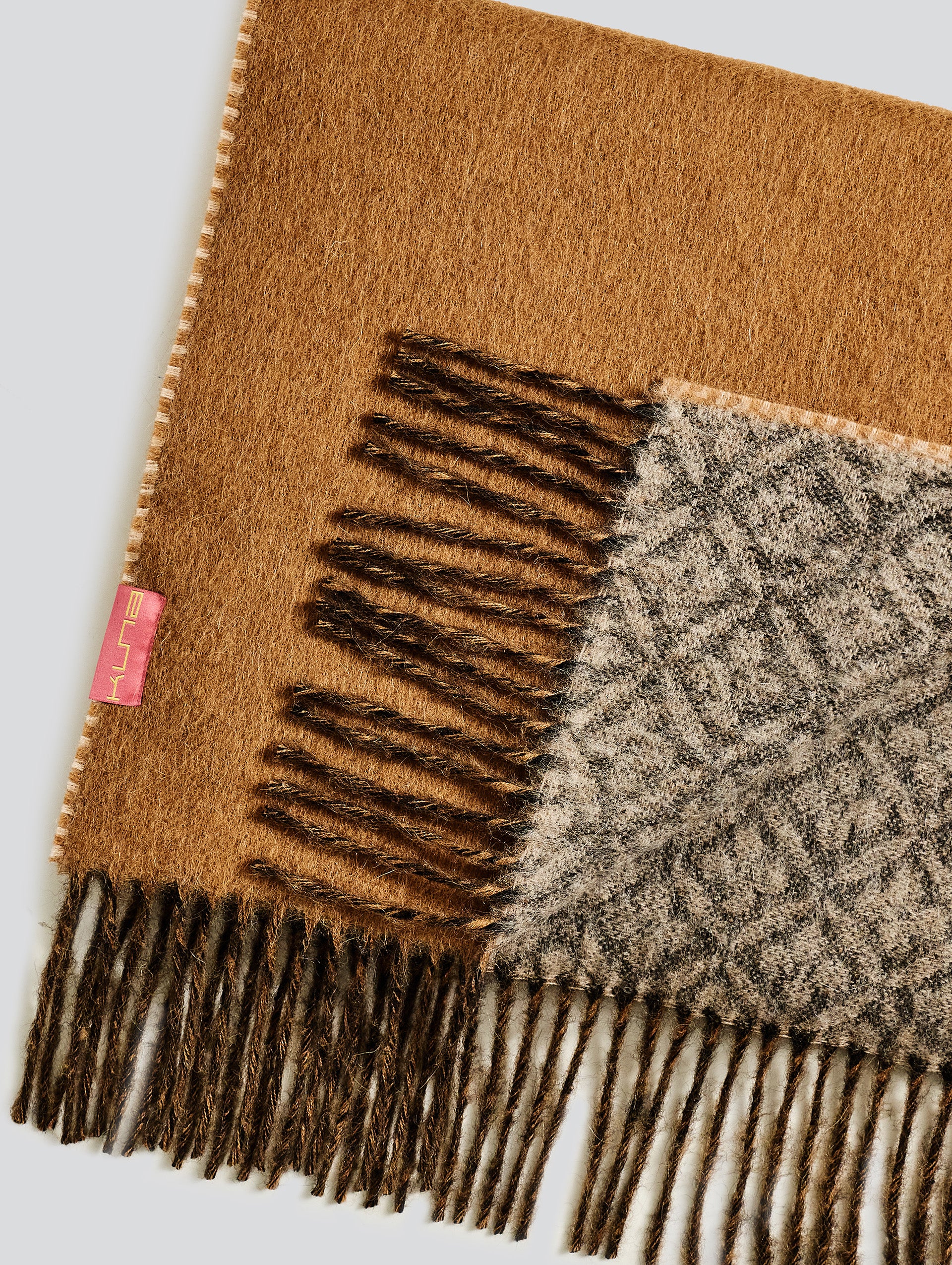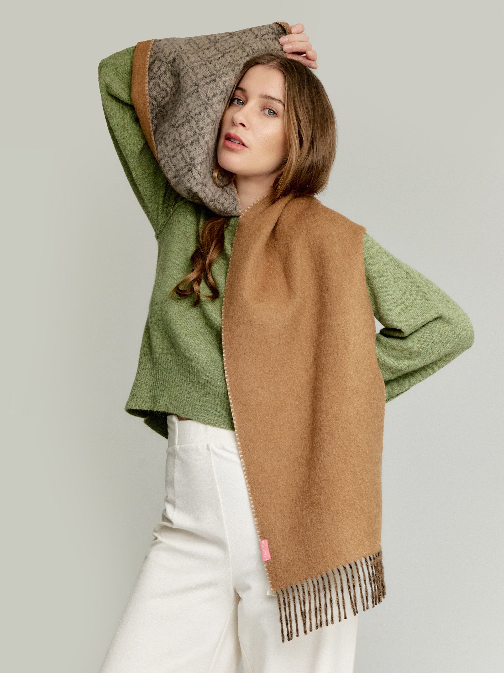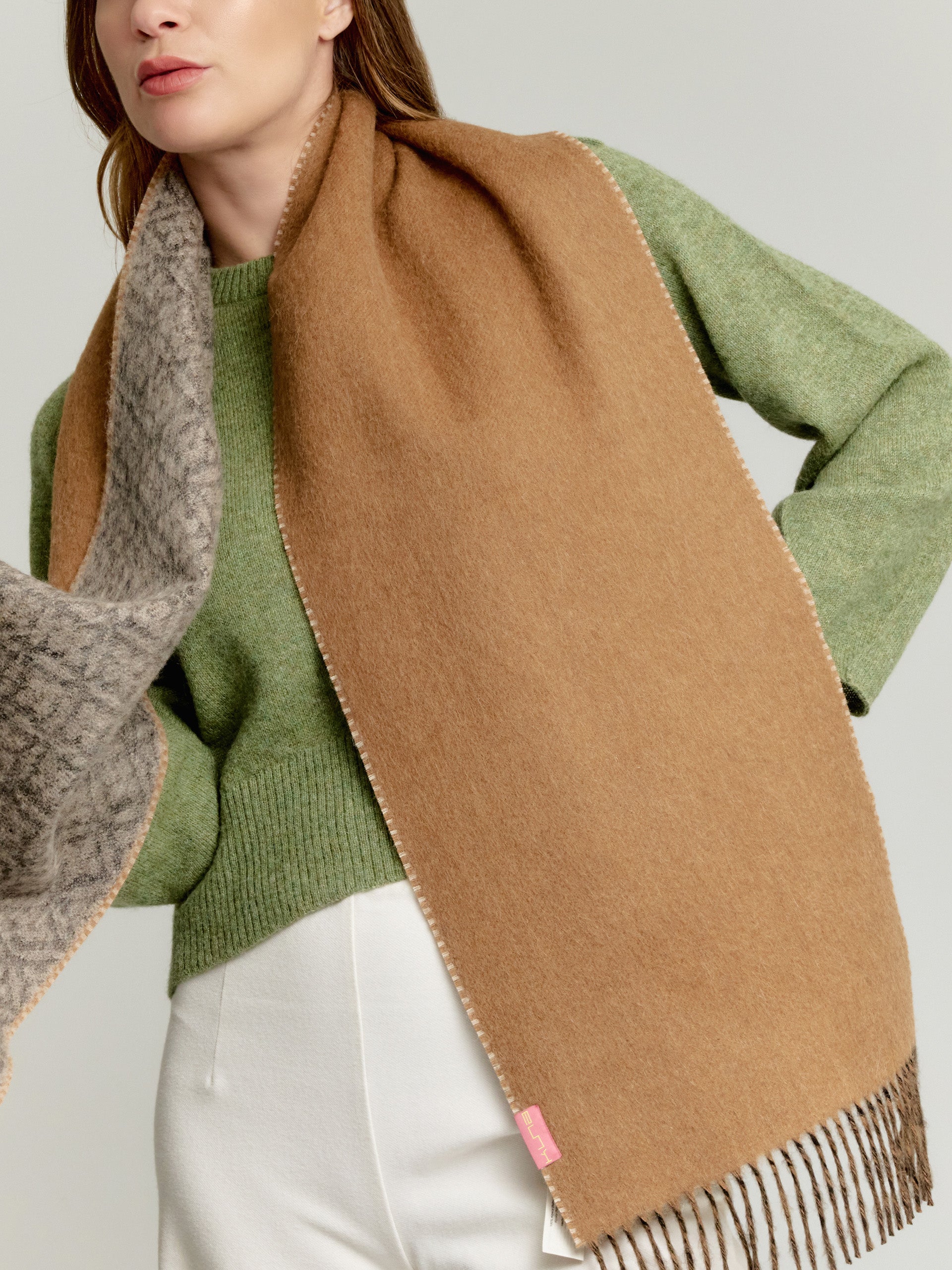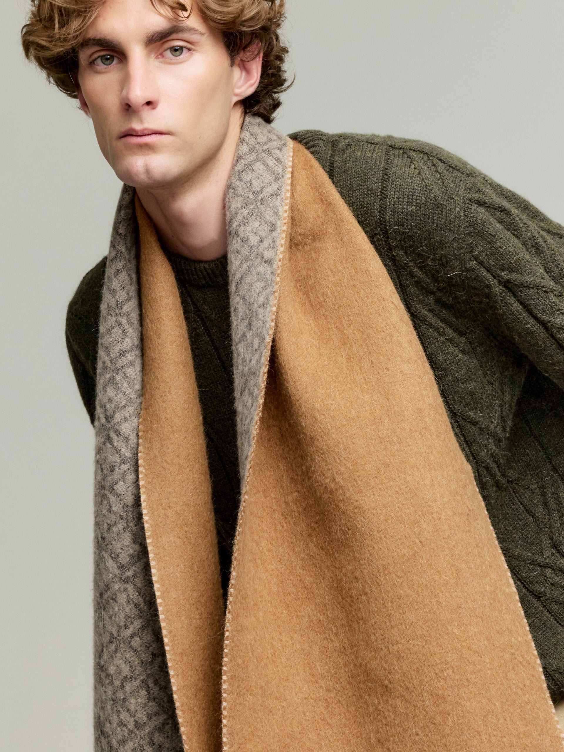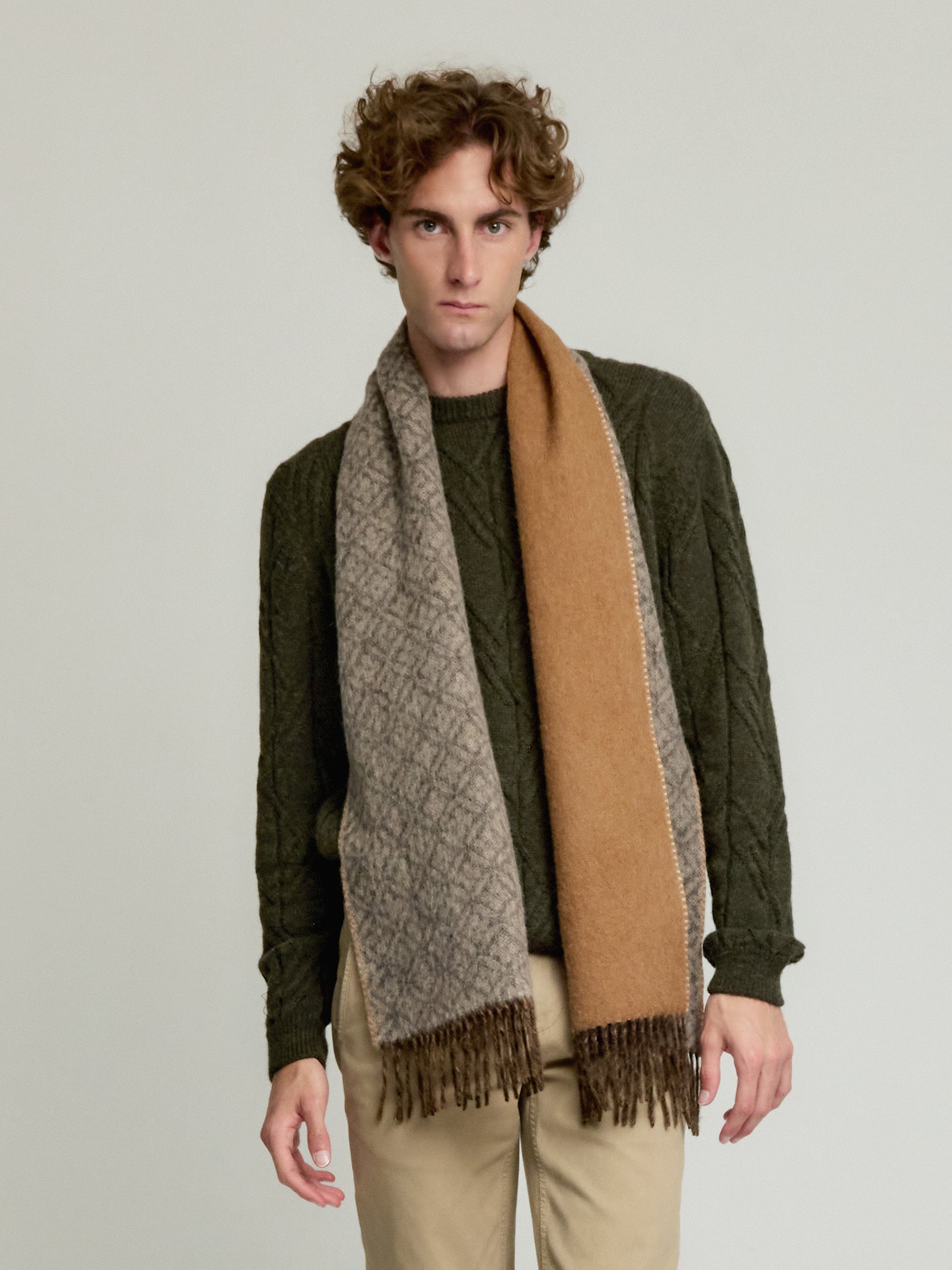 Discover the reversible scarf of 100% baby alpaca. Available in a variety of colors, it is the ideal complement for any occasion. With one solid color side and one patterned side, it is incredibly versatile. Add style and warmth to your outfit with this charming scarf! | Material predominante: Baby Alpaca