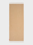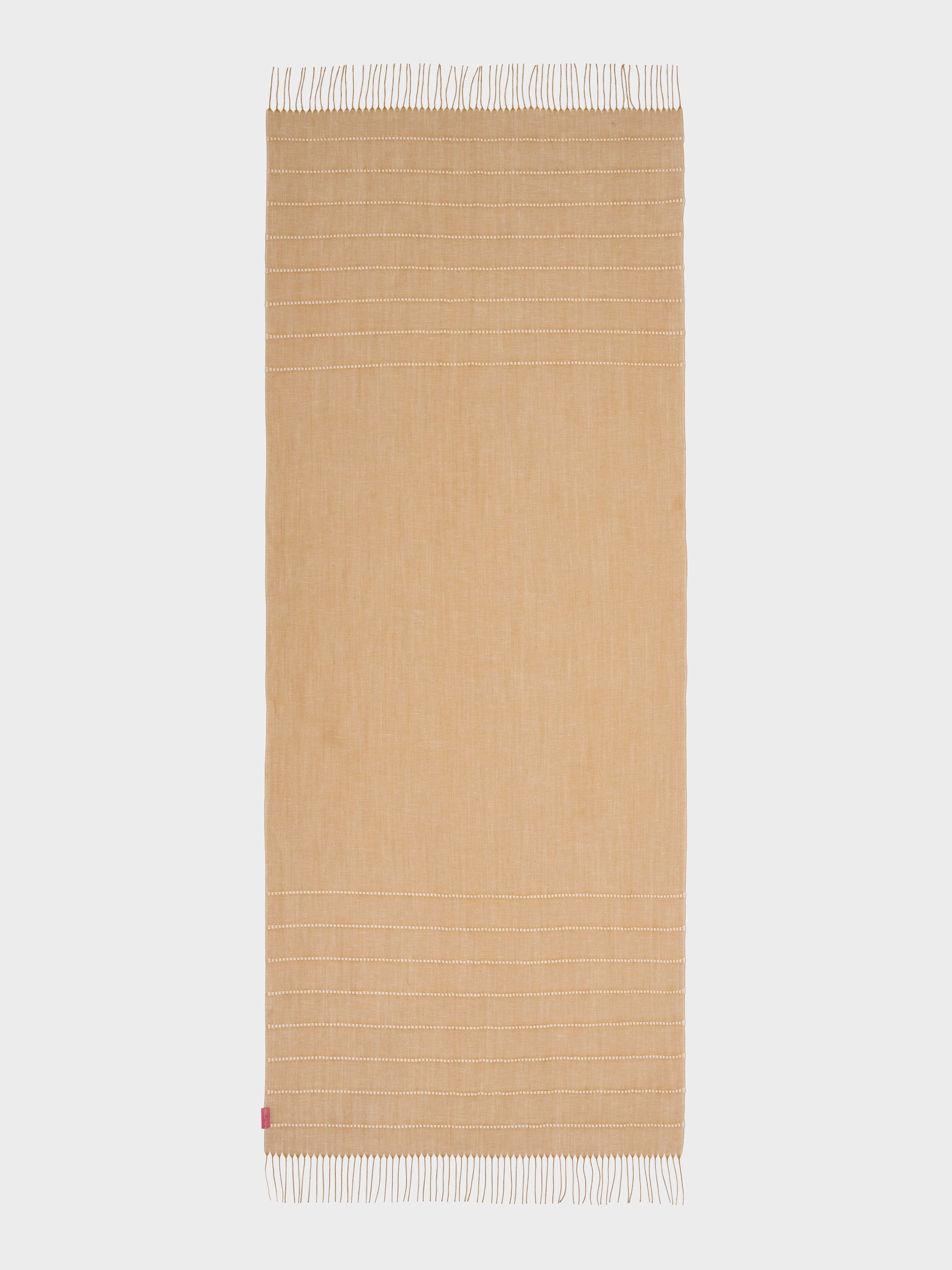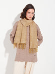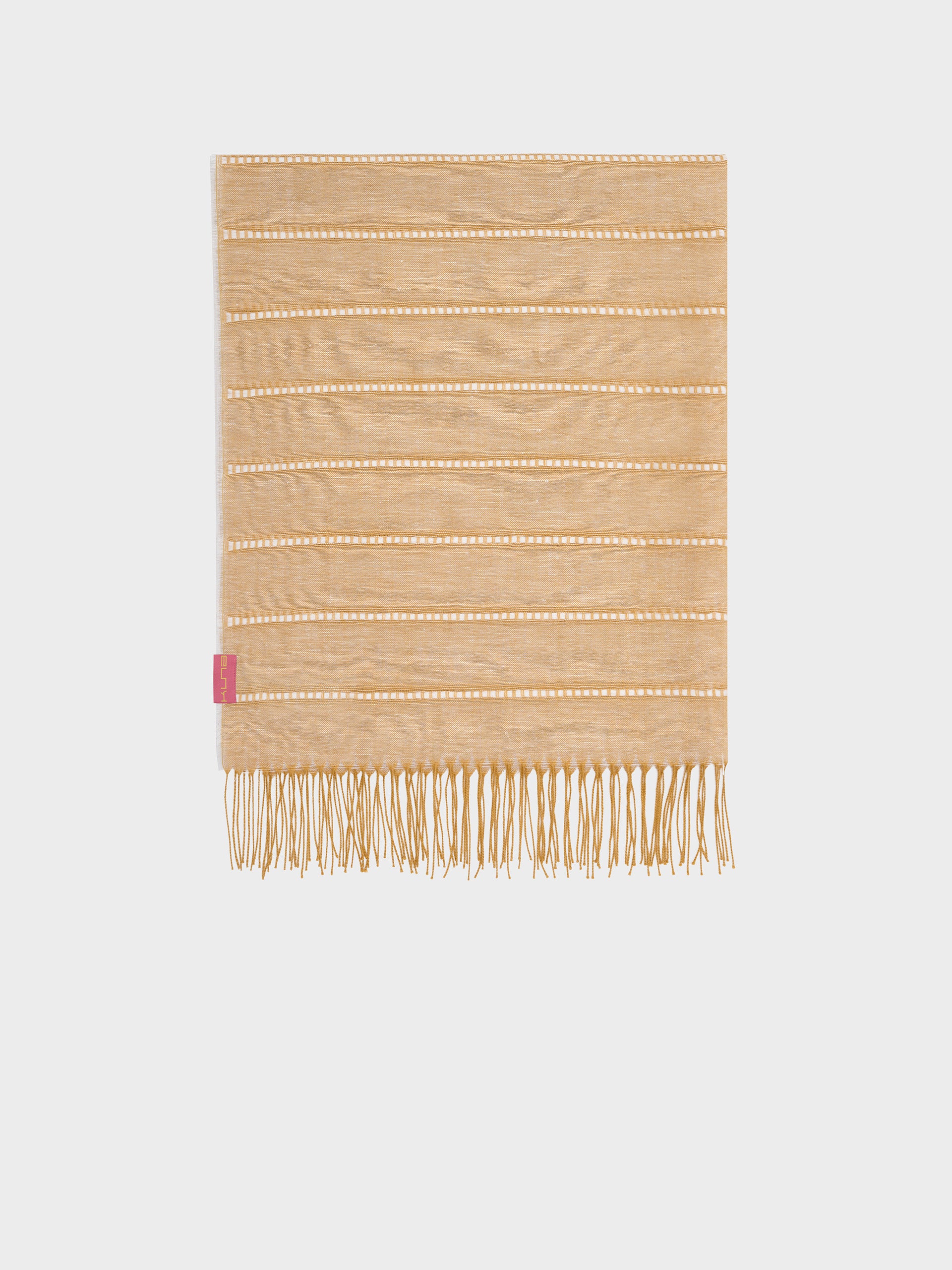Zabila stole in yellow, made from baby alpaca, silk, and linen. It features horizontal lines in panama on a taffeta background and a frayed finish. Its light texture and striped design add a touch of distinction. | Predominant material: Linen