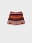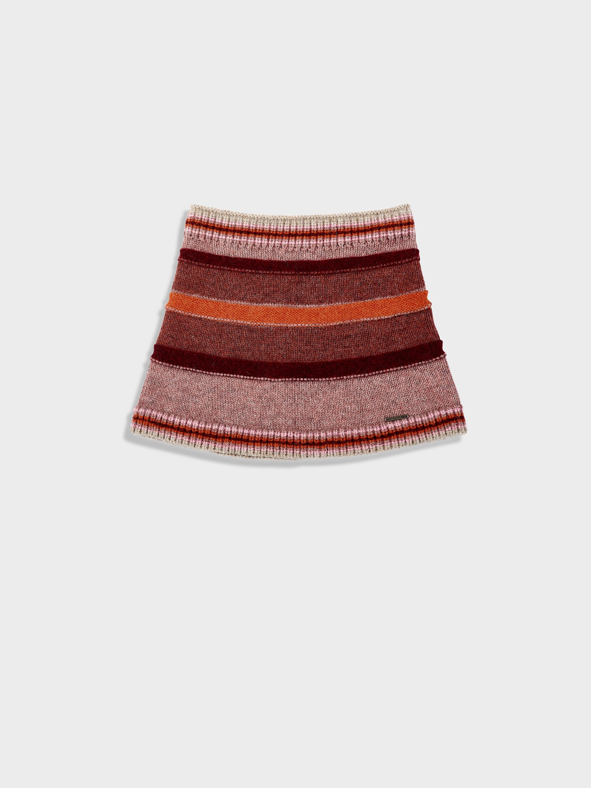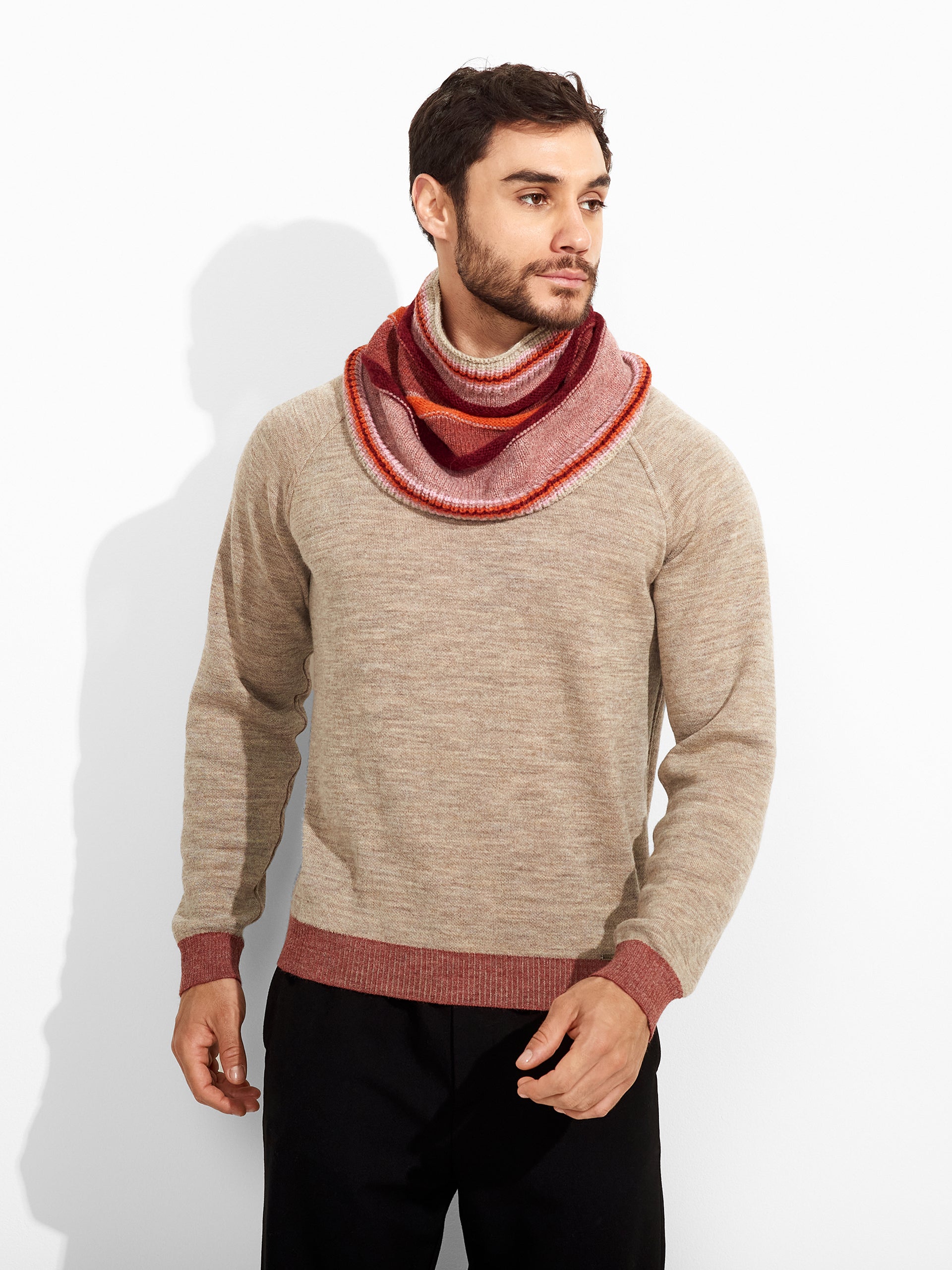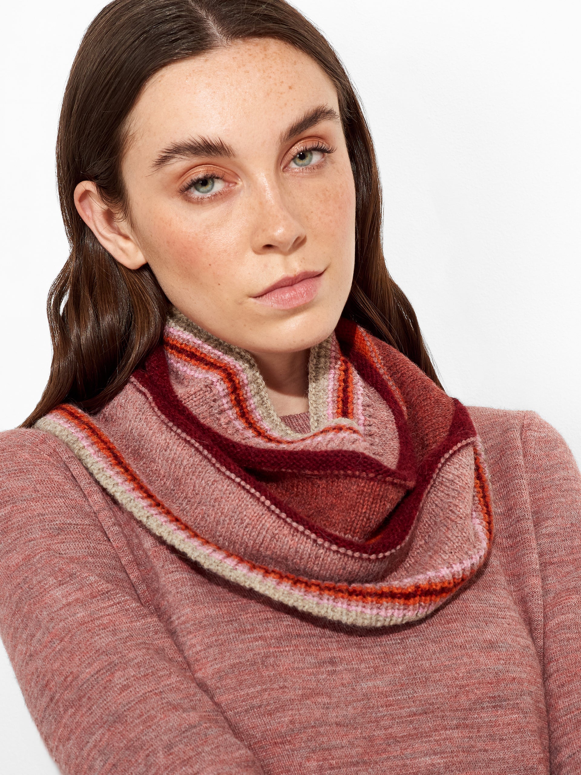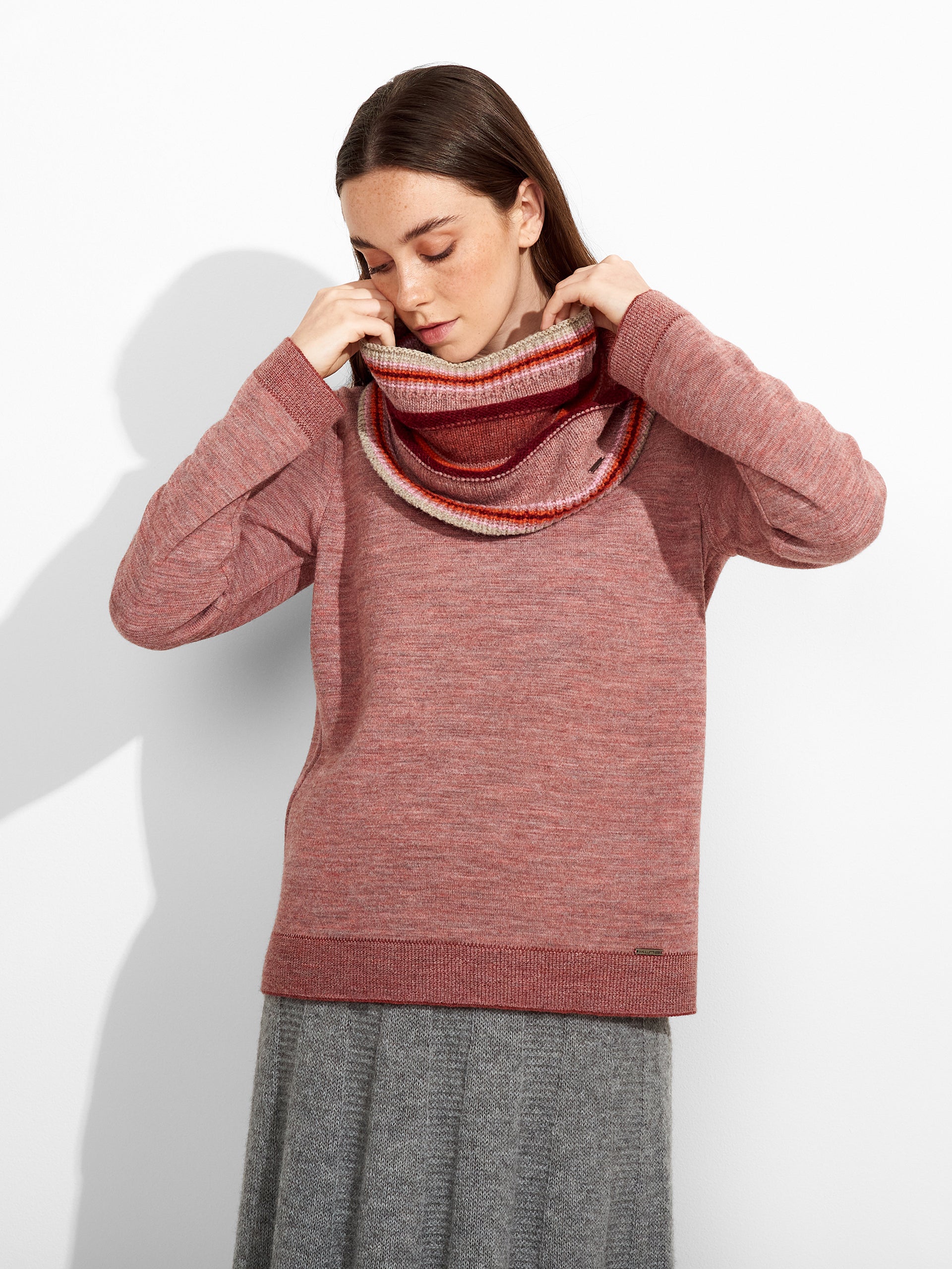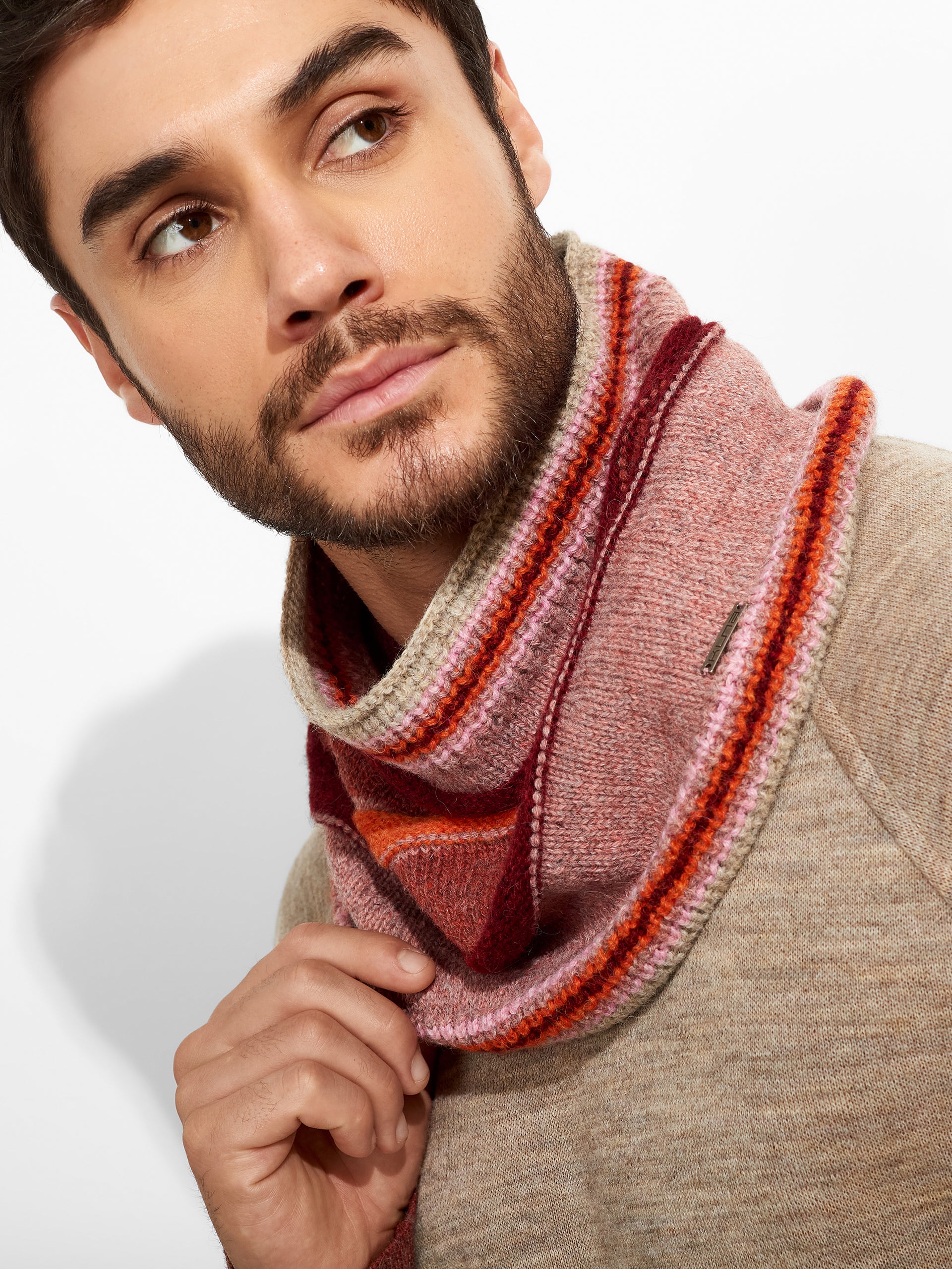 Zanni Knit Neckwarmer in pink tone, featuring horizontal stripes of varying widths. The defined edges complete its finish. Crafted from baby alpaca, it offers warmth and exceptional softness. | Predominant material: Baby Alpaca