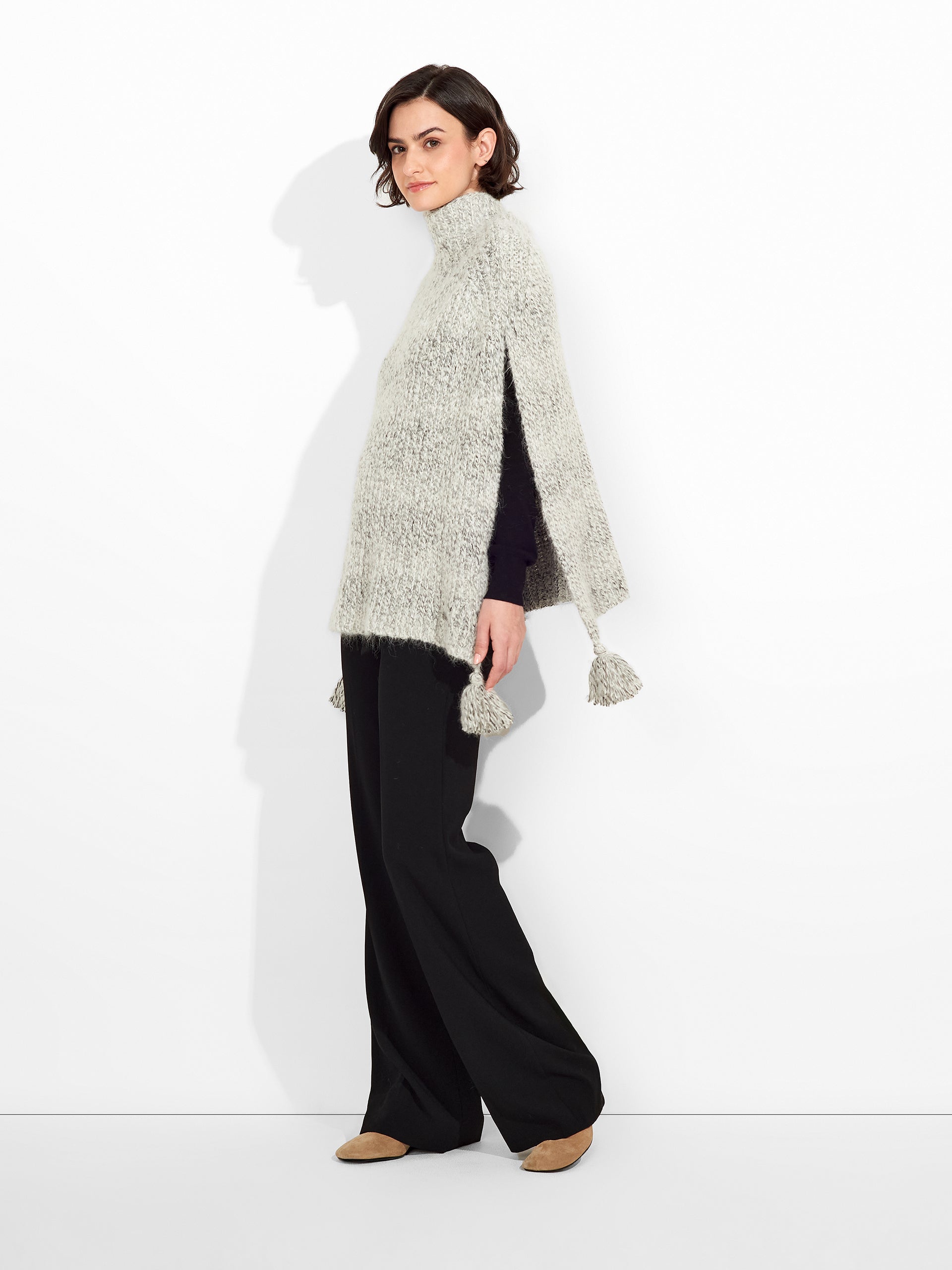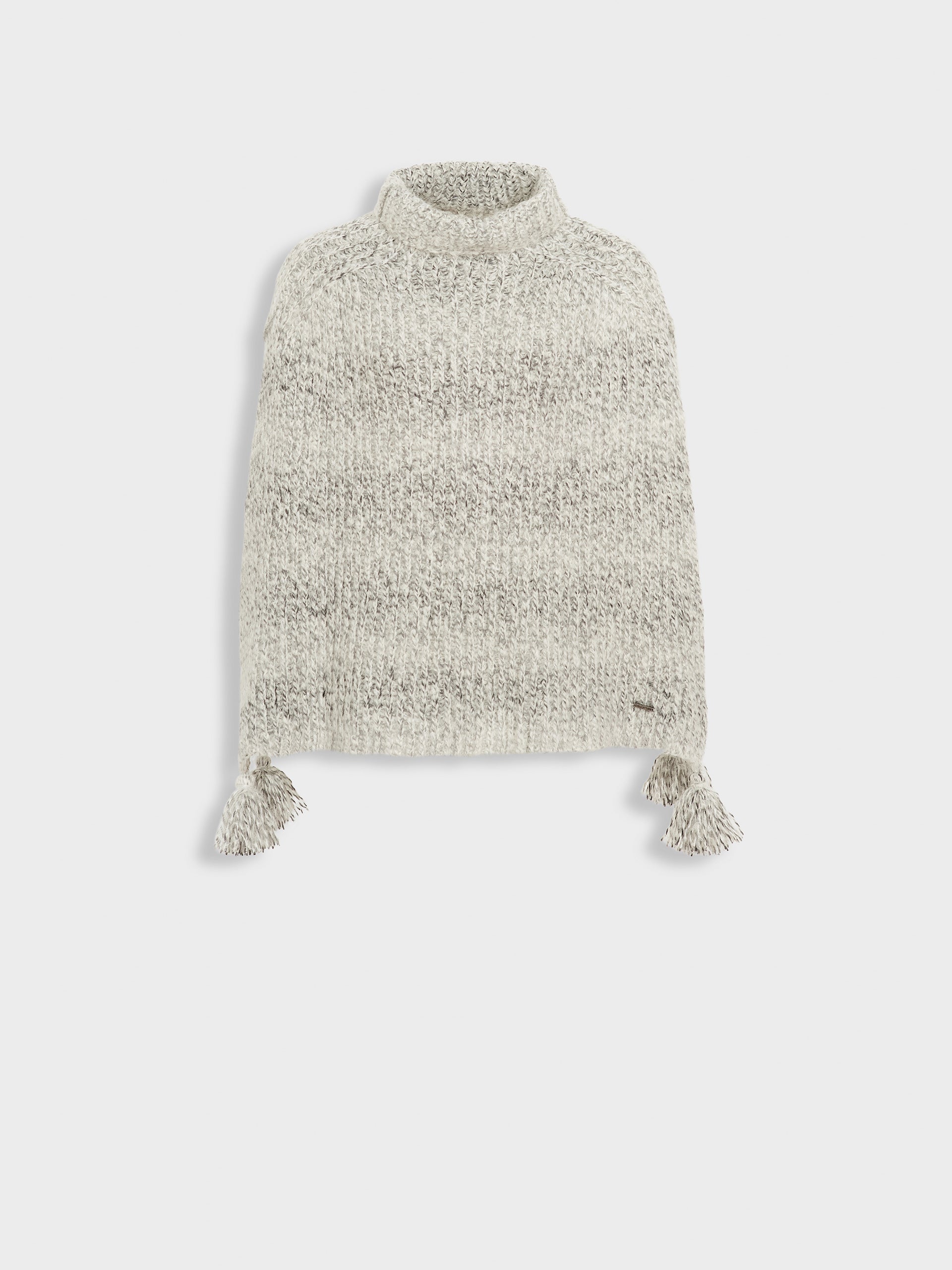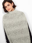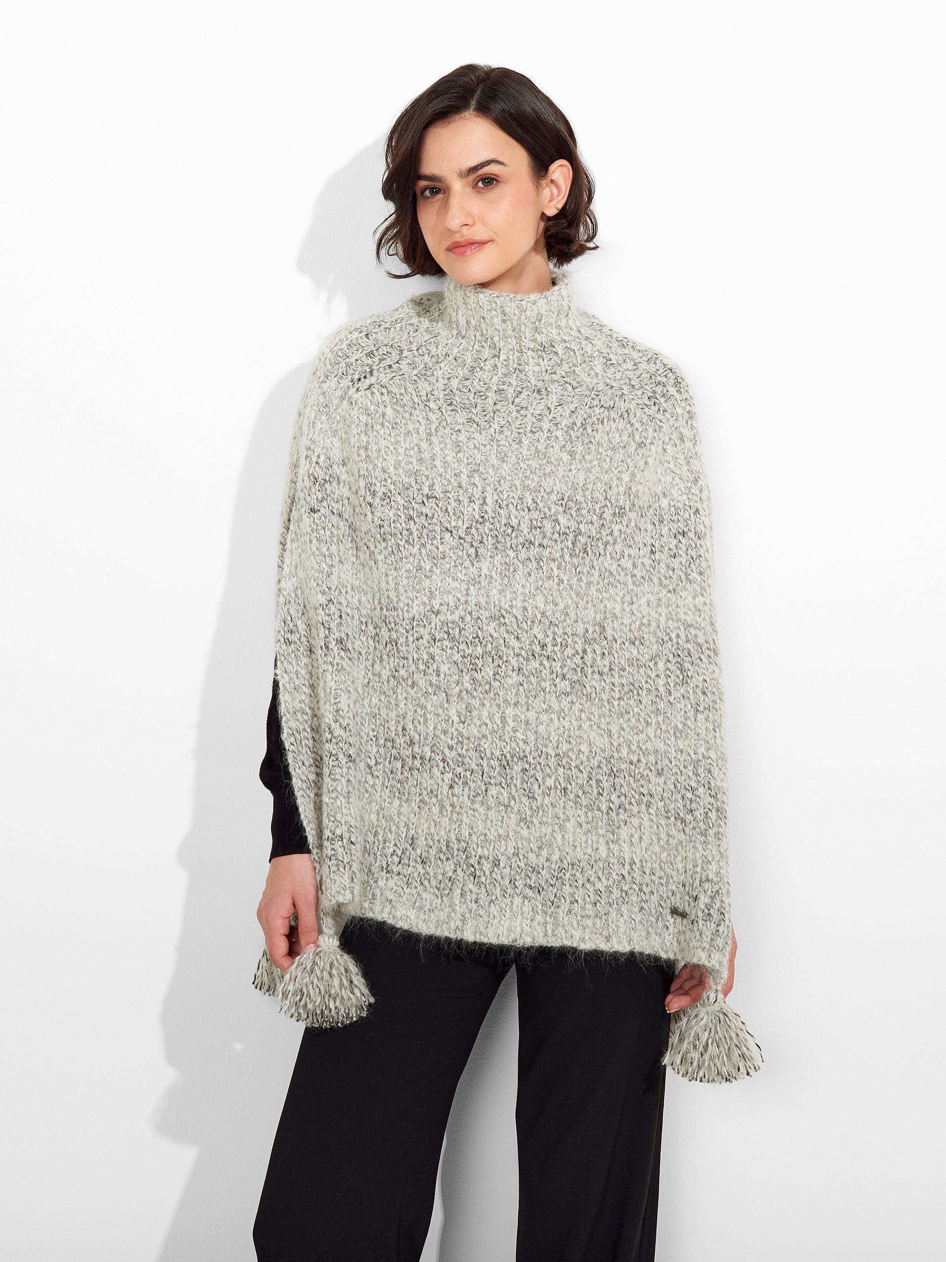 Zpazio Poncho in gray tone, with a loose design and high collar that adds warmth and style. It features decorative pom-poms. Crafted from a blend of suri alpaca, baby alpaca, and wool, it offers a warm and sophisticated texture. | Predominant material: Suri Alpaca