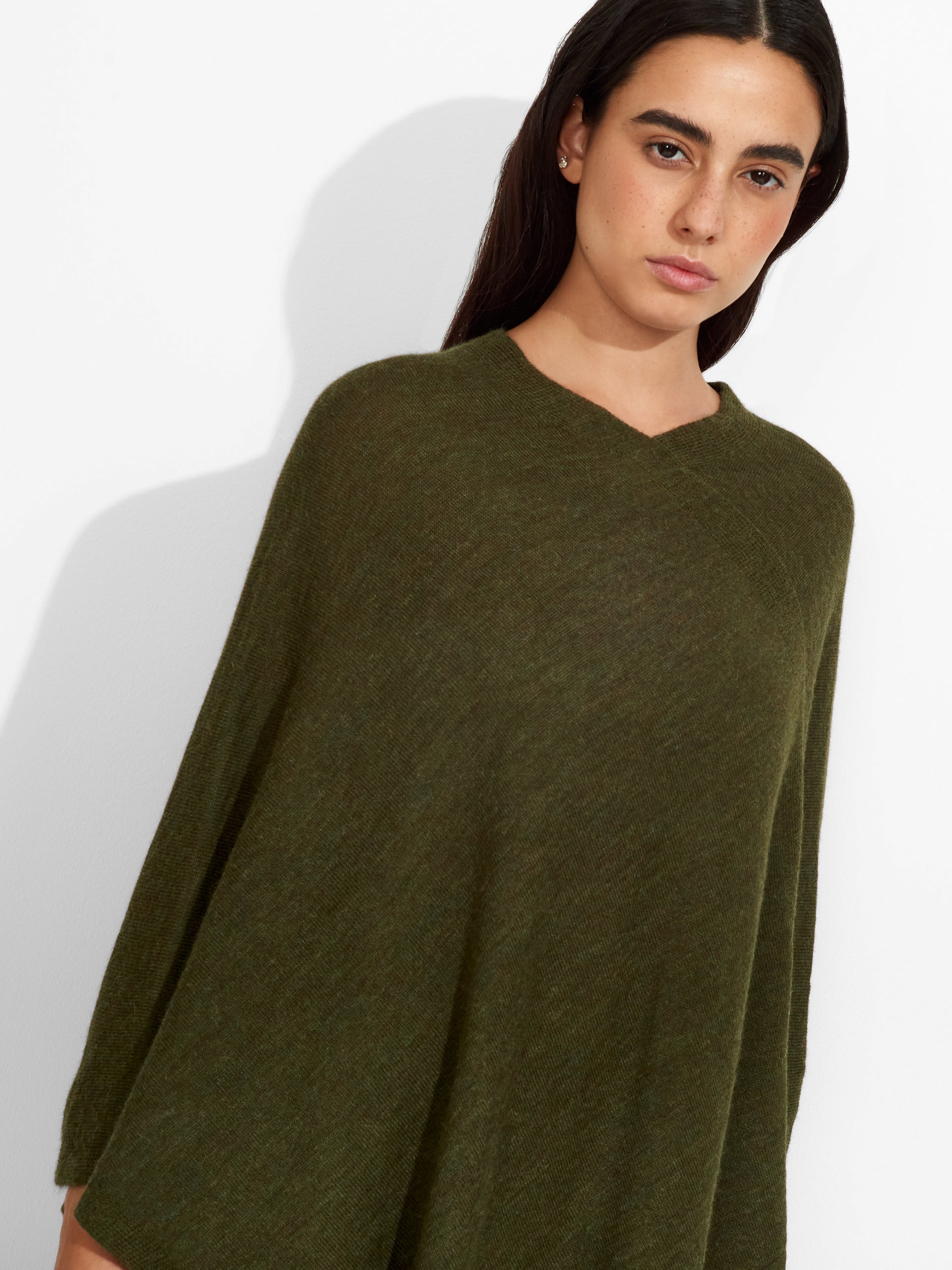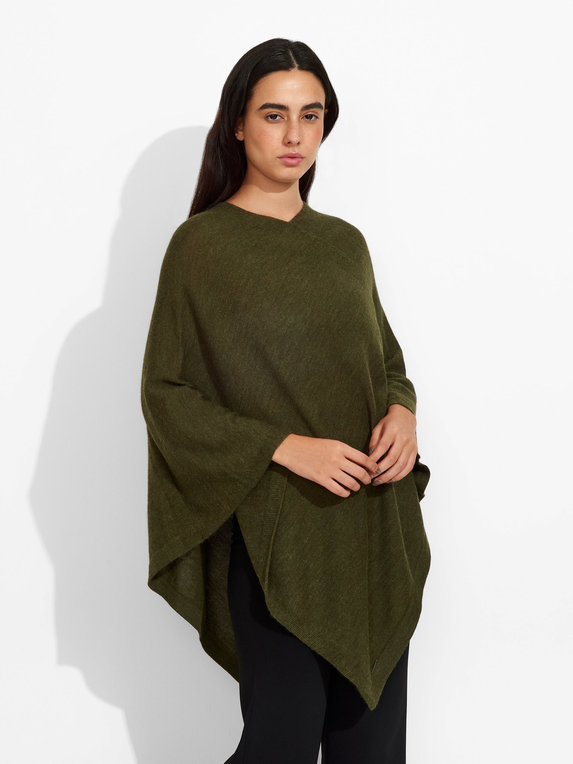 Almendra Poncho in green tone, in a solid color and loose silhouette, featuring a design with pointed finishes at the front and back. Crafted from baby alpaca, it offers warmth and softness. | Predominant material: Baby Alpaca