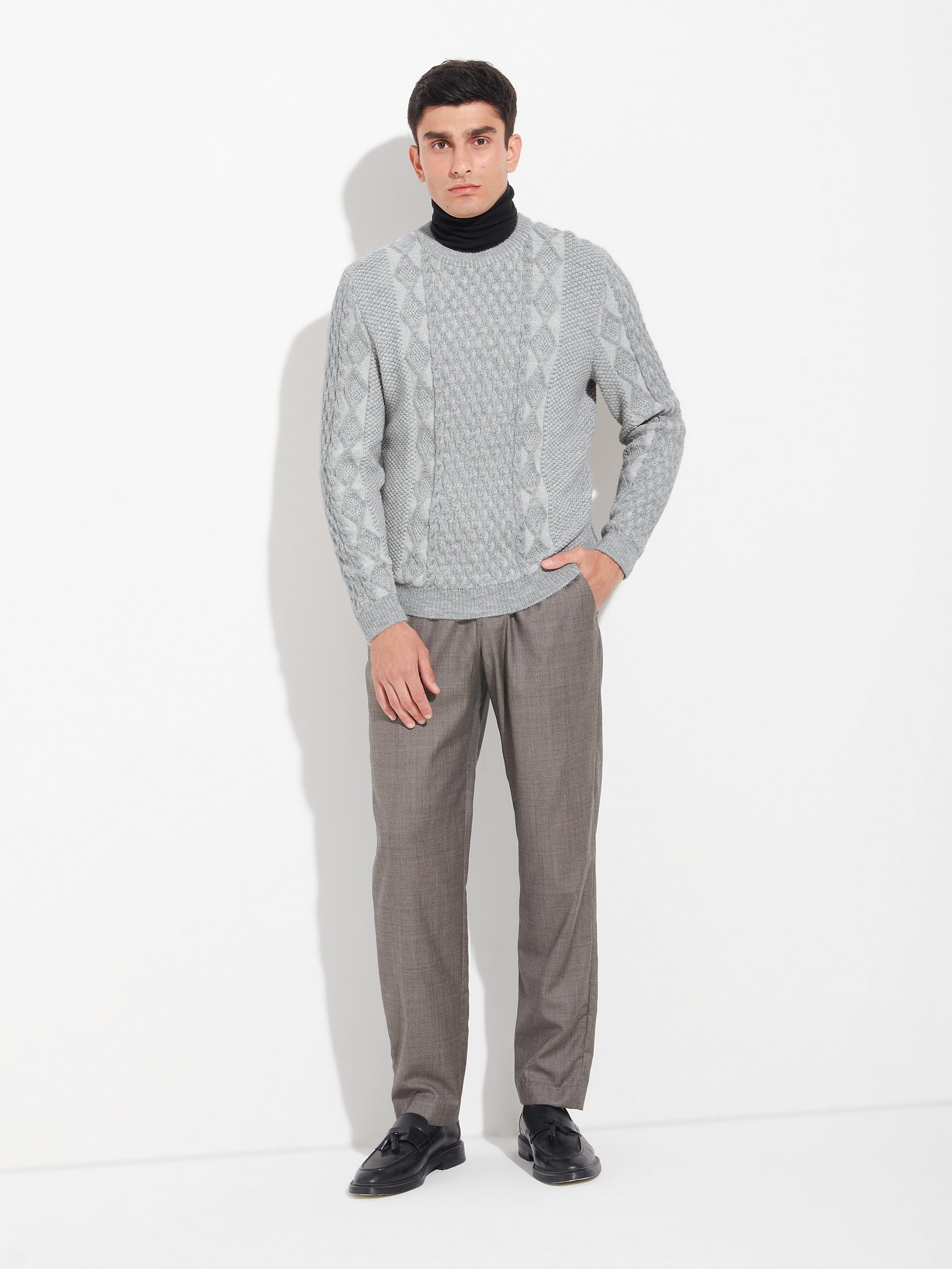Bastian sweater in gray, with a round neck and tailored armholes for a defined fit. Made from 100% RAS baby alpaca and woven with two-color braids that enhance its design with contrast and texture. | Predominant material: Baby Alpaca