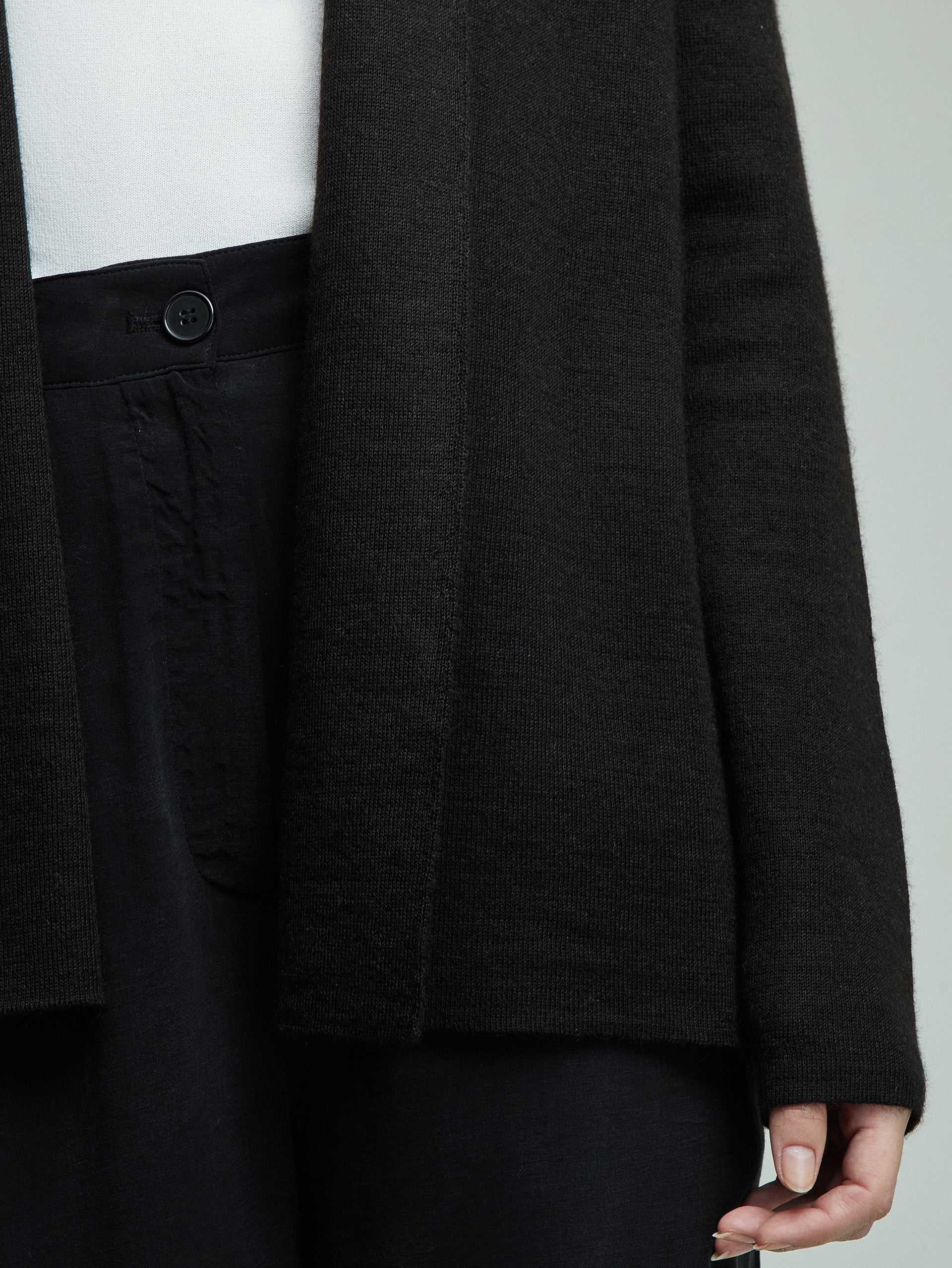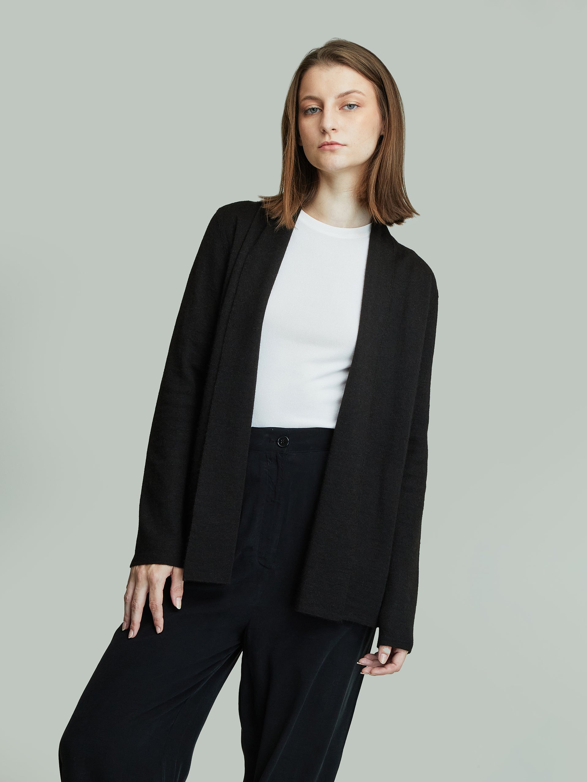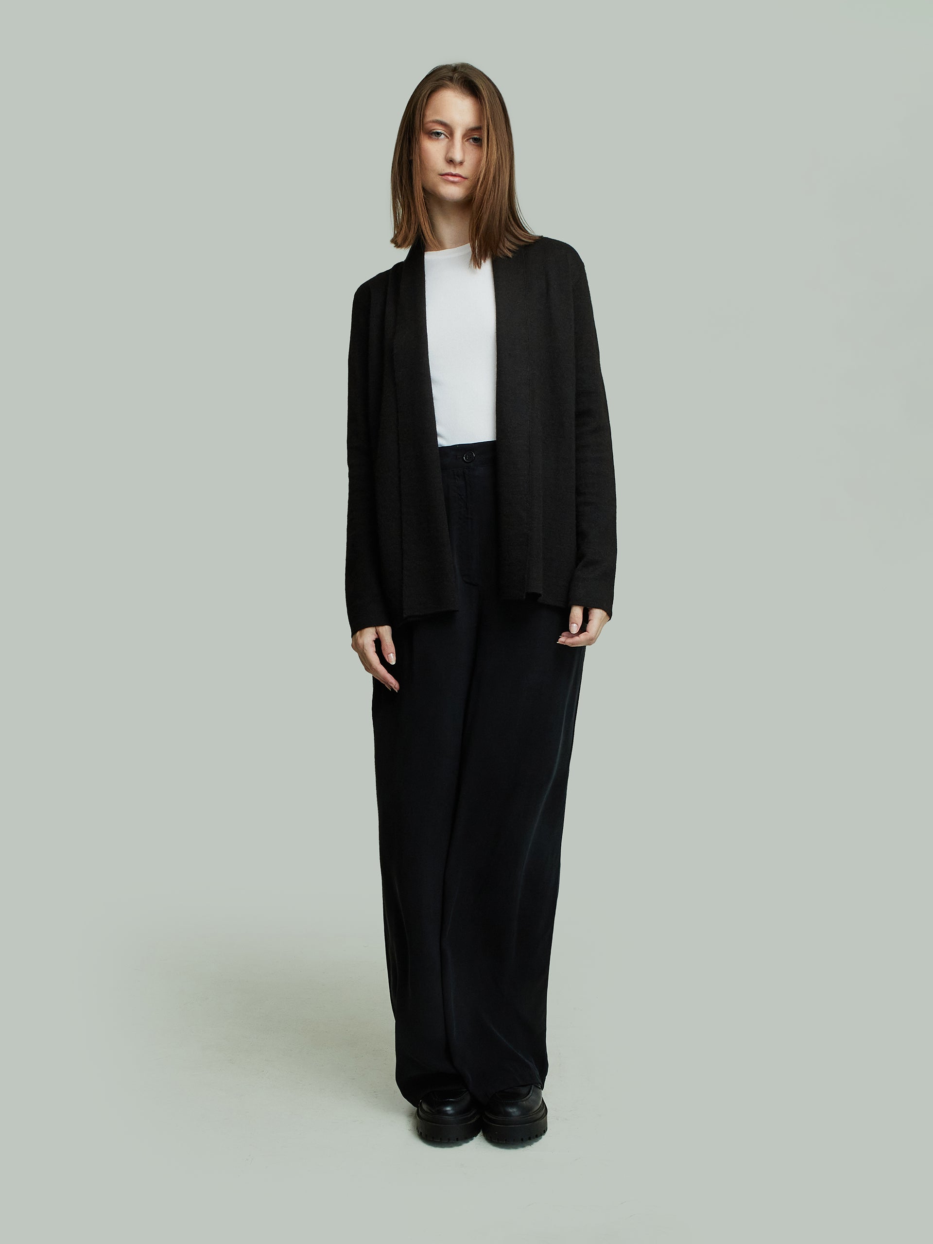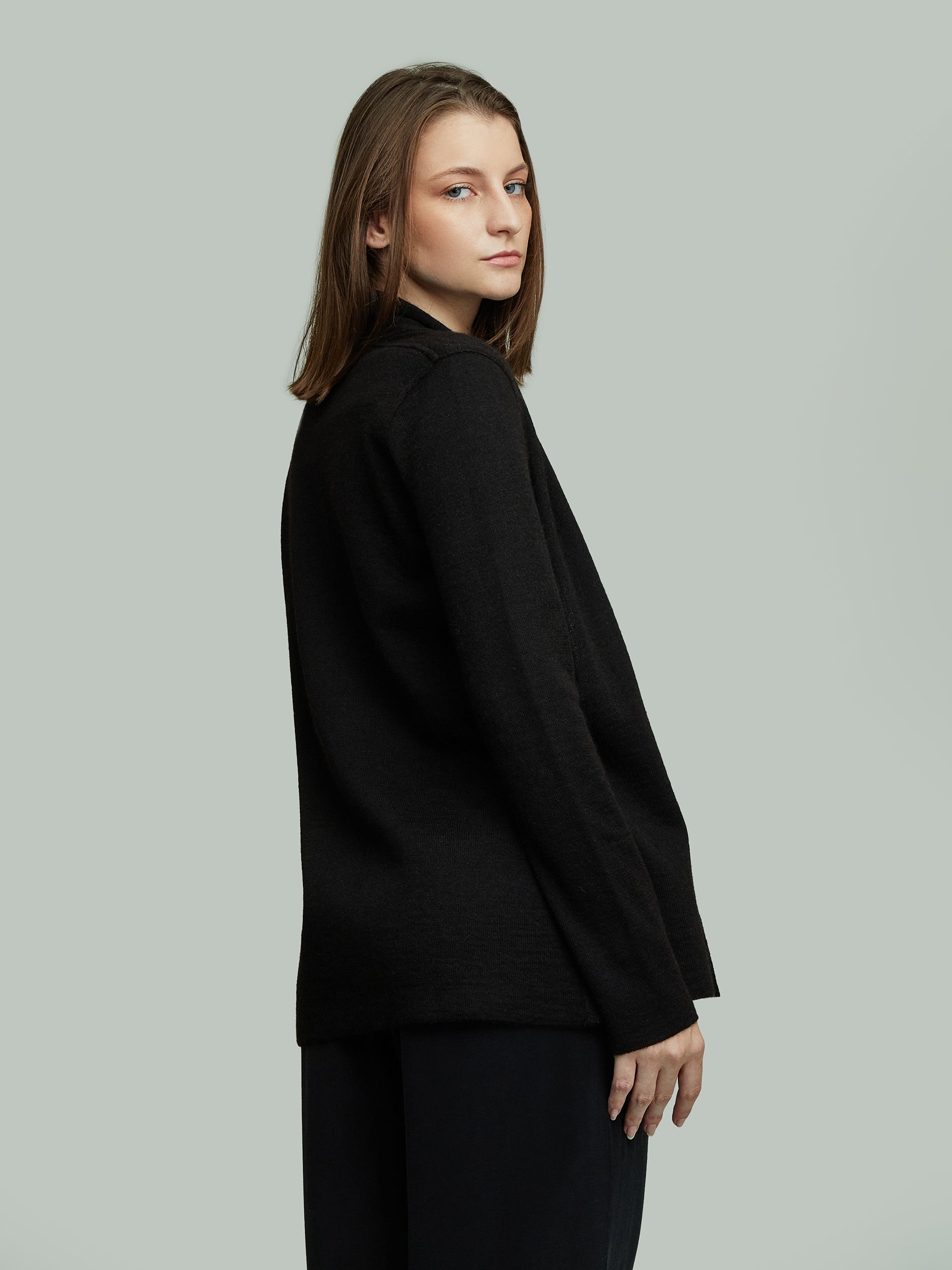 Thanks to its textures and openings, as well as its versatility and lightness, the Bora cardigan is one of the favorites of the collection, as it gives the pleasure of wearing an unique and sophisticated look. The exclusive Black Alpaka collection has been made with natural black alpaca fiber, that has not been exposed to any dyeing process. It symbolizes the commitment that we make together with Pacomarca for the conservation of pure black alpacas, now endangered.