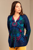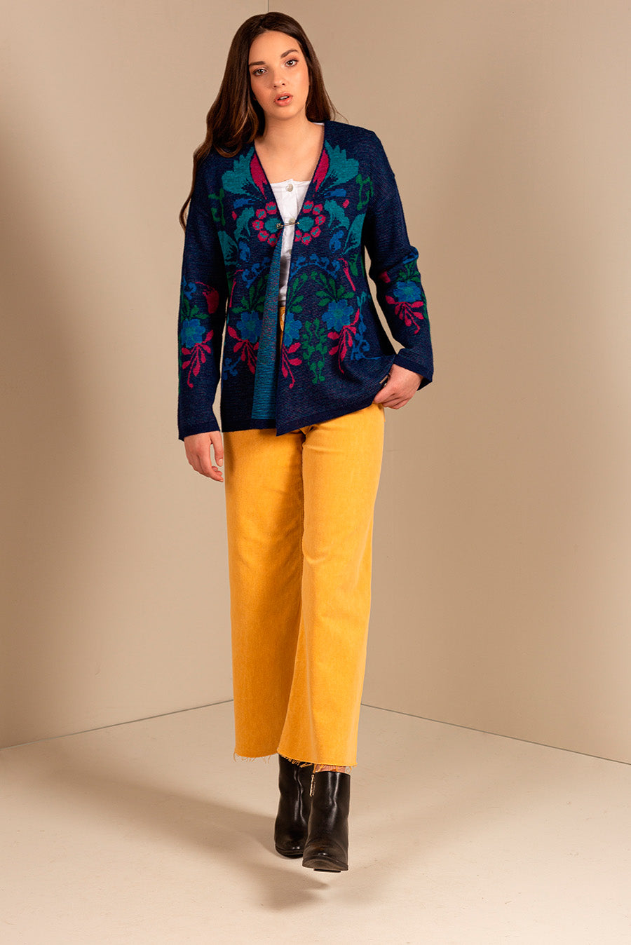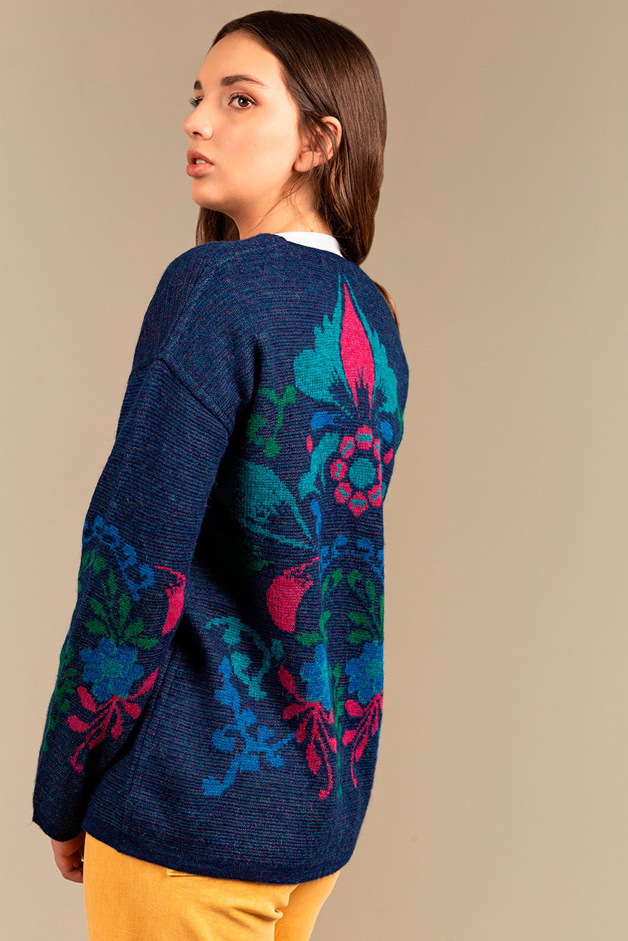 Our reversible Uberlu cardigan is made in baby alpaca. This colorful cardigan is one of the most representative garments of our collection, the colorful graphics inspired by Peruvian altarpieces, give it a very special and daring touch. The star of any look.