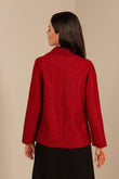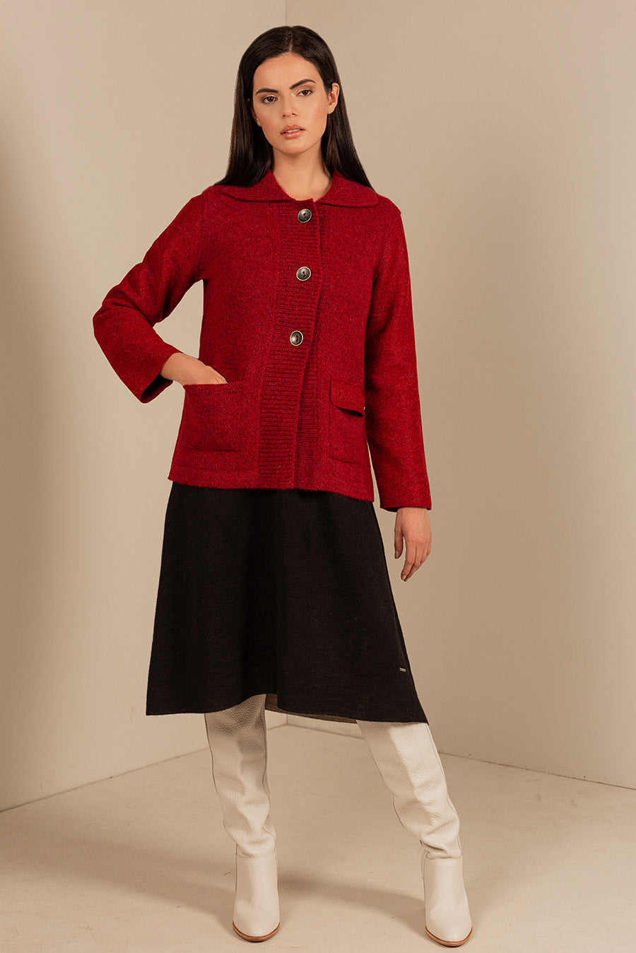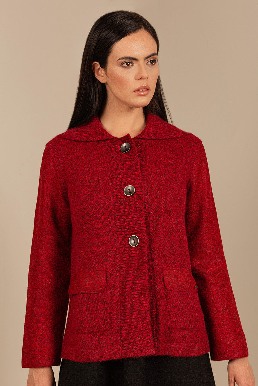 A cardigan with sack personality, we combined knitted fabric with our felted fabric to make this attractive garment. It has a knitted collar, straight cut, plus the large metal buttons to close it add a touch of uniqueness and visual appeal.
