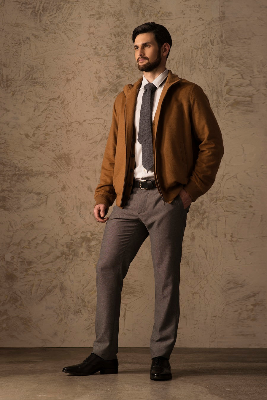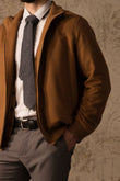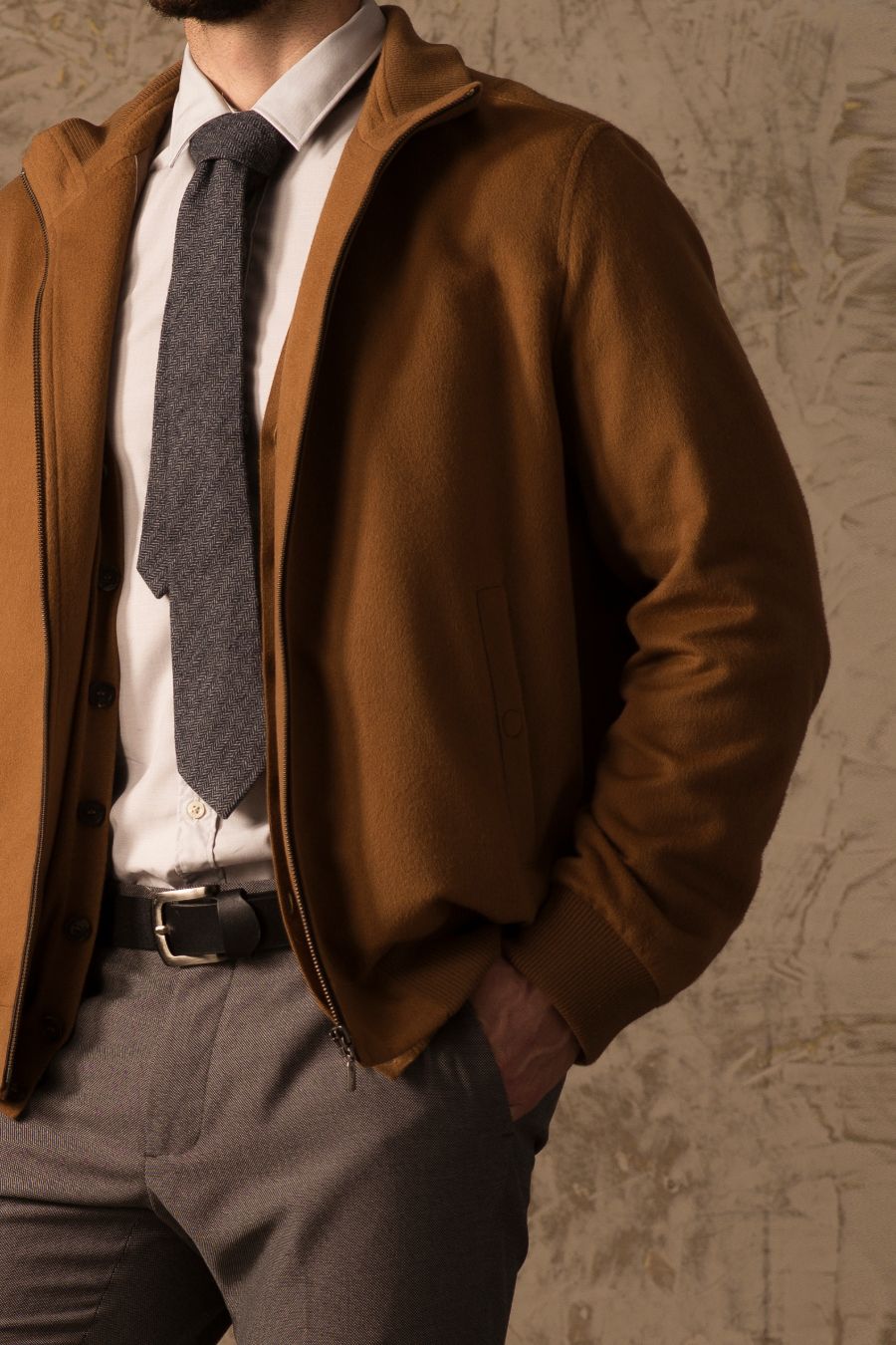 Sophisticated vicuña jacket with silk lining, large pockets and metal zipper that can be covered by a cross of the same fabric with metal clips. A true classic, a reference in men's fashion.