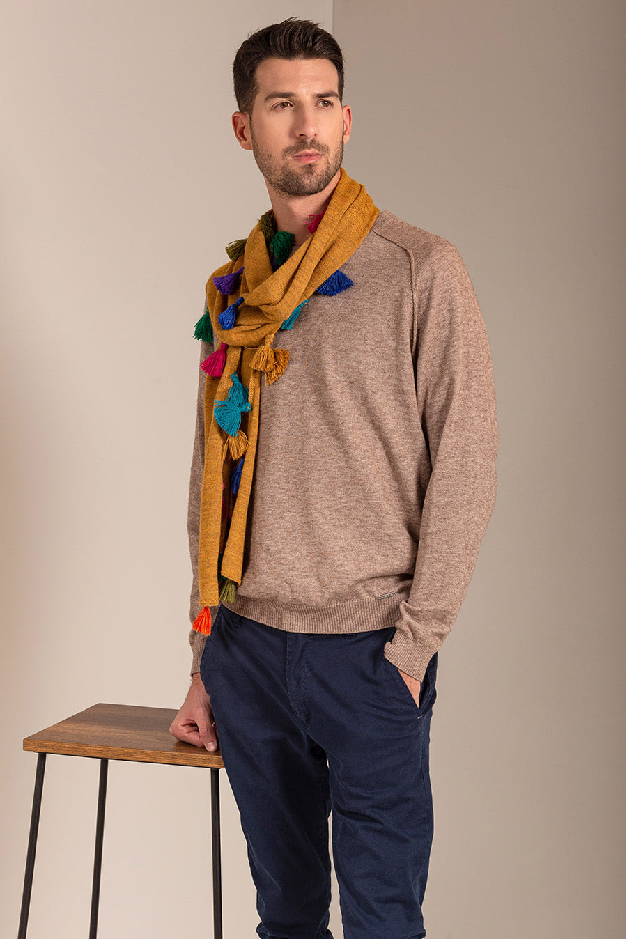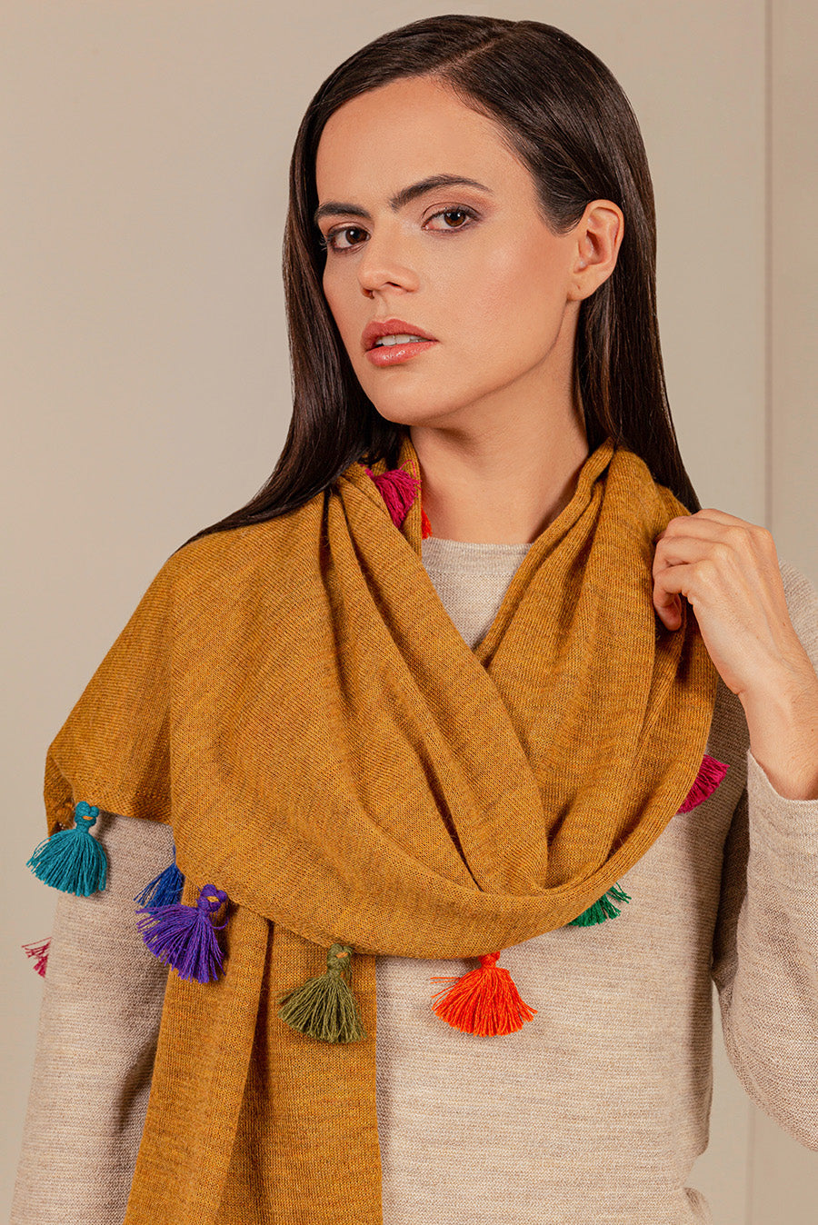 Soft and luxurious 100% baby alpaca scarf. Colorful tassels on edge.