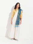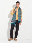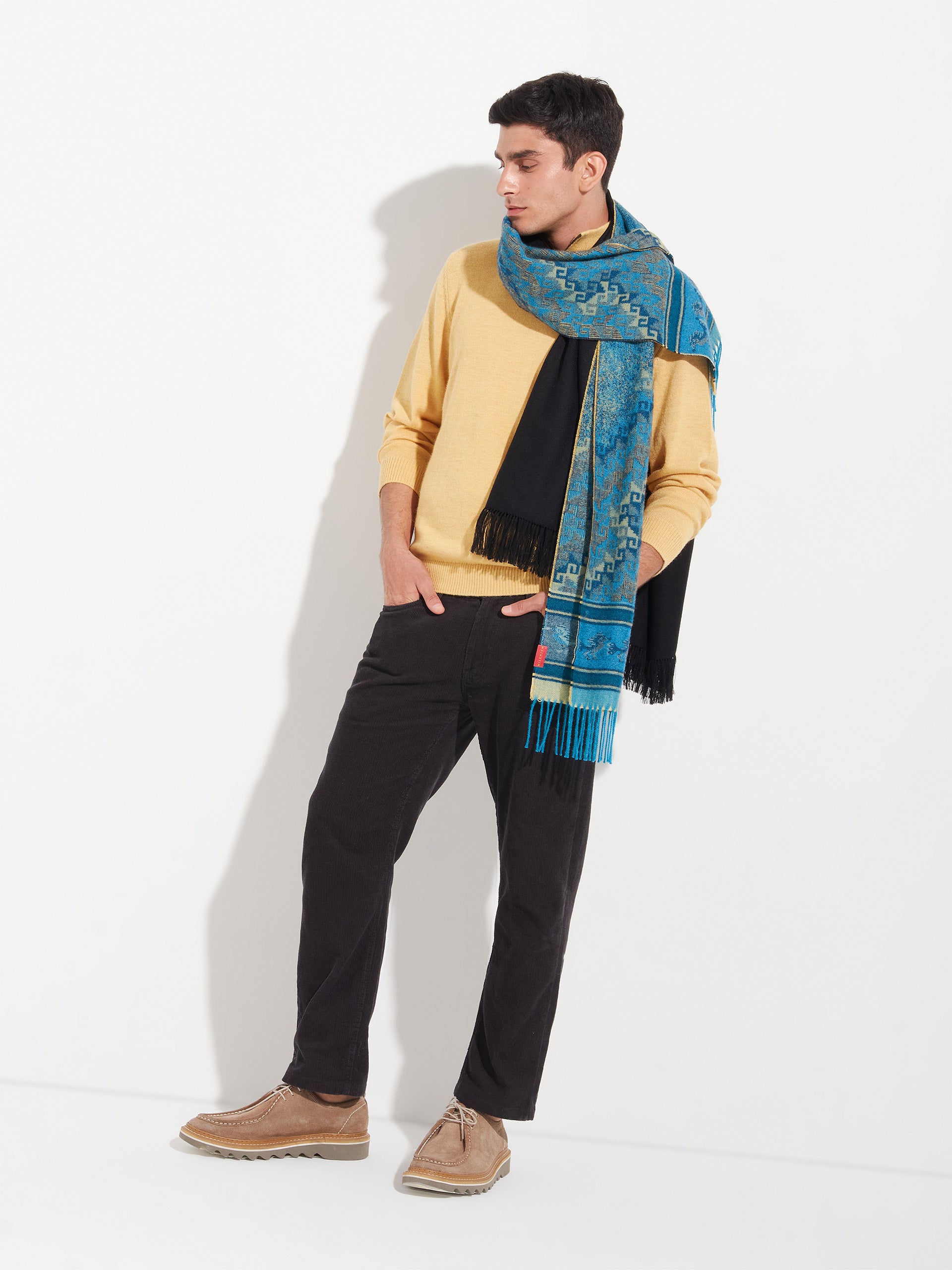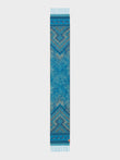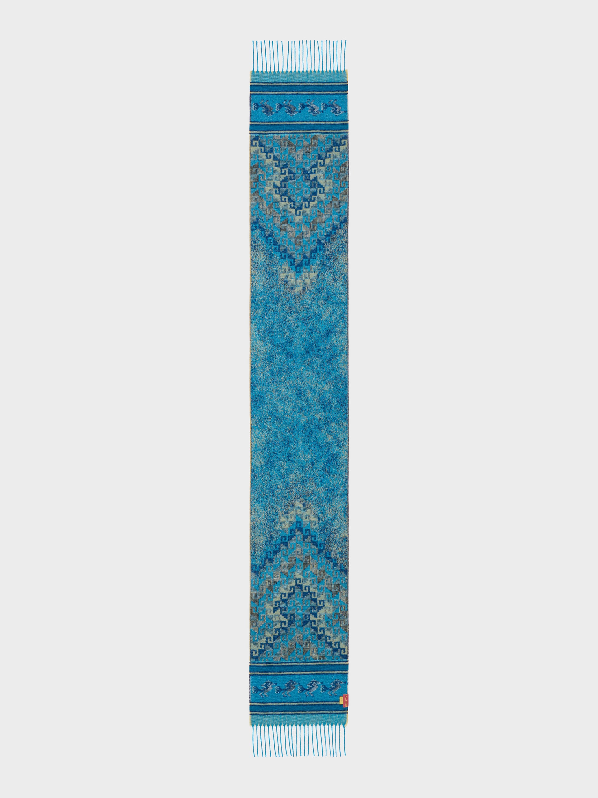 Chancay 37 scarf in blue, made from 100% baby alpaca using a double-sided Jacquard technique. It measures 180/164 x 25 cm and is inspired by the Chancay culture. A unisex accessory that captures the essence of ancestral tradition through a design with authentic cultural value. | Predominant material: Baby Alpaca
