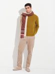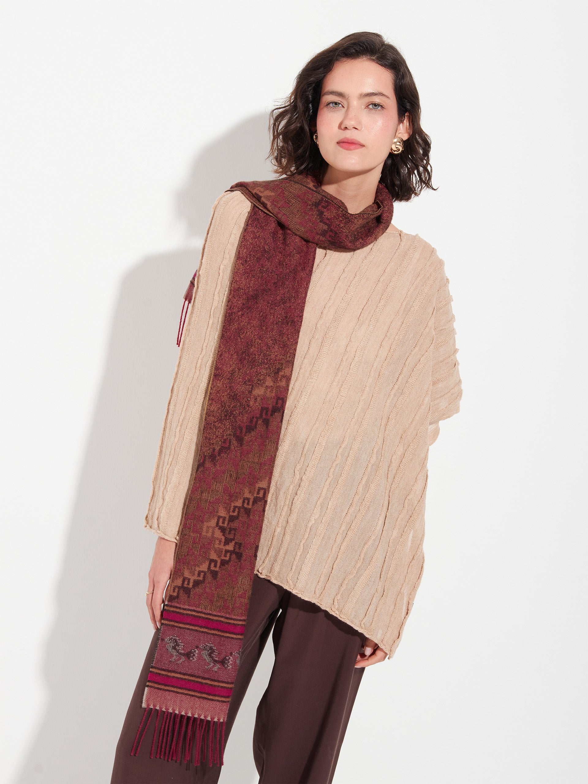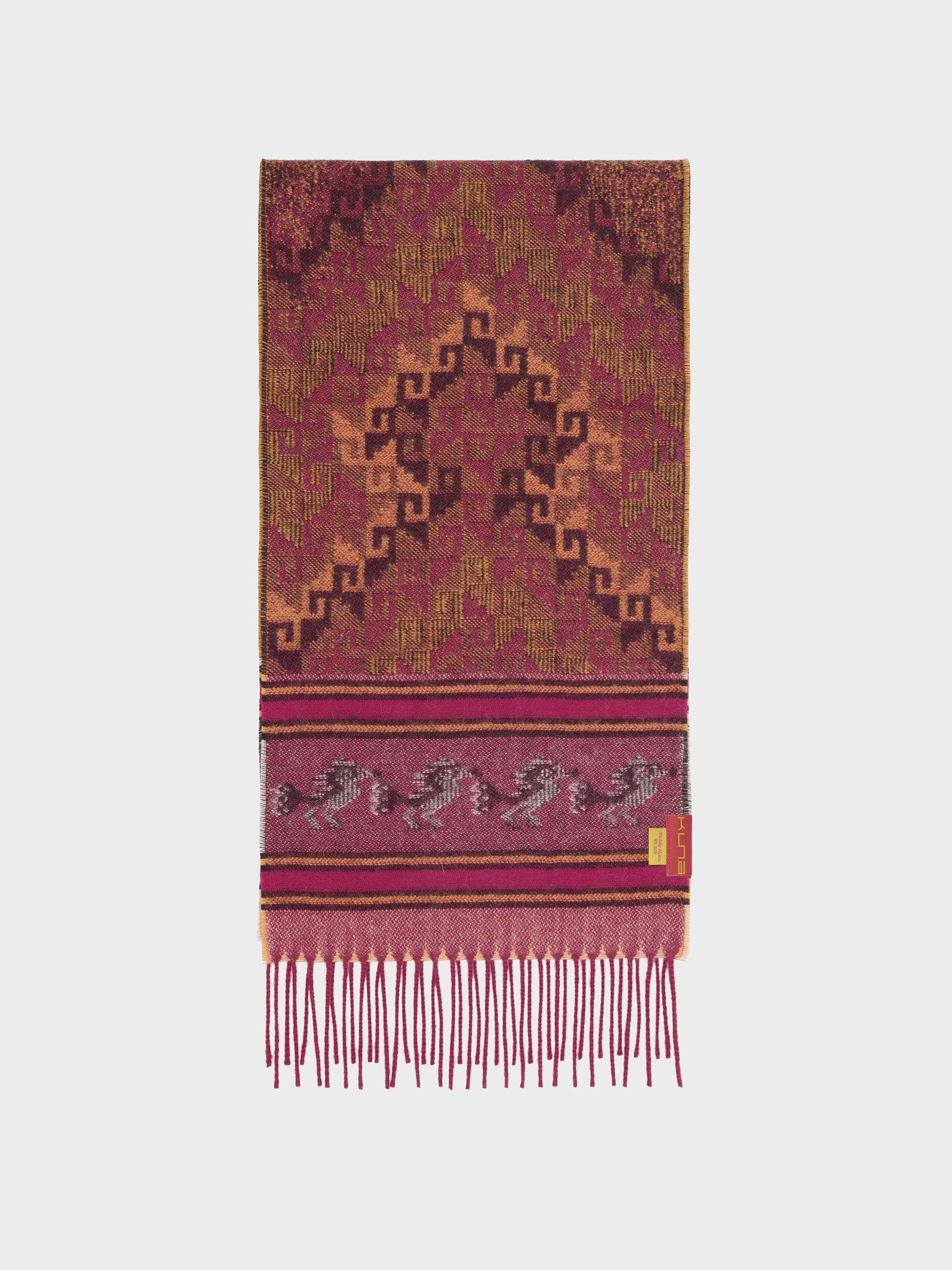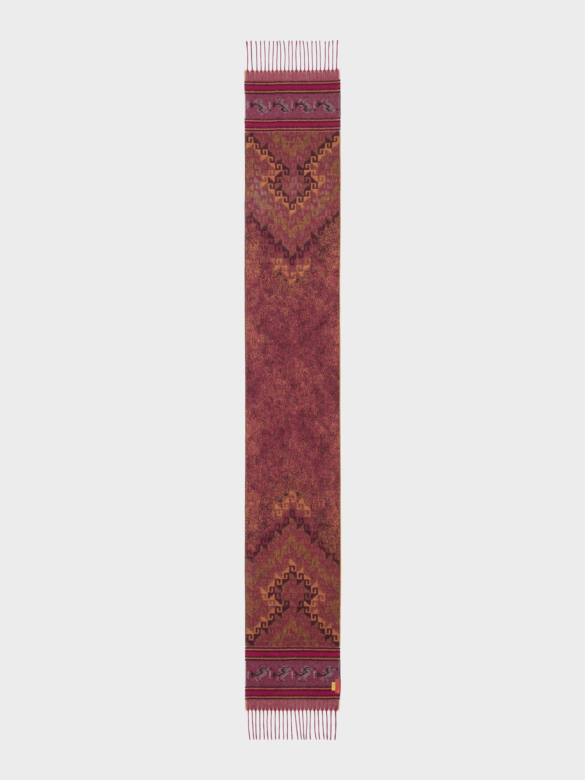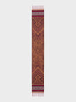 Chancay 37 scarf in red, made from 100% baby alpaca using a double-sided Jacquard technique. It measures 180/164 x 25 cm and is inspired by the Chancay culture. A unisex accessory that captures the essence of ancestral tradition through a design with authentic cultural value. | Predominant material: Baby Alpaca