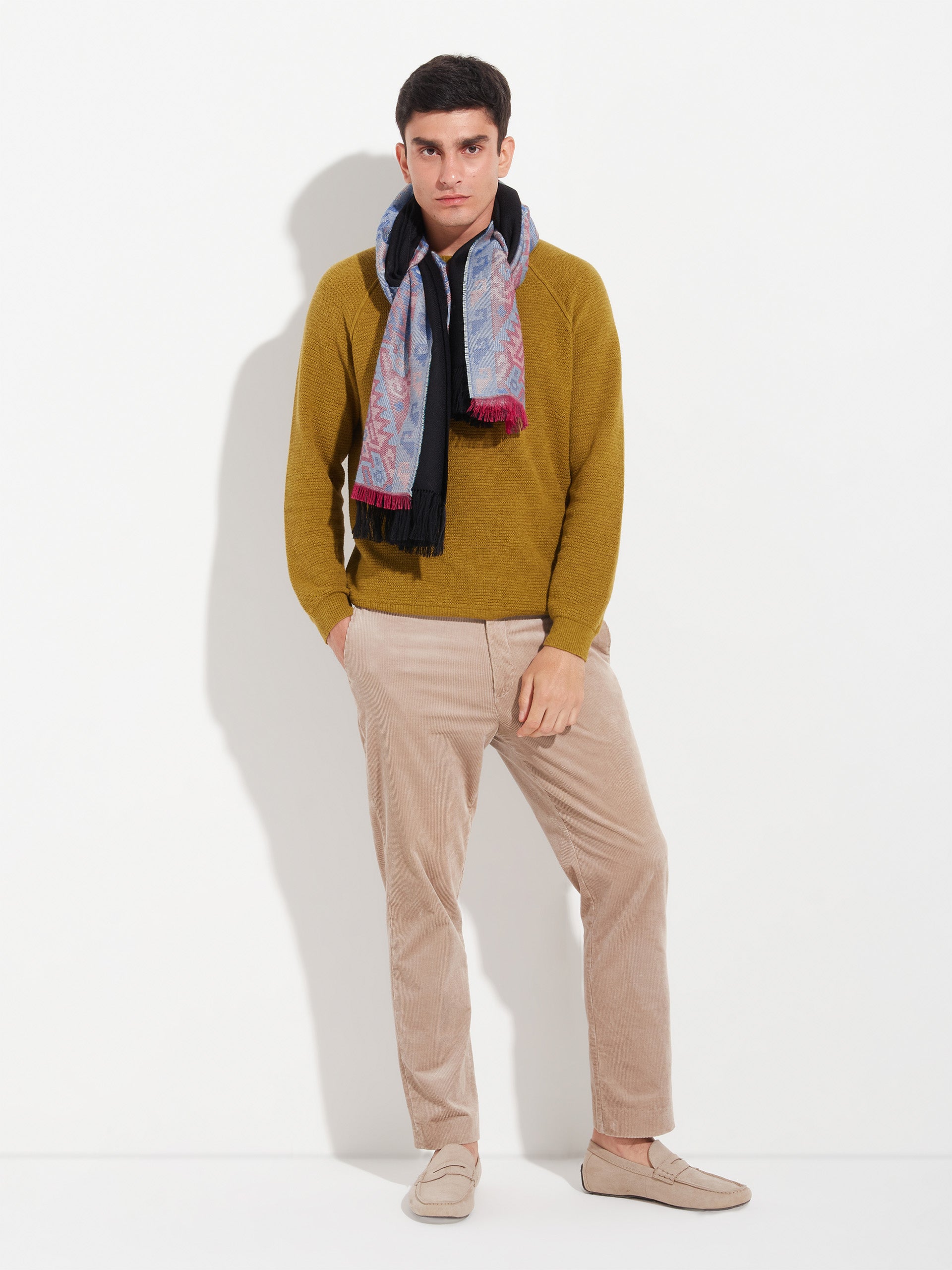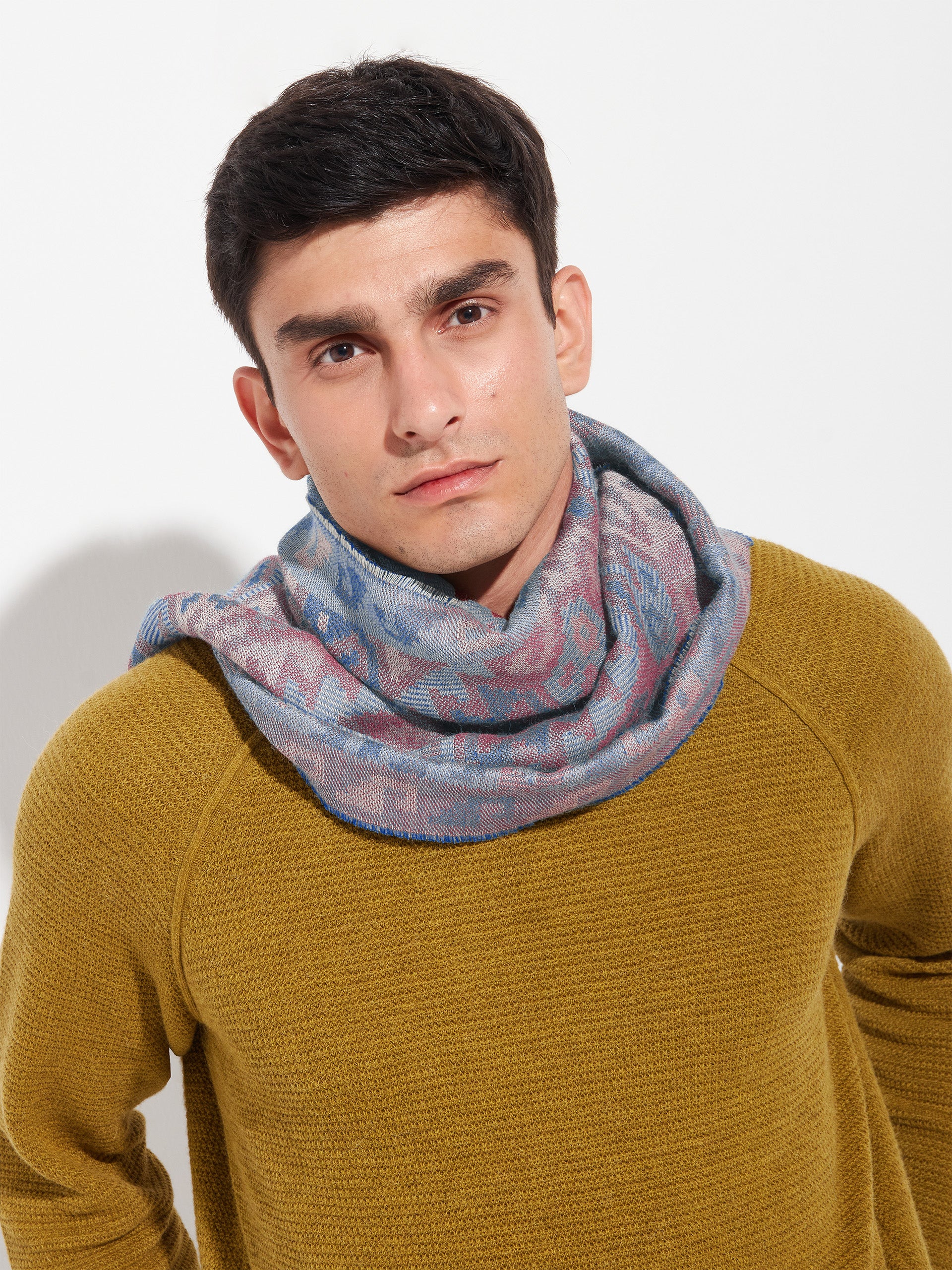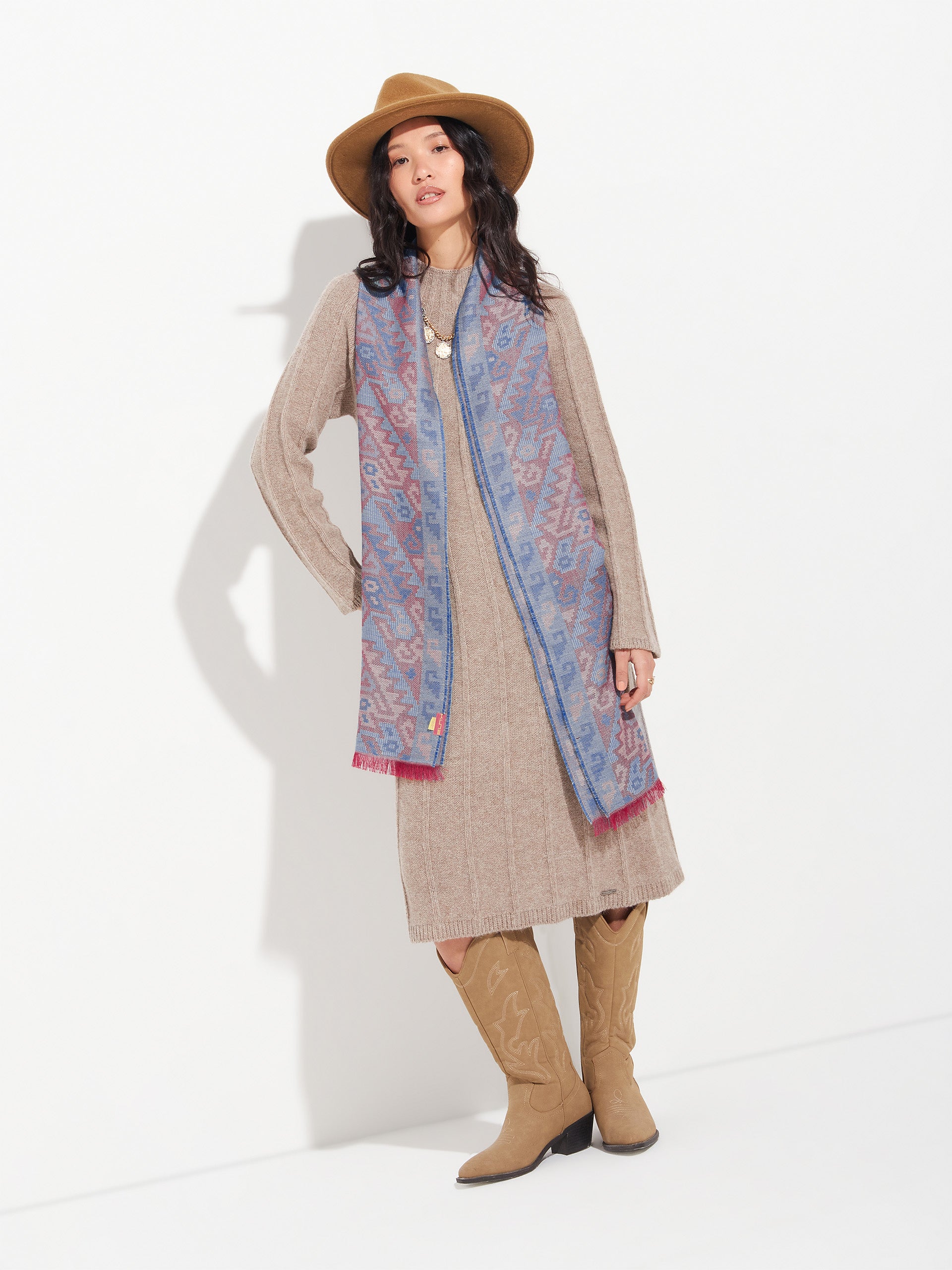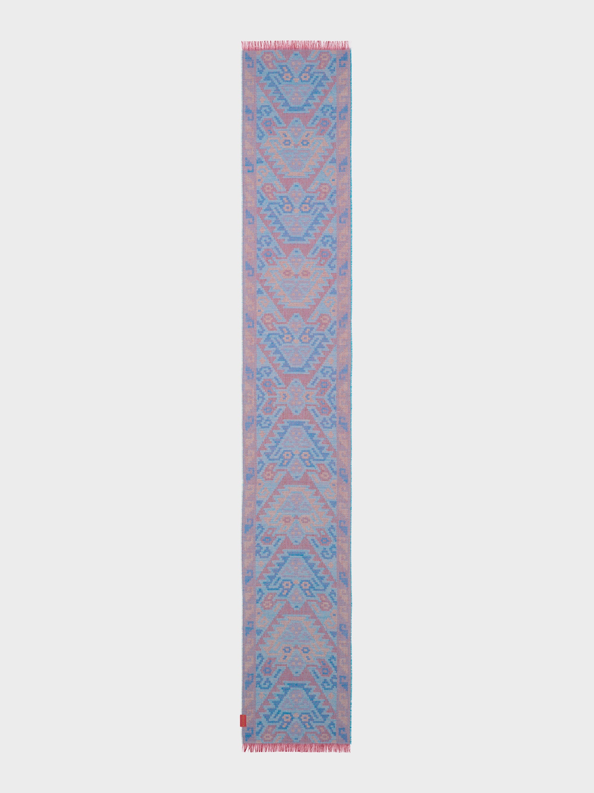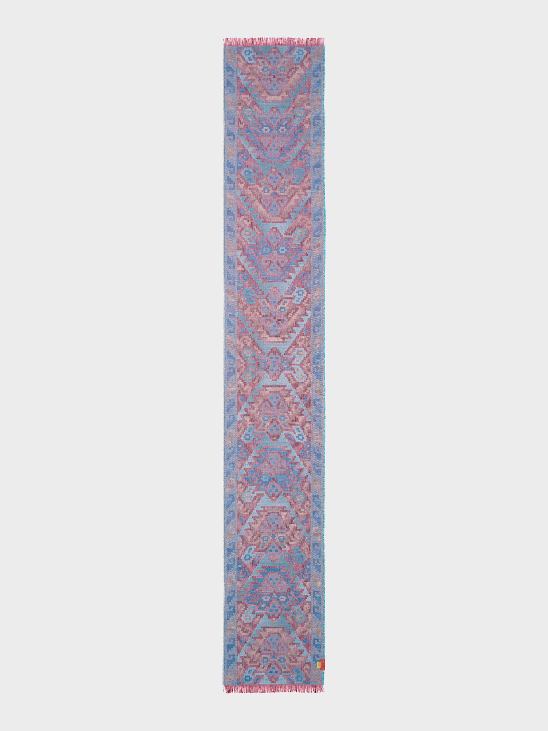 Chancay 38 scarf in blue, made from 70% baby alpaca and 30% silk, using a double-sided Jacquard technique. Measuring 200/196 x 30 cm, it is a unisex and reversible accessory, inspired by the Chancay culture, which connects with ancestral memory through an authentically cultural design. | Predominant material: Baby Alpaca
