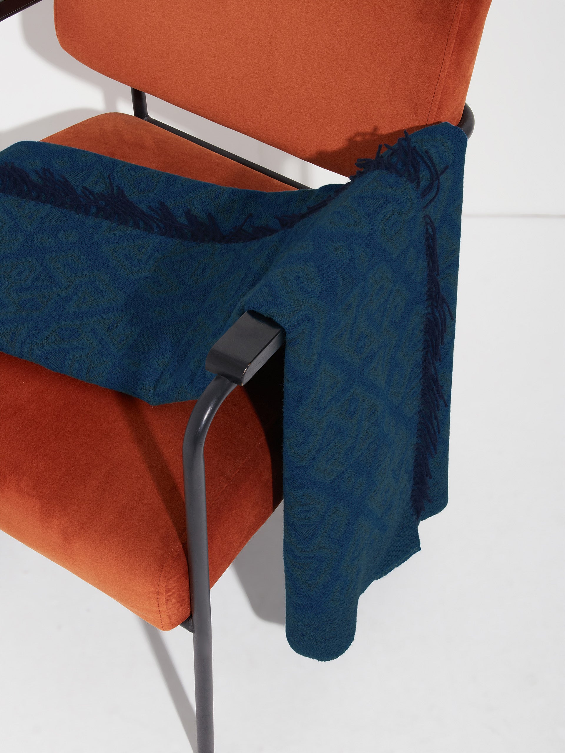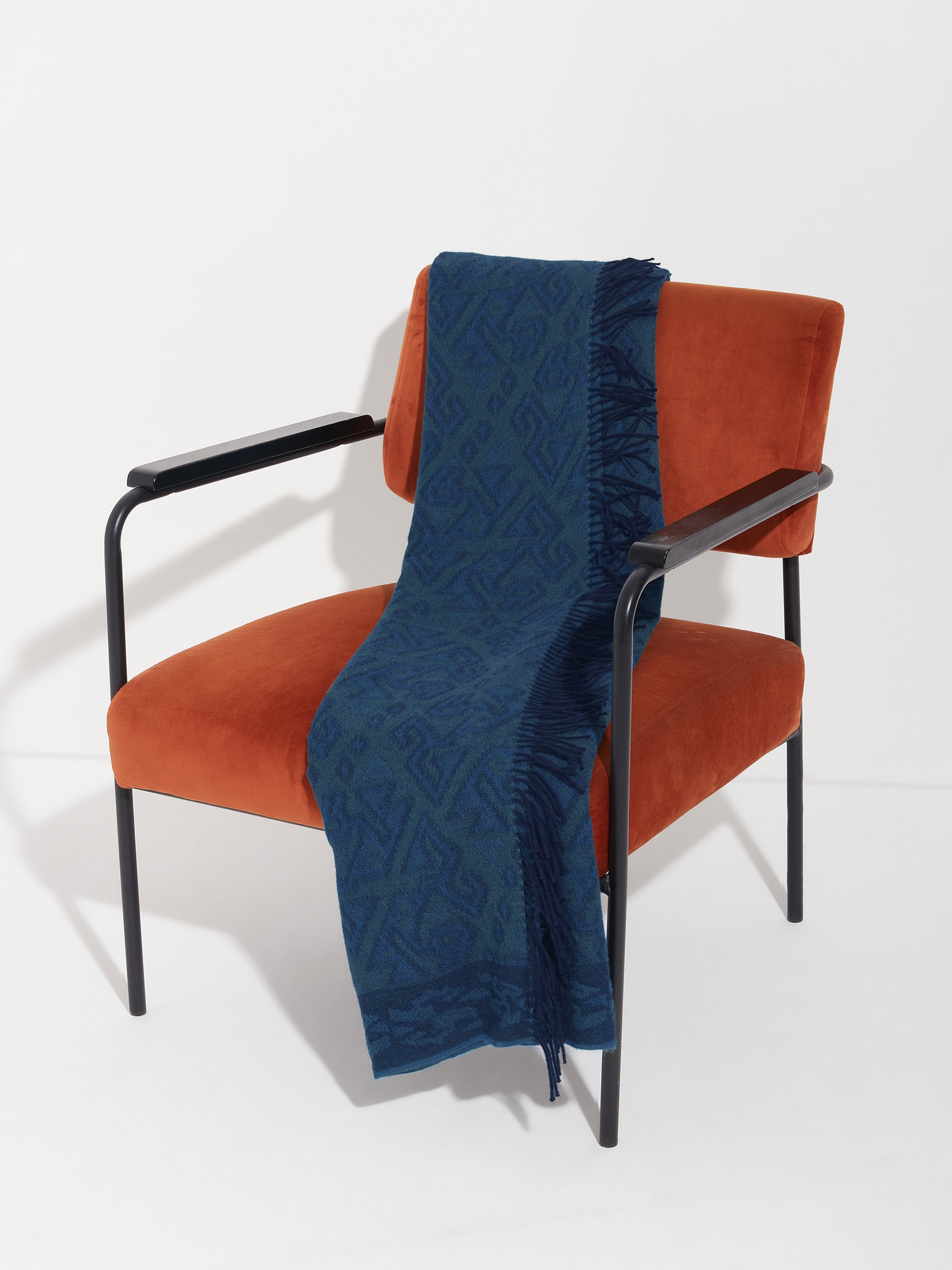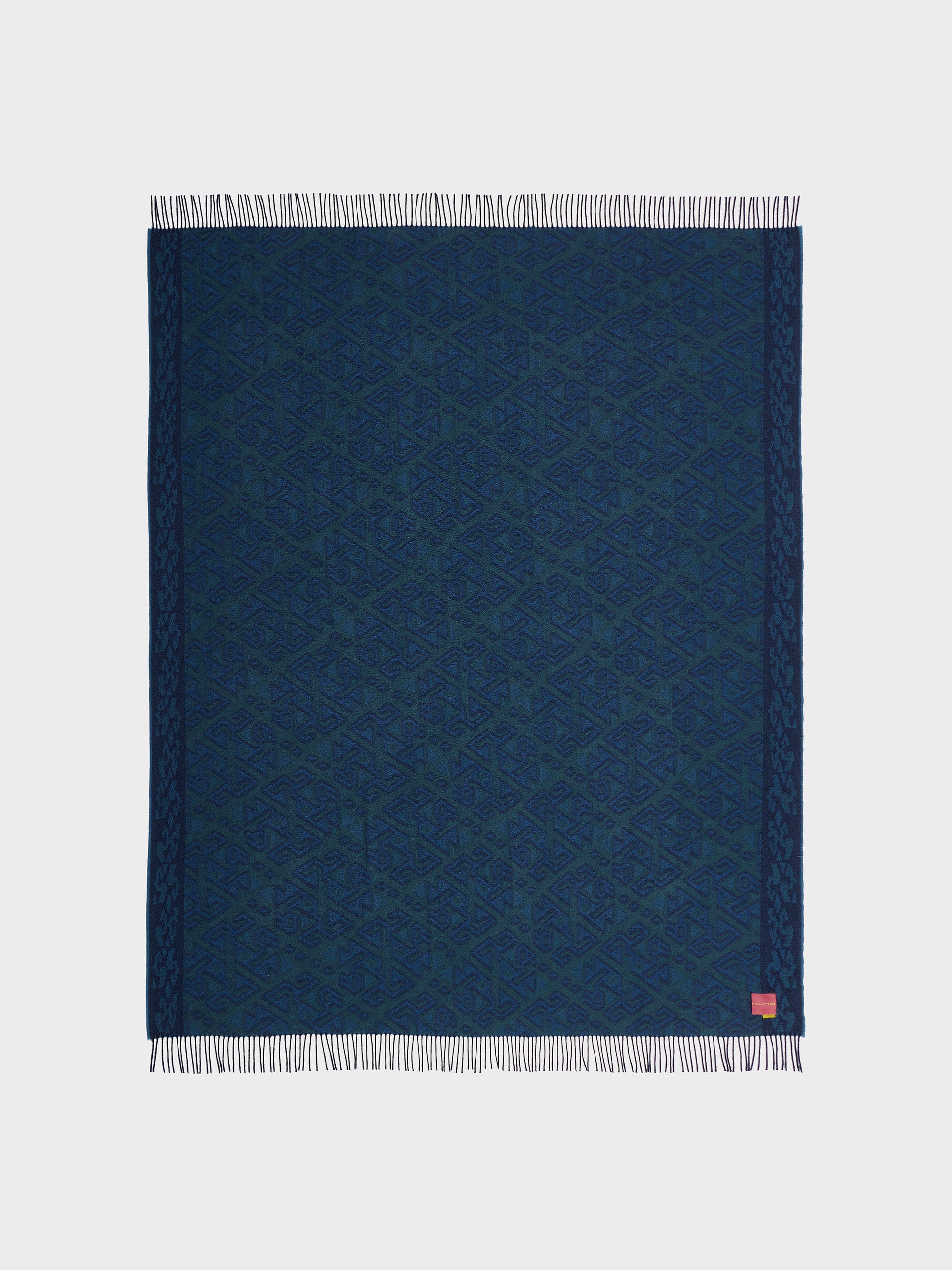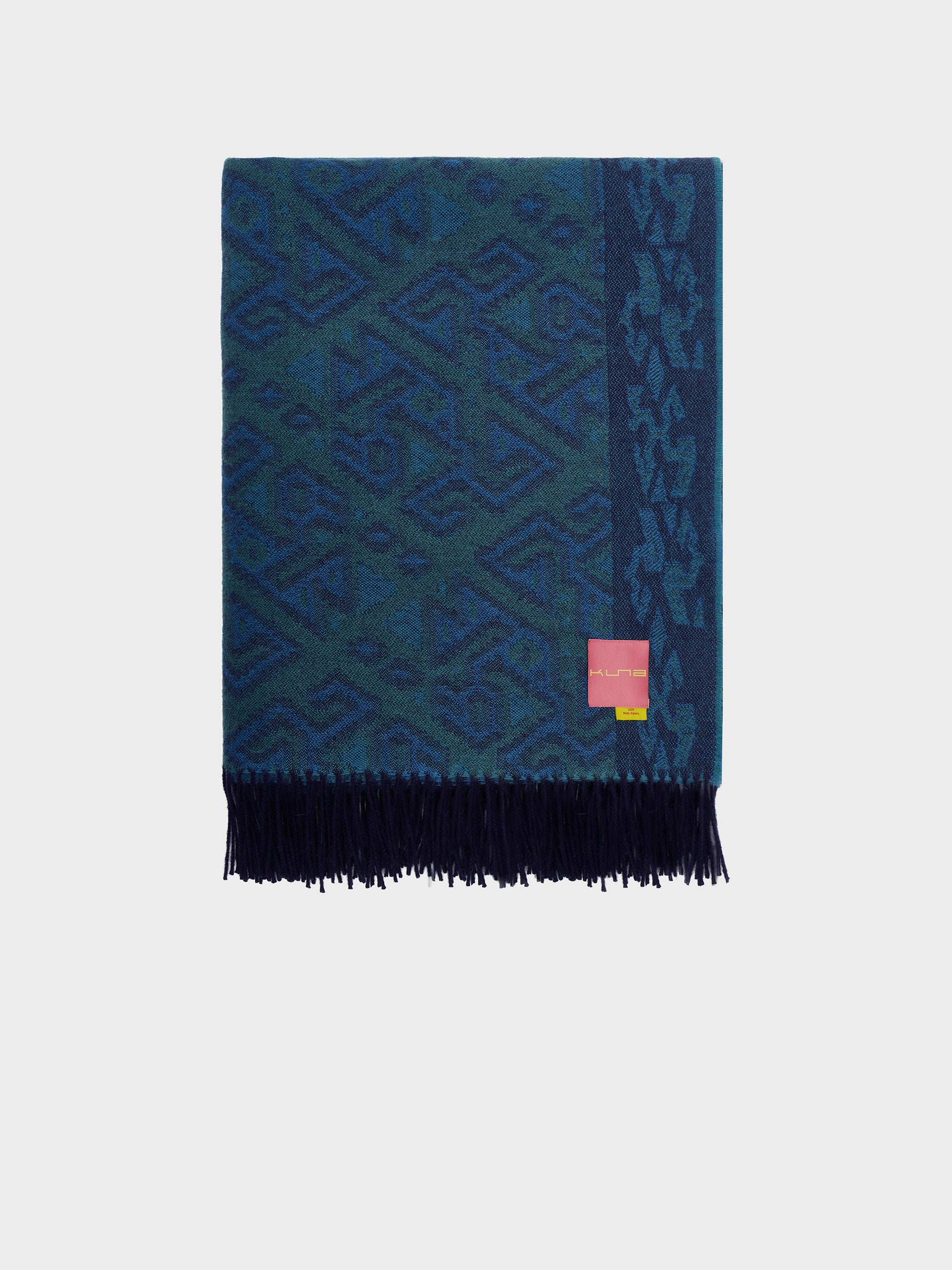 Chincha 2 blanket in blue, made from 100% baby alpaca using a double-sided Jacquard technique. Measuring 200/184 x 145 cm, it is inspired by the Chincha culture, evoking the richness of ancient traditions through a design with cultural identity. | Predominant material: Baby Alpaca