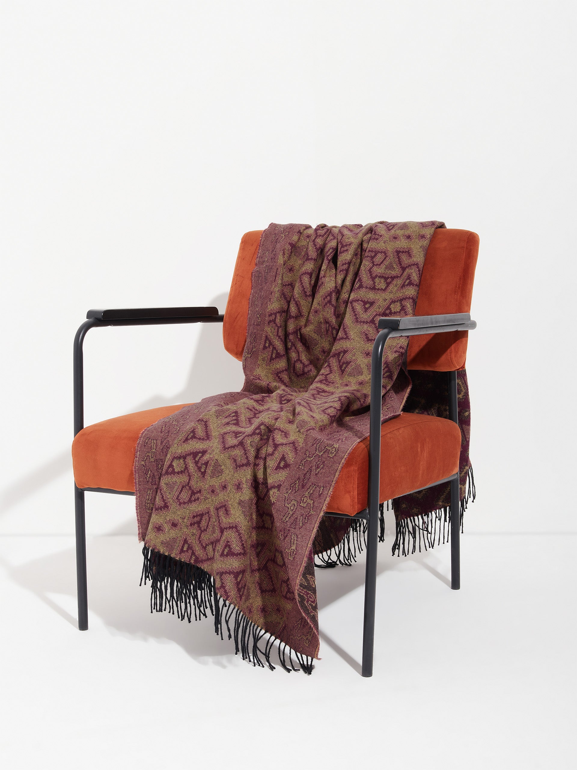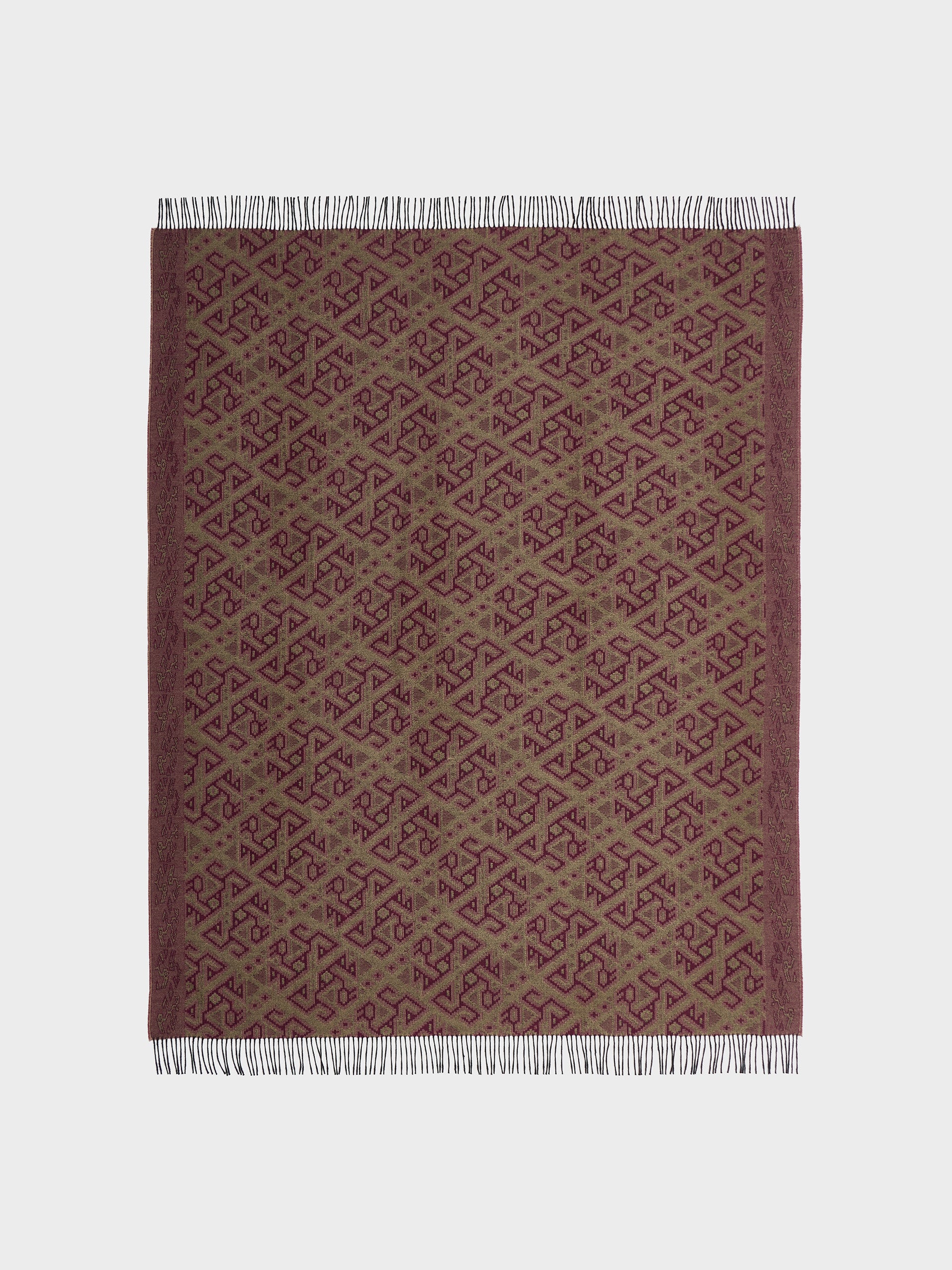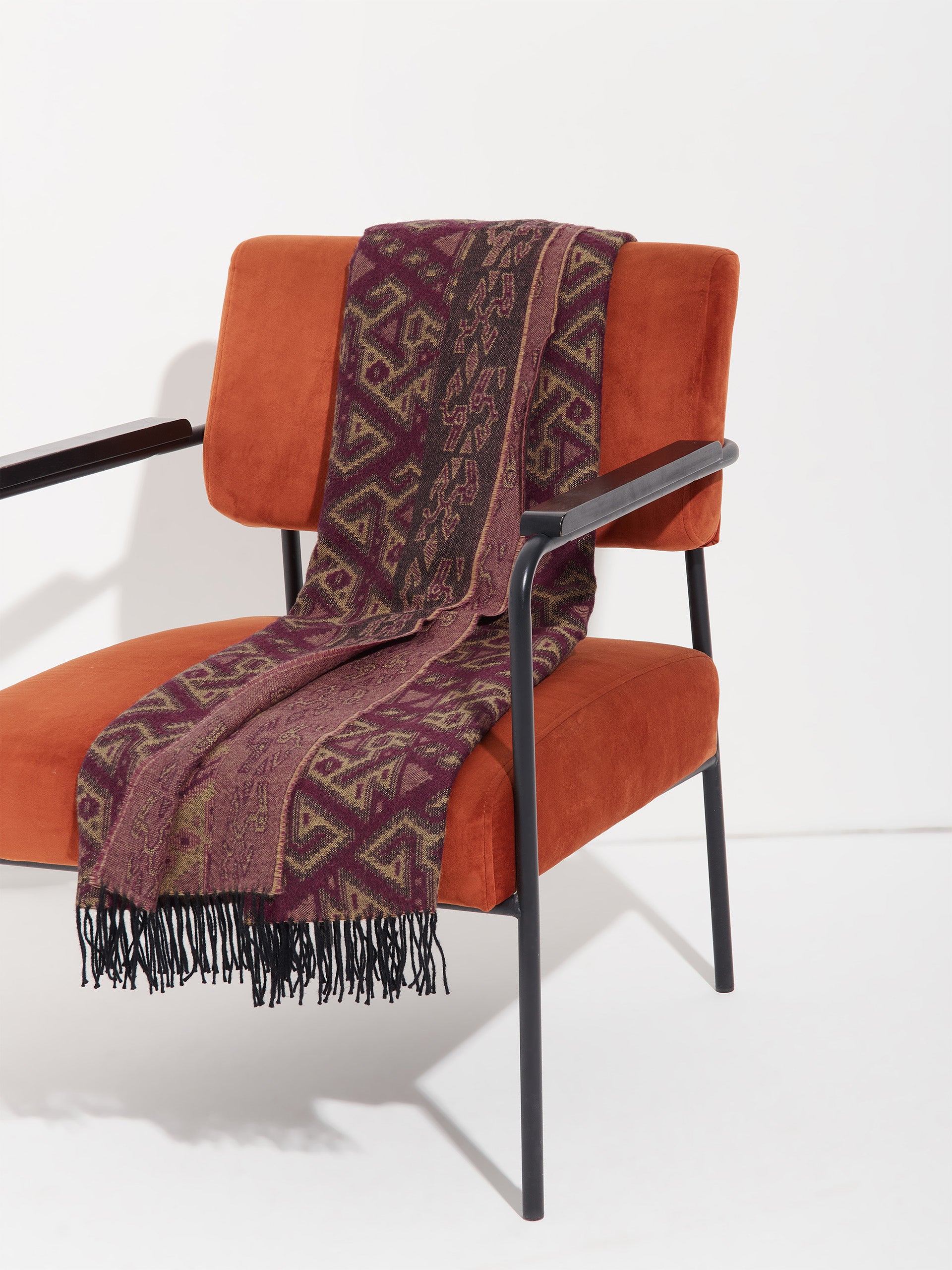 Chincha 2 blanket in red, made from 100% baby alpaca using a double-sided Jacquard technique. Measuring 200/184 x 145 cm, it is inspired by the Chincha culture, evoking the richness of ancient traditions through a design with cultural identity. | Predominant material: Baby Alpaca
