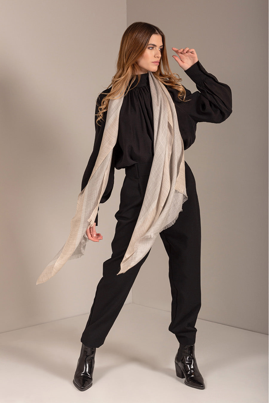 A Royal alpaca and silk accessory with a slightly shiny finish. Wear it perfectly wrapped around your neck to complement casual and classic outfits.