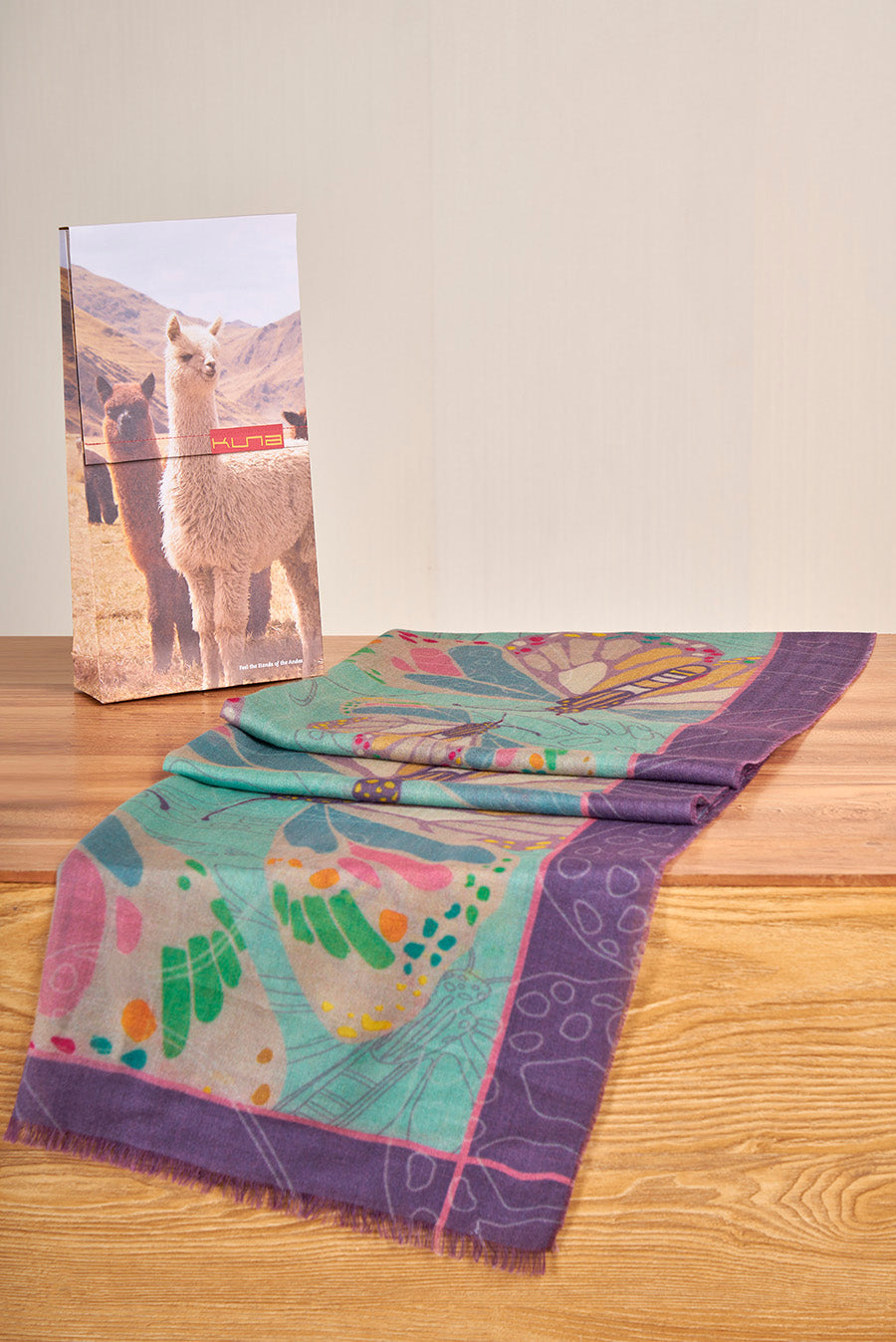 Our beautiful Vanished shawl is made of the purest baby alpaca and silk fibres. The iconic butterflies, characteristic of our collection, embellish this accessory, perfect to complement your favourite outfits.