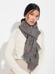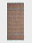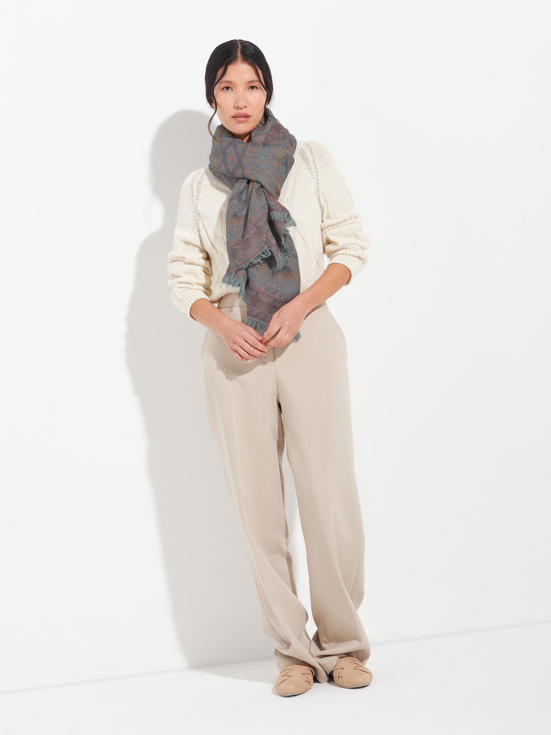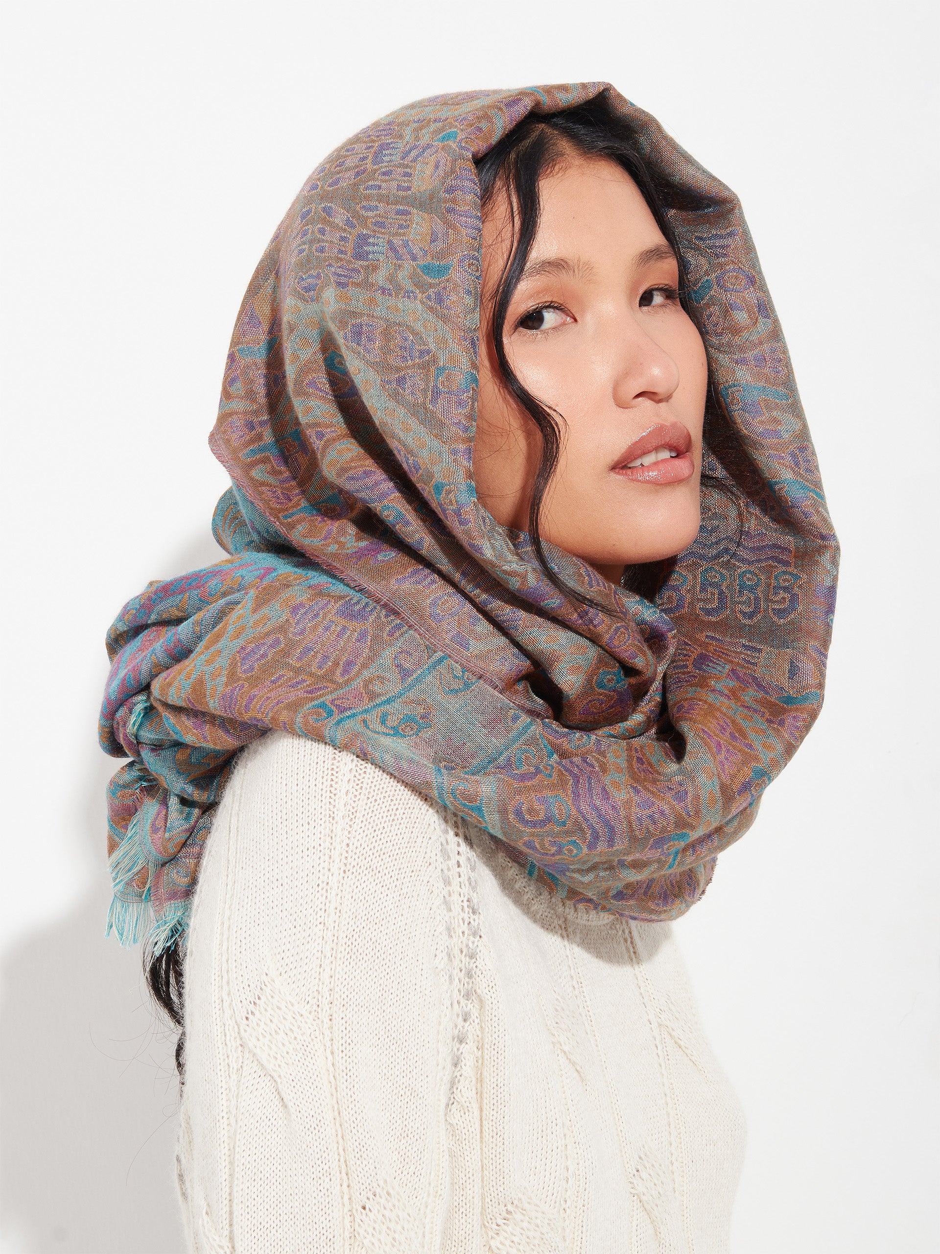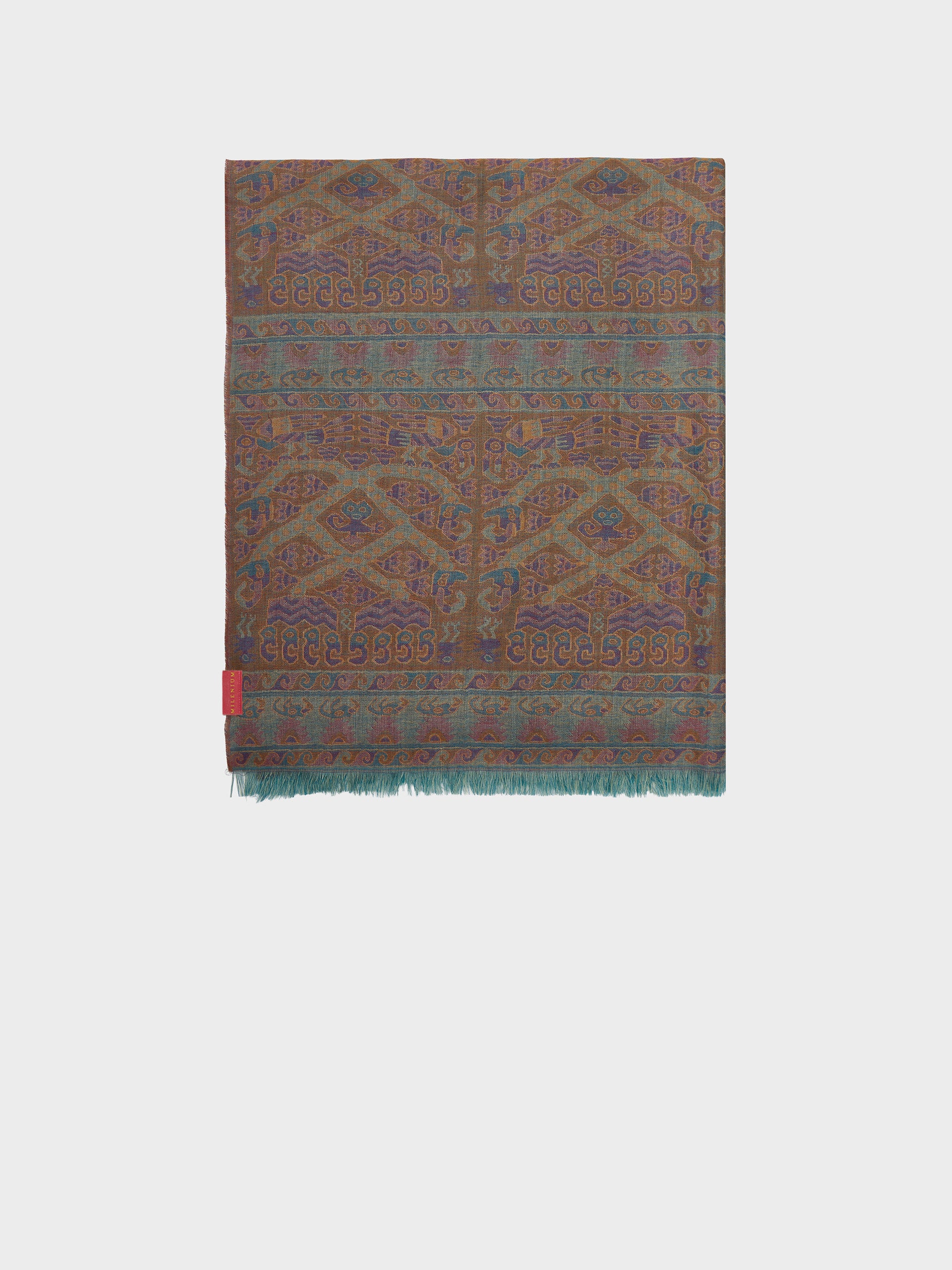 Lambayeque 8 stole in blue, made from 50% Royal alpaca and 50% silk, using the Jacquard technique on double fabric with hidden weft insertion. Measuring 200/196 x 93 cm, it is a reversible garment inspired by the Lambayeque culture, keeping the ancestral tradition alive in a design that represents cultural identity. | Predominant material: Royal Alpaca And Silk