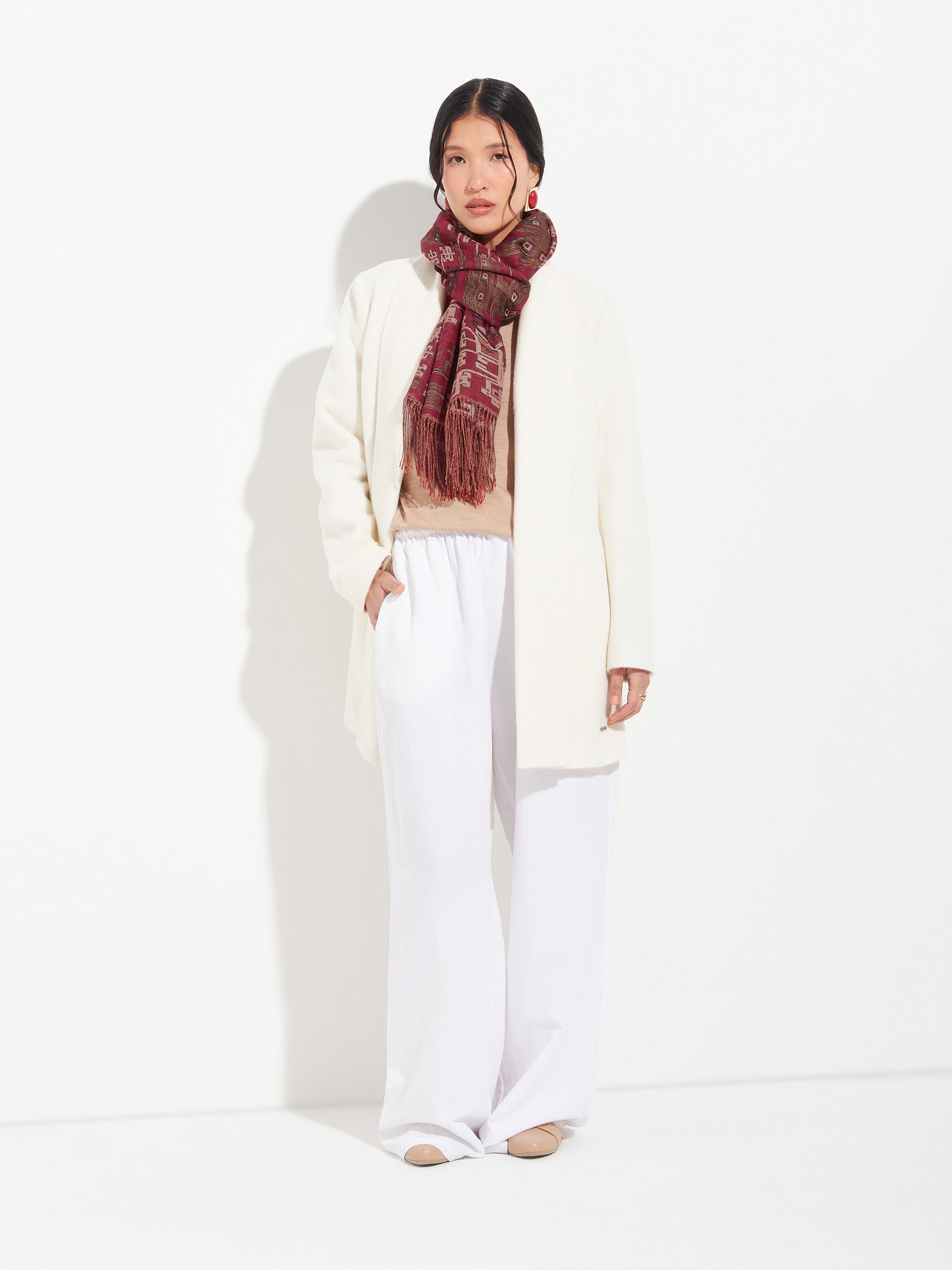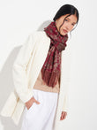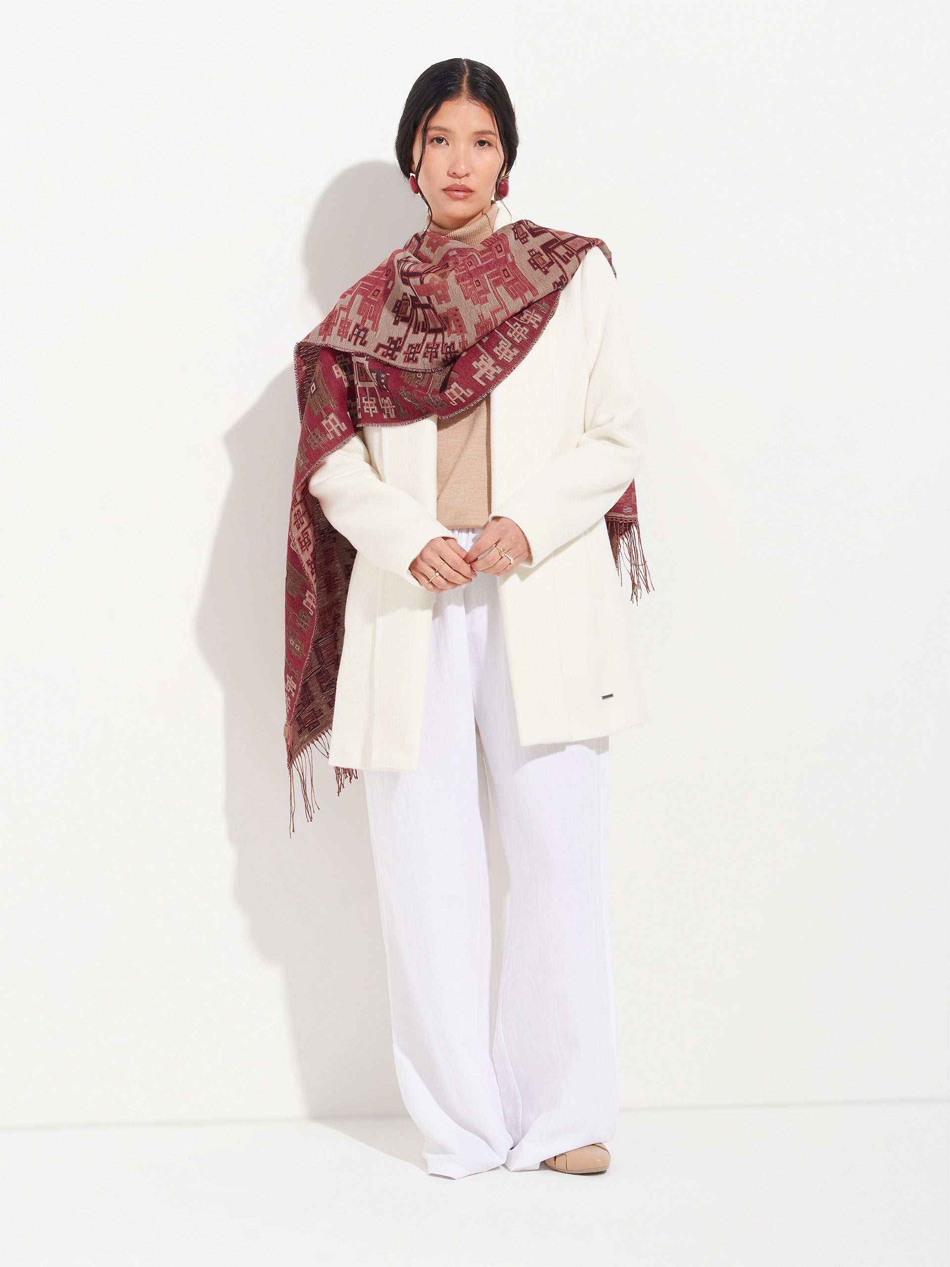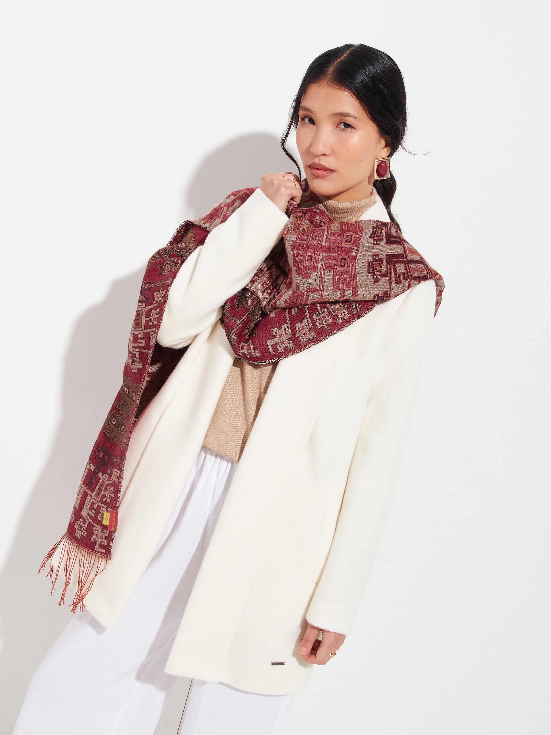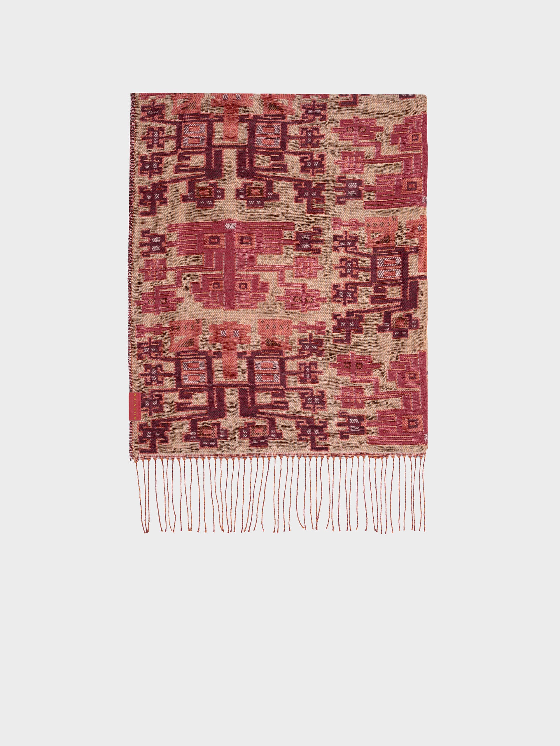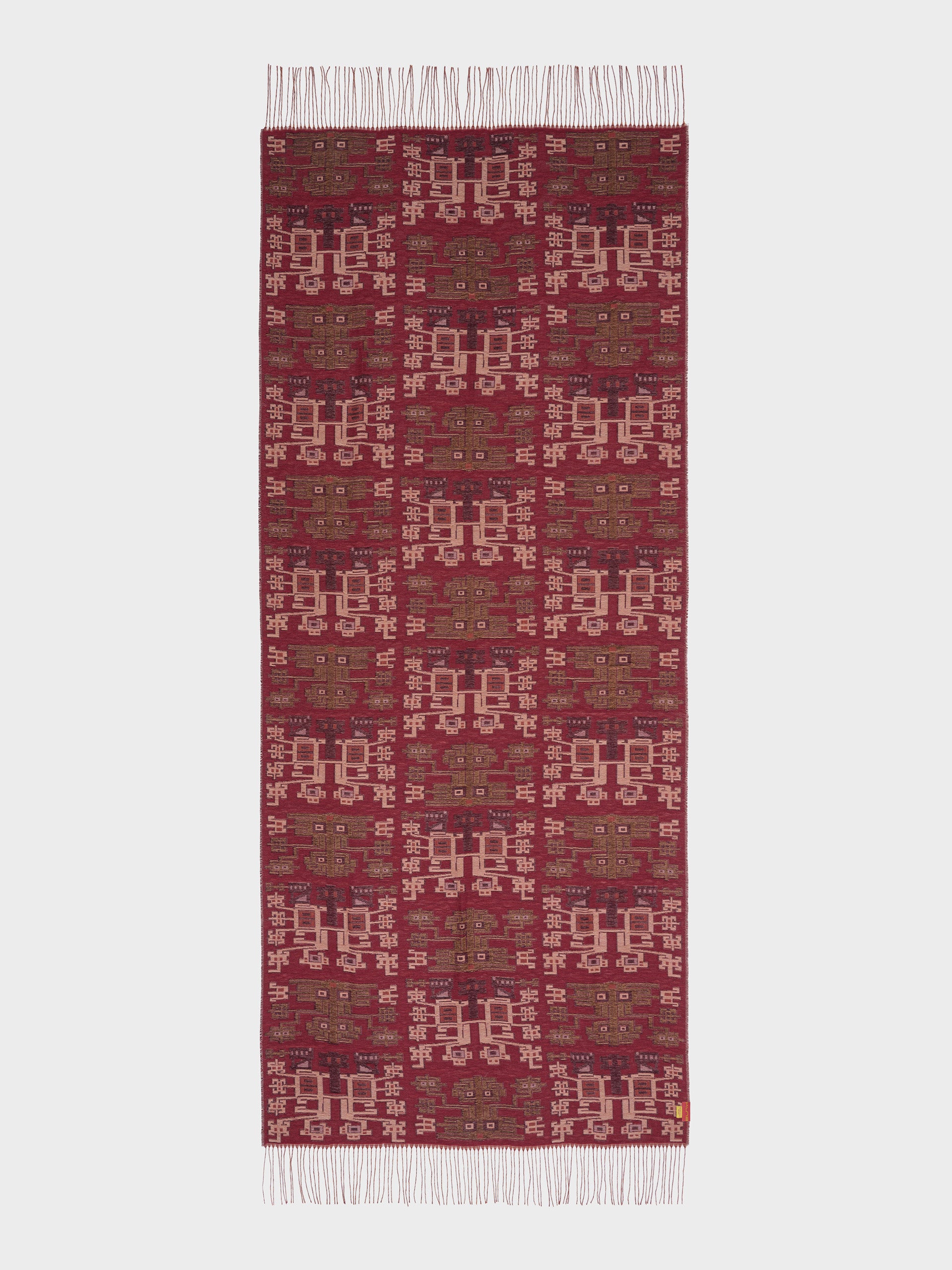 Nazca 52 stole in red, made from 70% baby alpaca and 30% silk, using a double fabric Jacquard technique with hidden weft insertion. Measuring 200/180 x 75 cm, this reversible garment is inspired by the Nazca culture, reinterpreting its ancestral legacy in a design inspired by indigenous culture. | Predominant material: Baby Alpaca