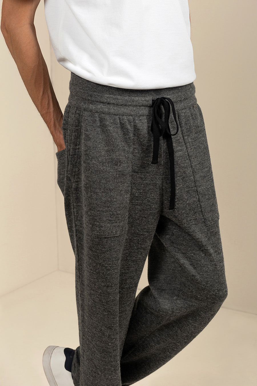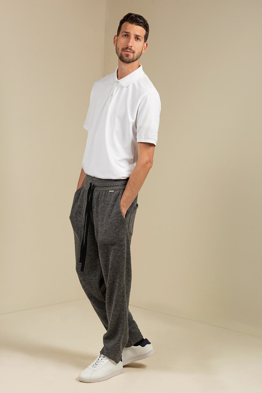 Sporty style and refined materials characterize the new pants of our Comfort Line, dedicated to relaxing moments and time at home. The soft inner pima cotton fabric is combined with the outer layer of baby alpaca and silk in a contrasting color. Side pockets and adjustable drawstring complement the style of the pants.