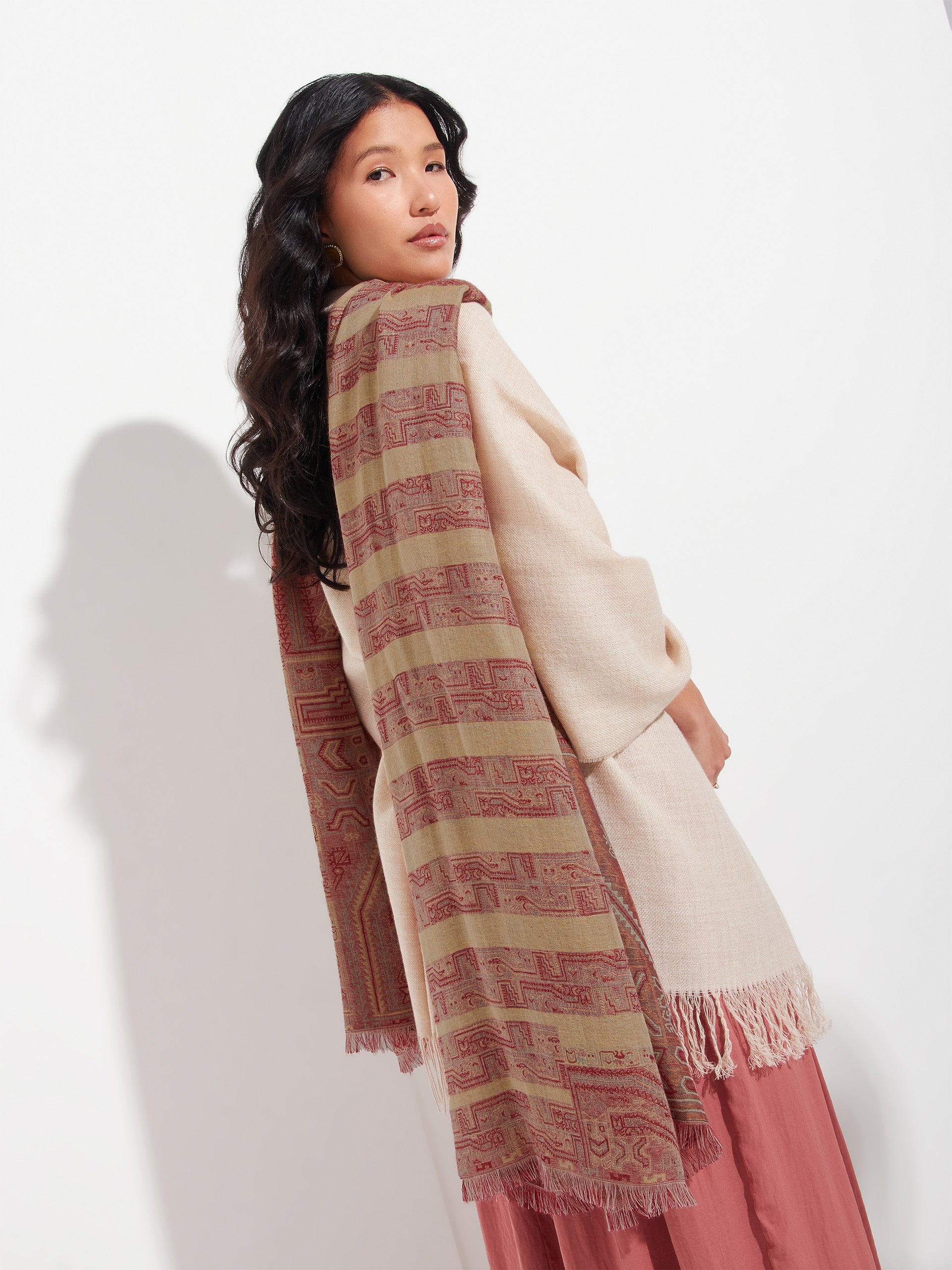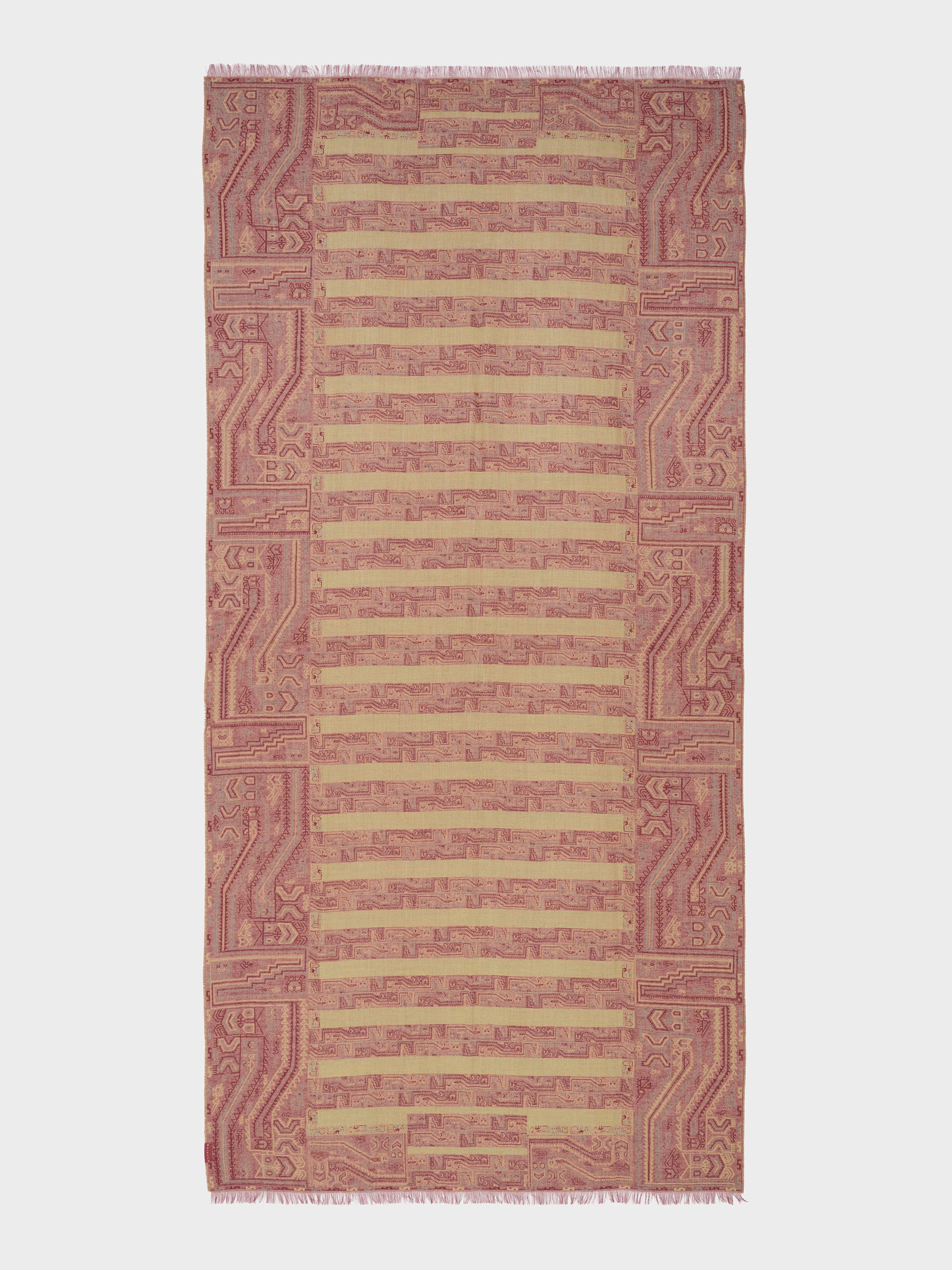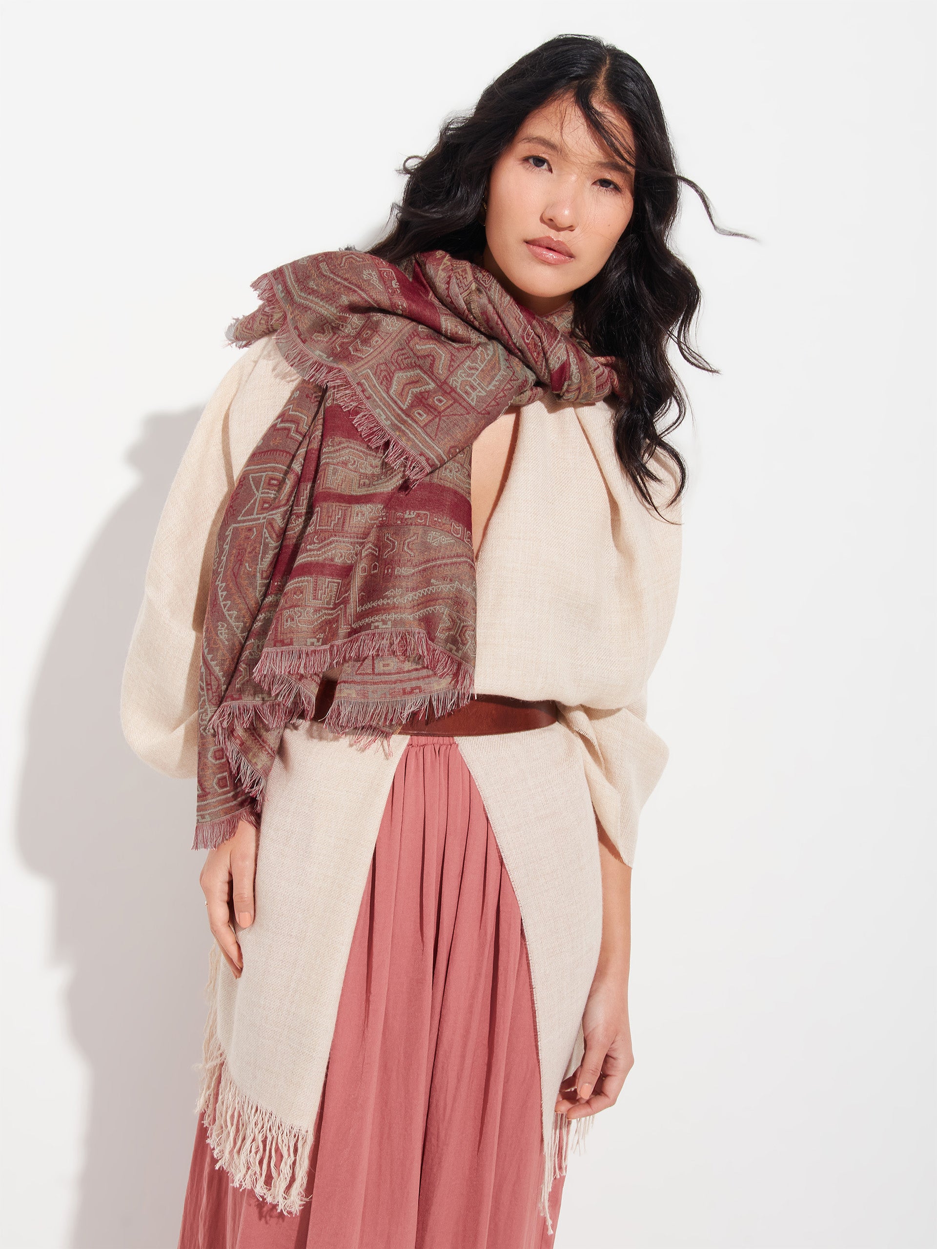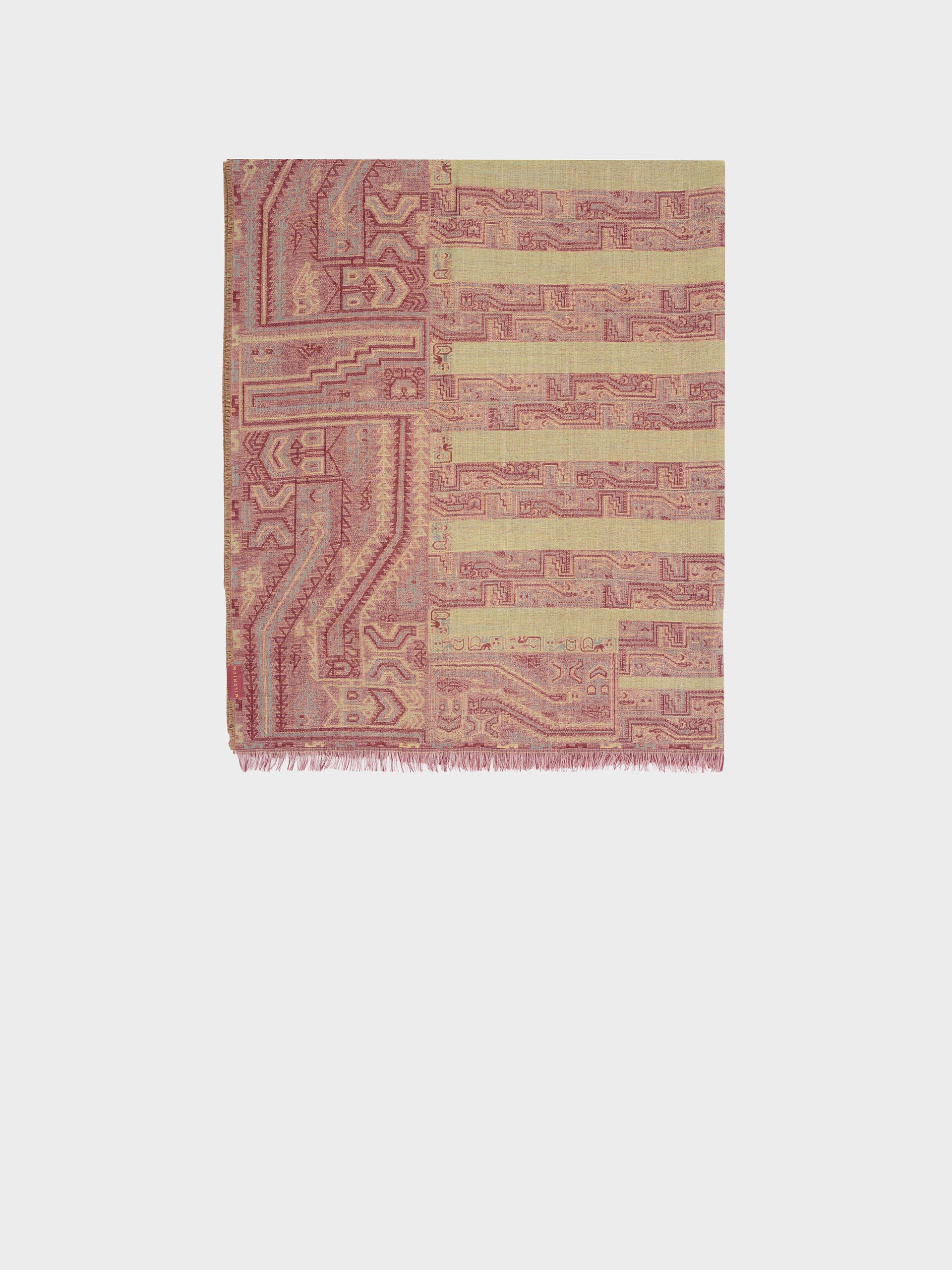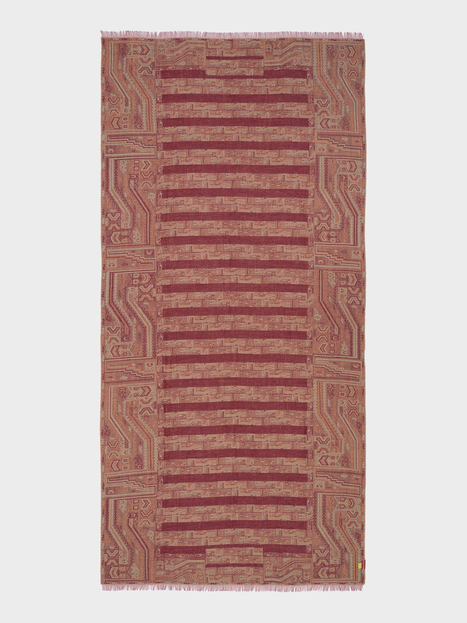 Paracas 19 stole in red, made from 50% Royal alpaca and 50% silk, using the Jacquard technique on double fabric with hidden weft insertion. Measuring 200/196 x 93 cm, this reversible garment is inspired by the Paracas culture and conveys ancestral heritage through a design with deep cultural significance. | Predominant material: Royal Alpaca And Silk