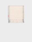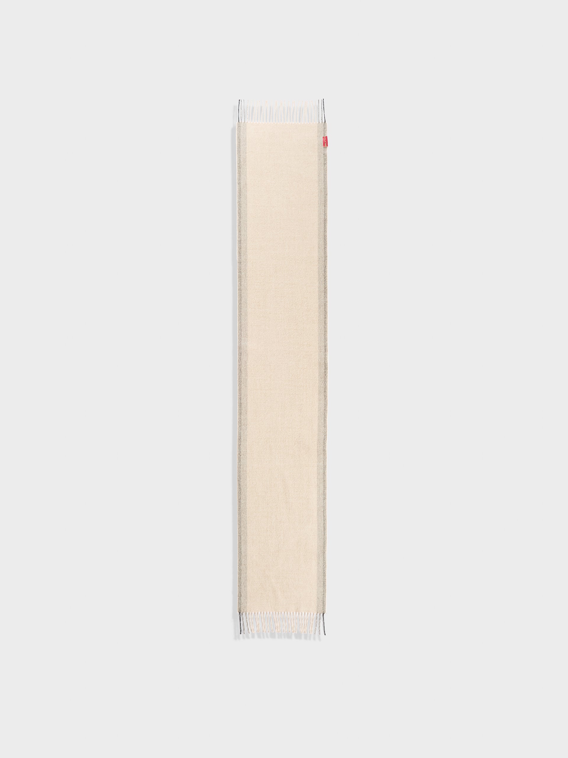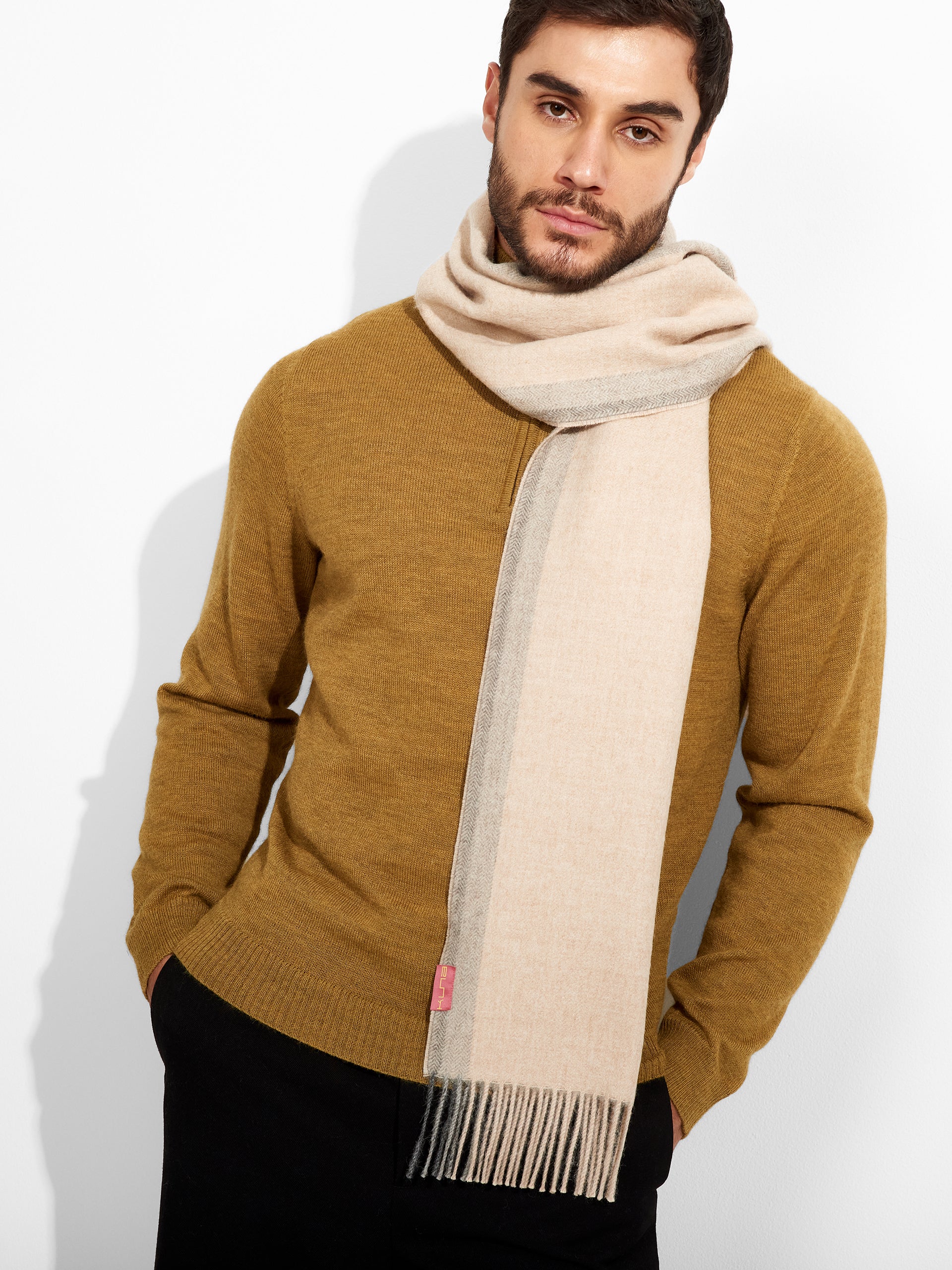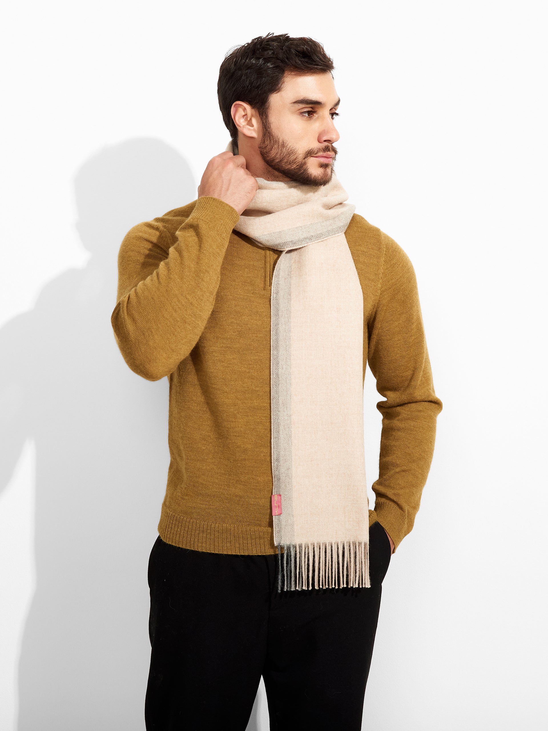 Ravenna Scarf in beige tone, with contrasting color edges, featuring fine fringes that add a touch of dynamism. Crafted from baby alpaca, it offers warmth and exceptional softness. | Predominant material: Baby Alpaca