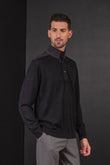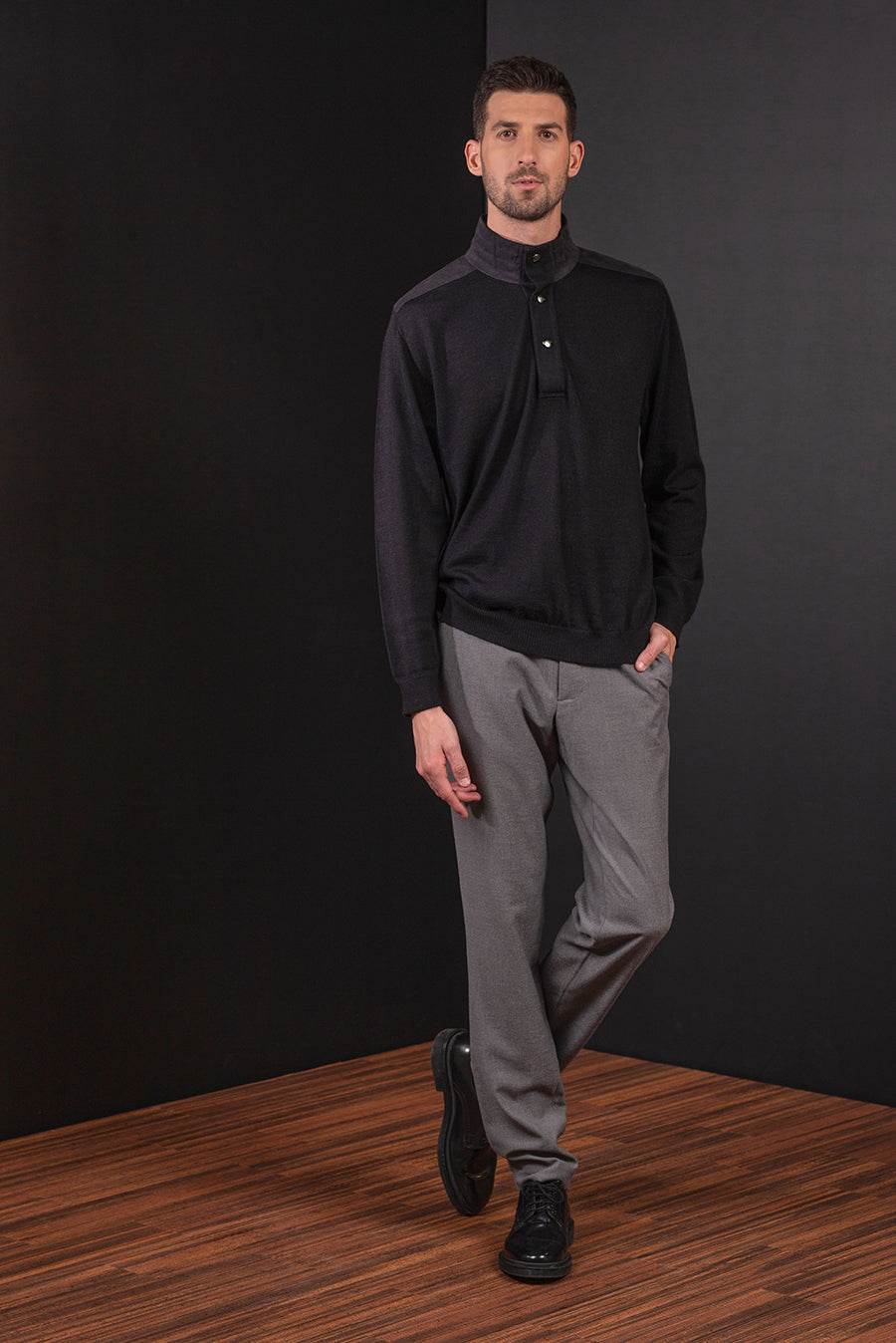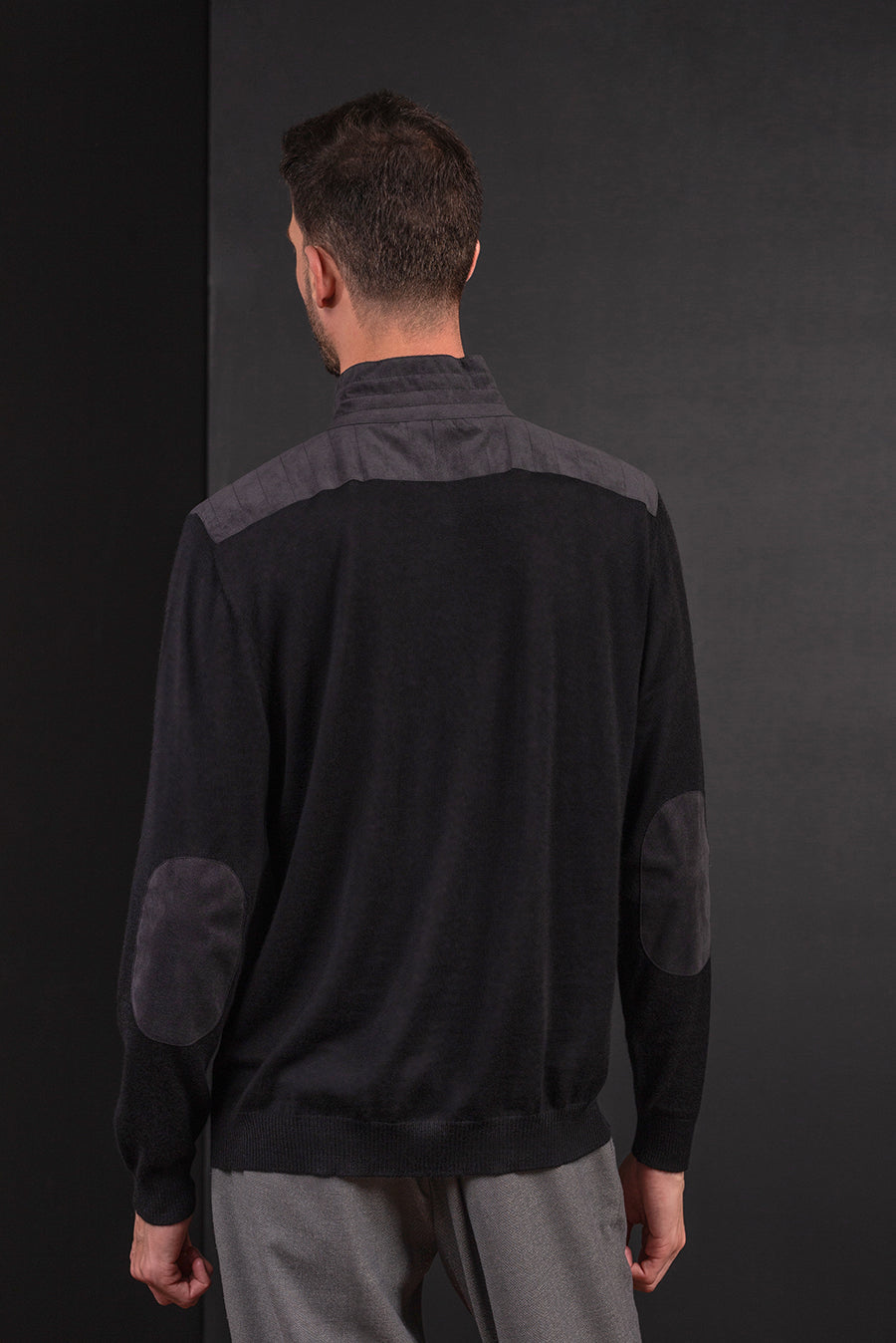 High neck sweater made with the finest alpaca fiber. Our exclusive alpaca 16 material is not only traceable but also extremely soft and warm. A garment of classic silhouette, but with elegant details of alcantara in the elbow pads, yoke and neck.