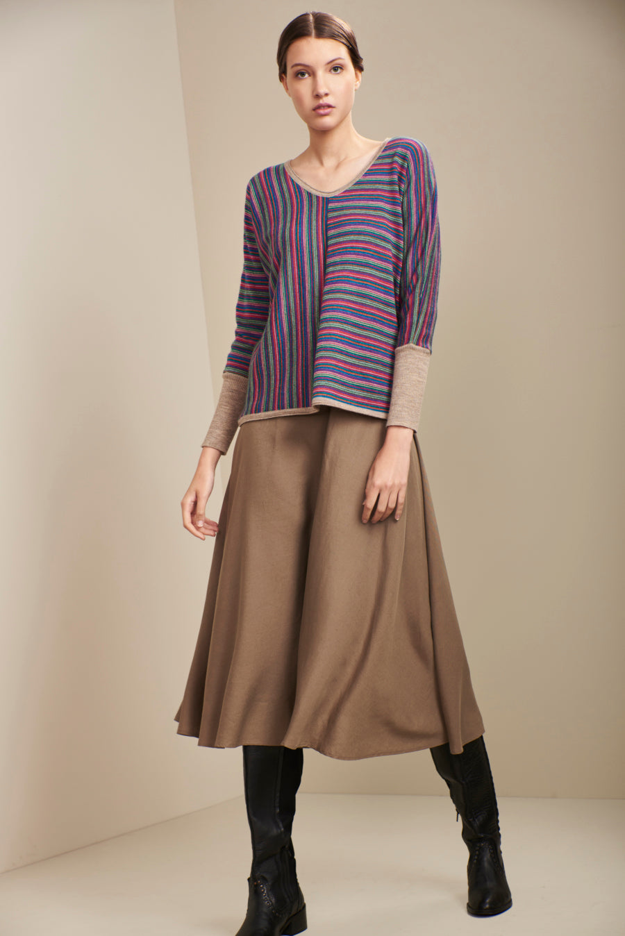 Fun design with horizontal and vertical lines, our Urda sweater made in baby alpaca is one of those garments to show off a casual look.
