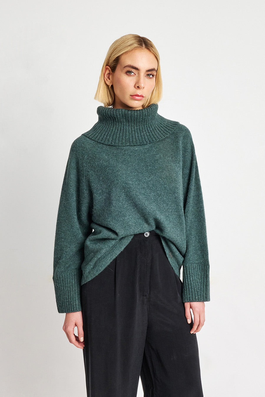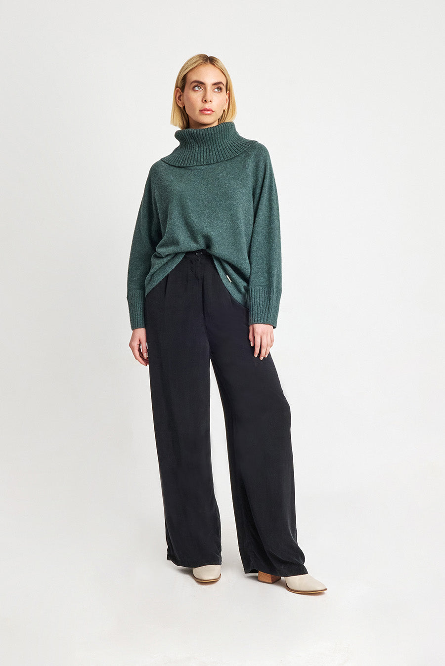 Oversize sweater made from fine baby alpaca yarn. This great sweater with a turtleneck and attractive sleeves can be the protagonist of your casual look. Available in warm and natural shades.