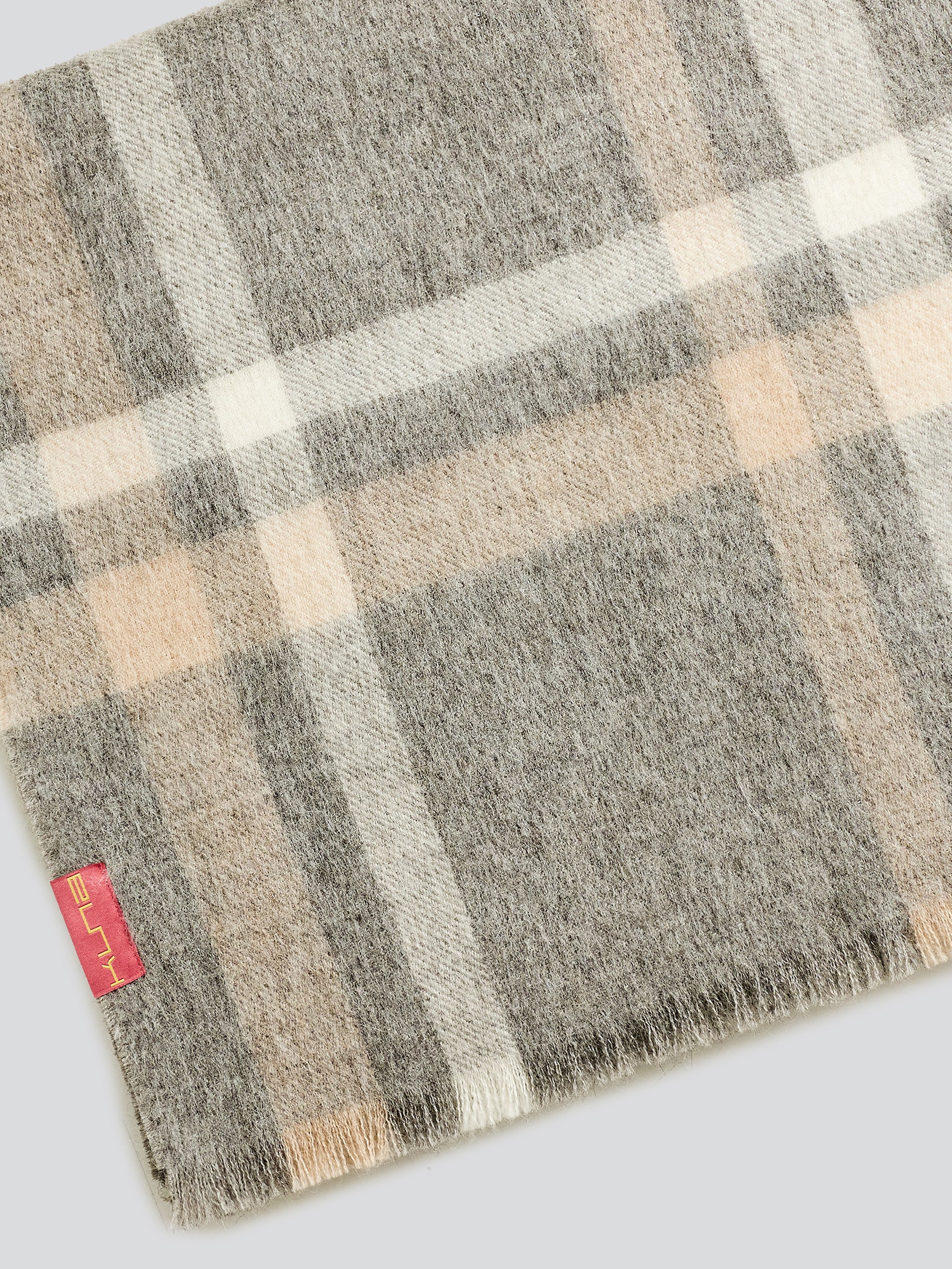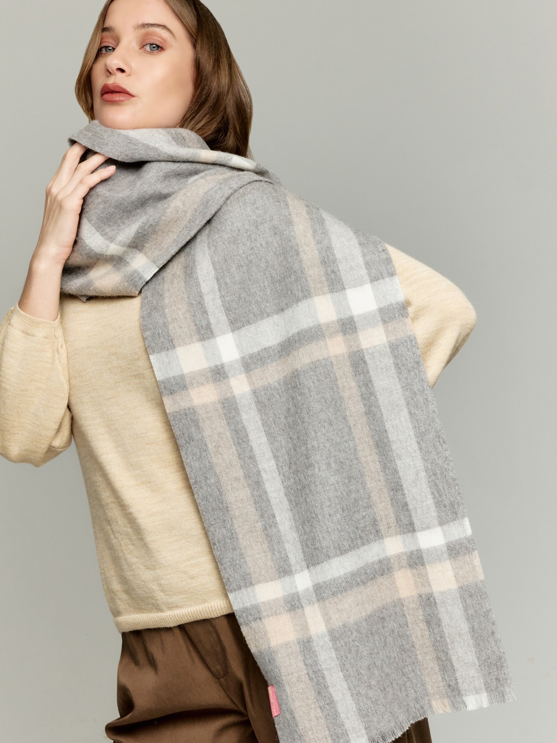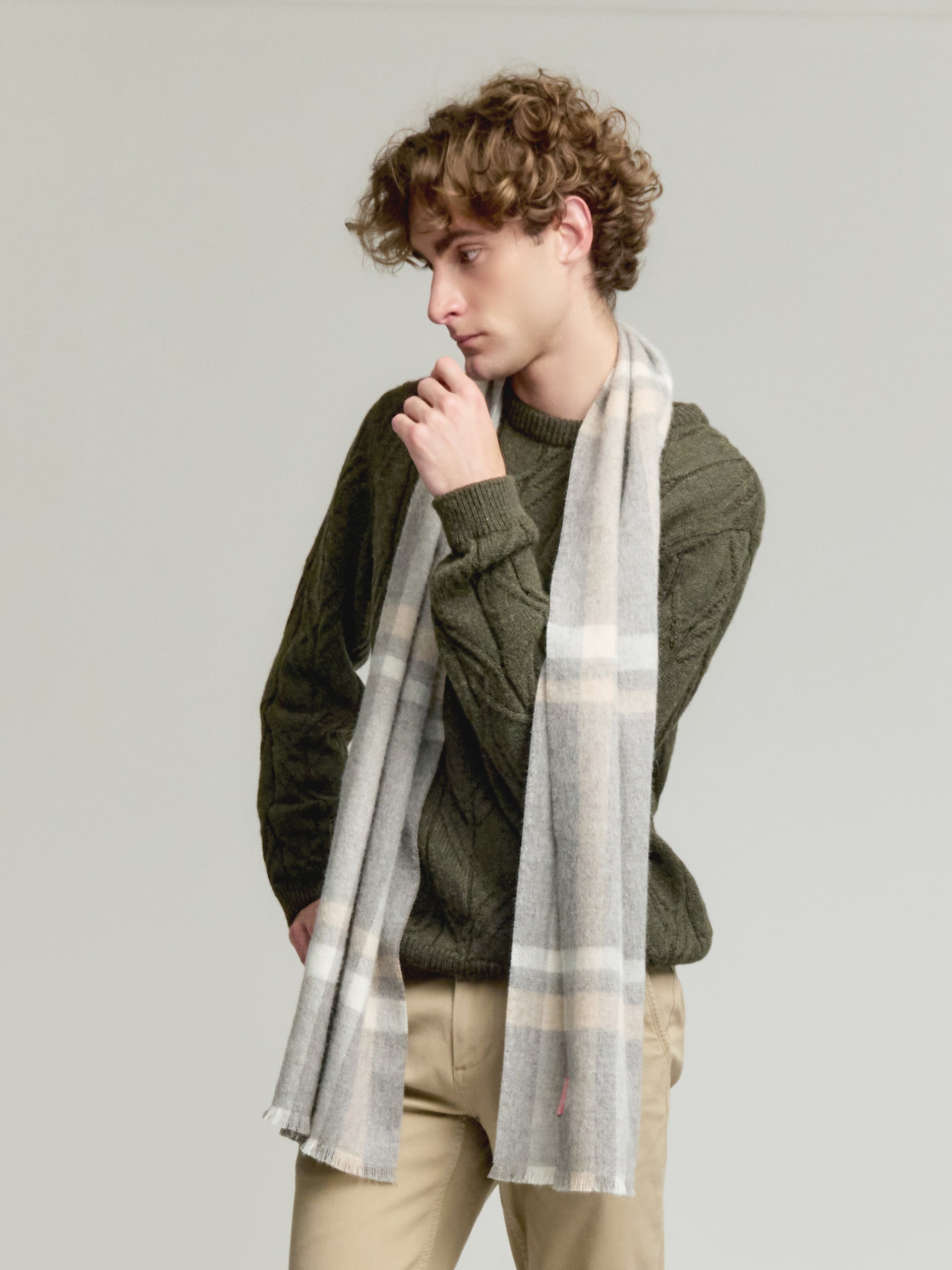 Exquisite baby alpaca scarf, woven with precision and adorned with a refined checkered design. Its softness envelops gracefully, providing a delicate warmth and unequaled elegance. Available in two sophisticated shades, this item will heighten your style every time. | Material predominante: Baby Alpaca