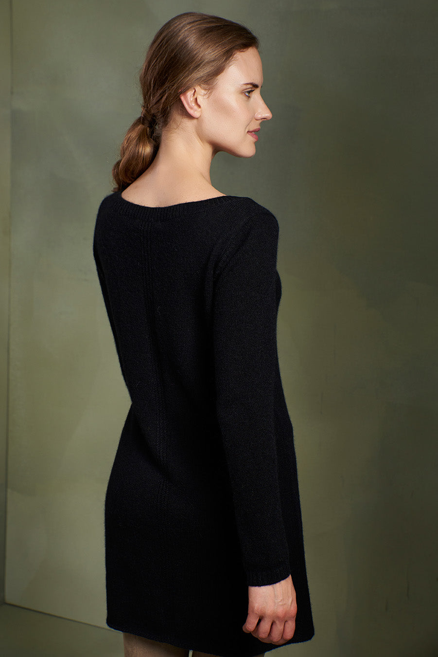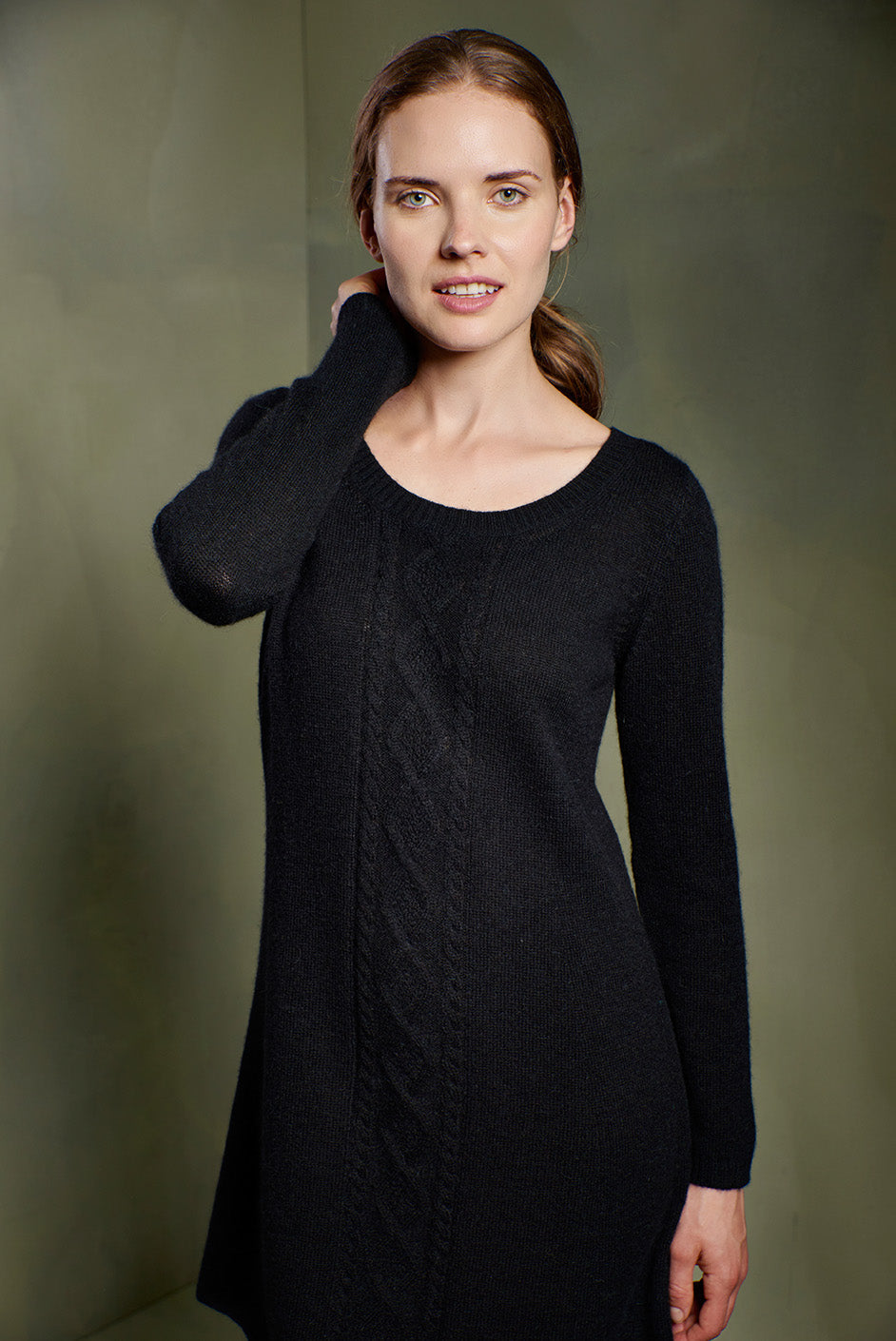 Elegant knitted dress with a horizontal weave and central detail made of baby alpaca in sober tones.