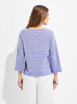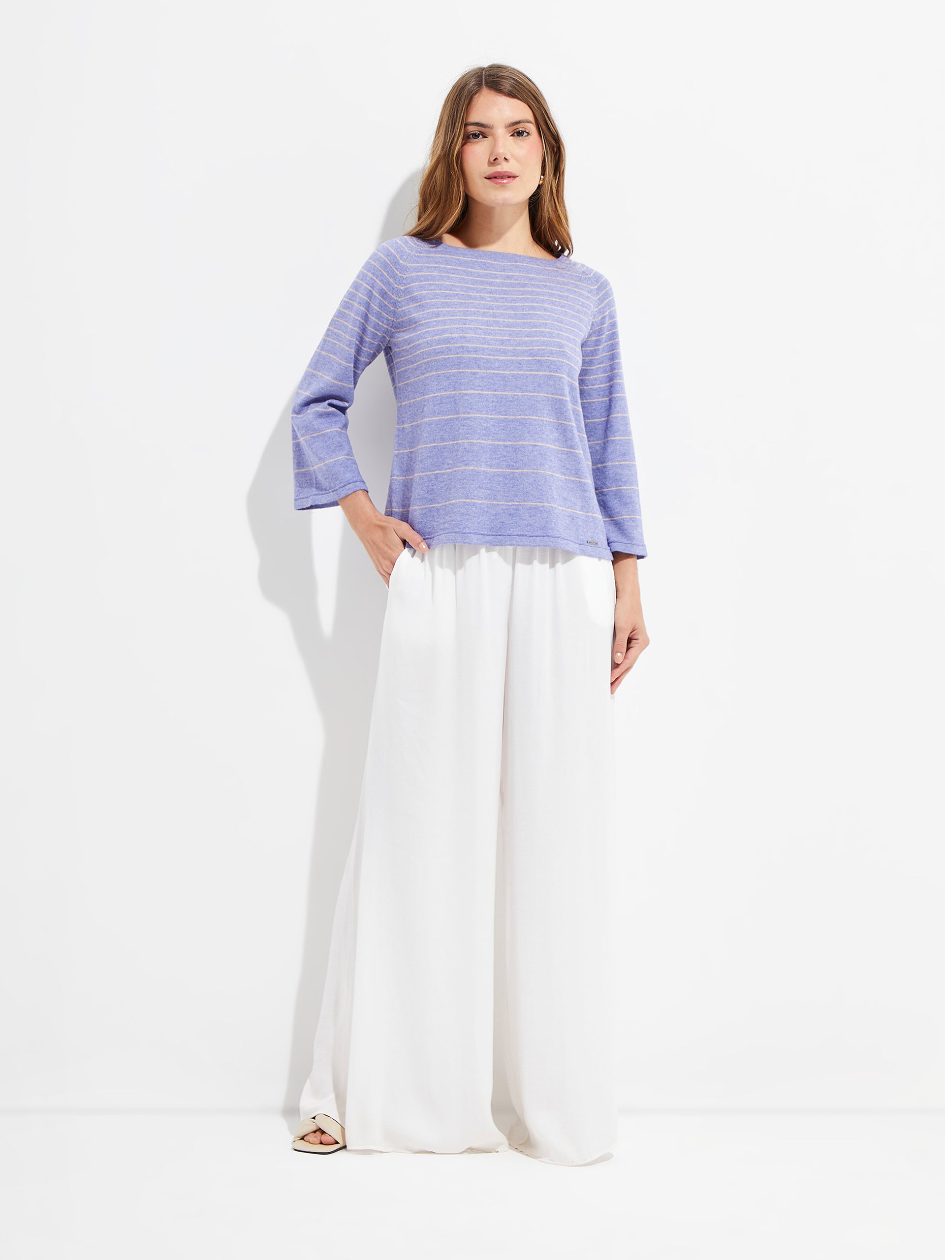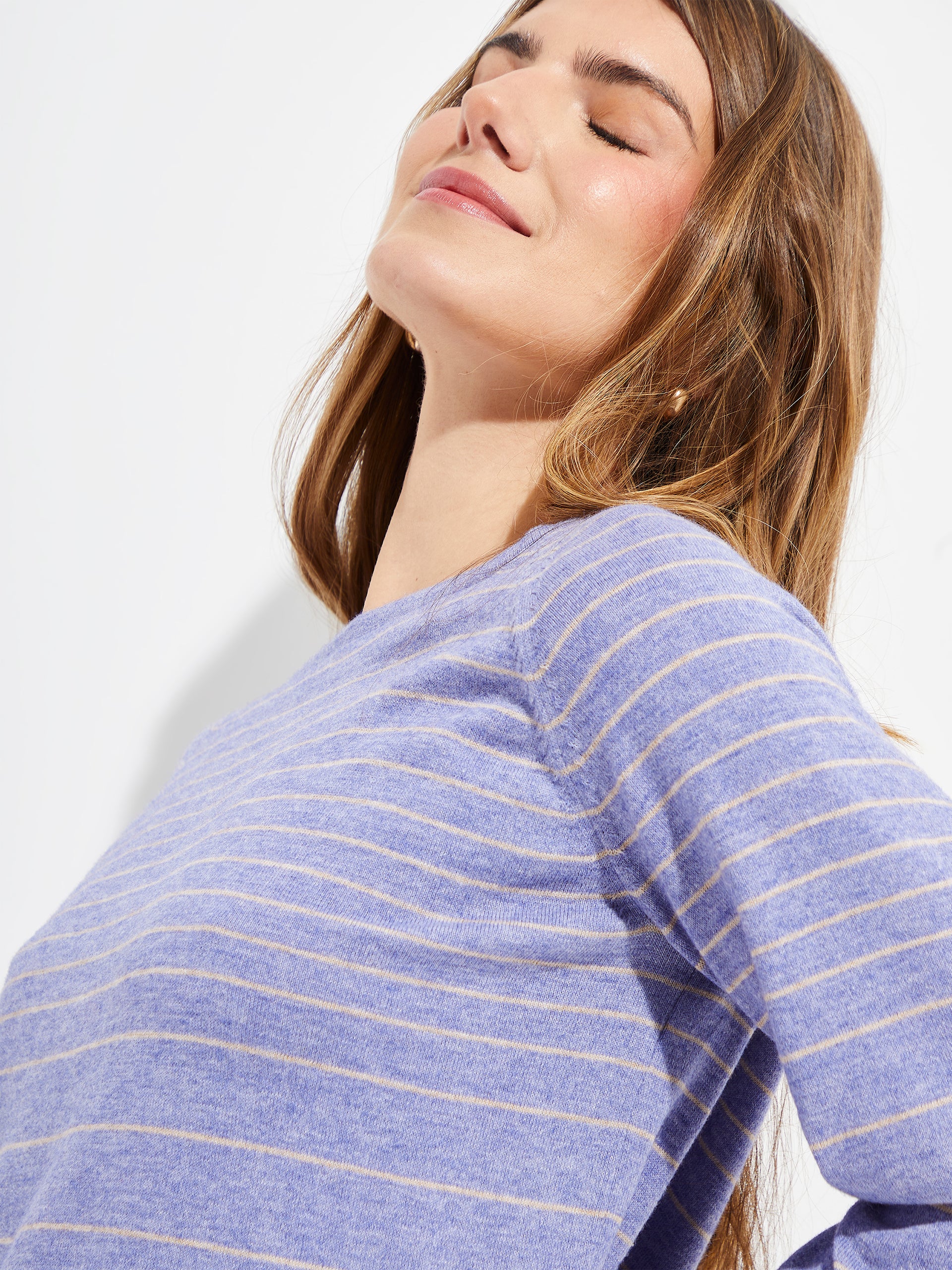 Our Yackelina sweater, knitted in jersey stitch, blends organic cotton and baby alpaca for extra softness. It has a square neckline, 3/4 sleeves and an oversize style. Its horizontal striped design adds a modern touch. Available in two shades. | Predominant material: Cotton