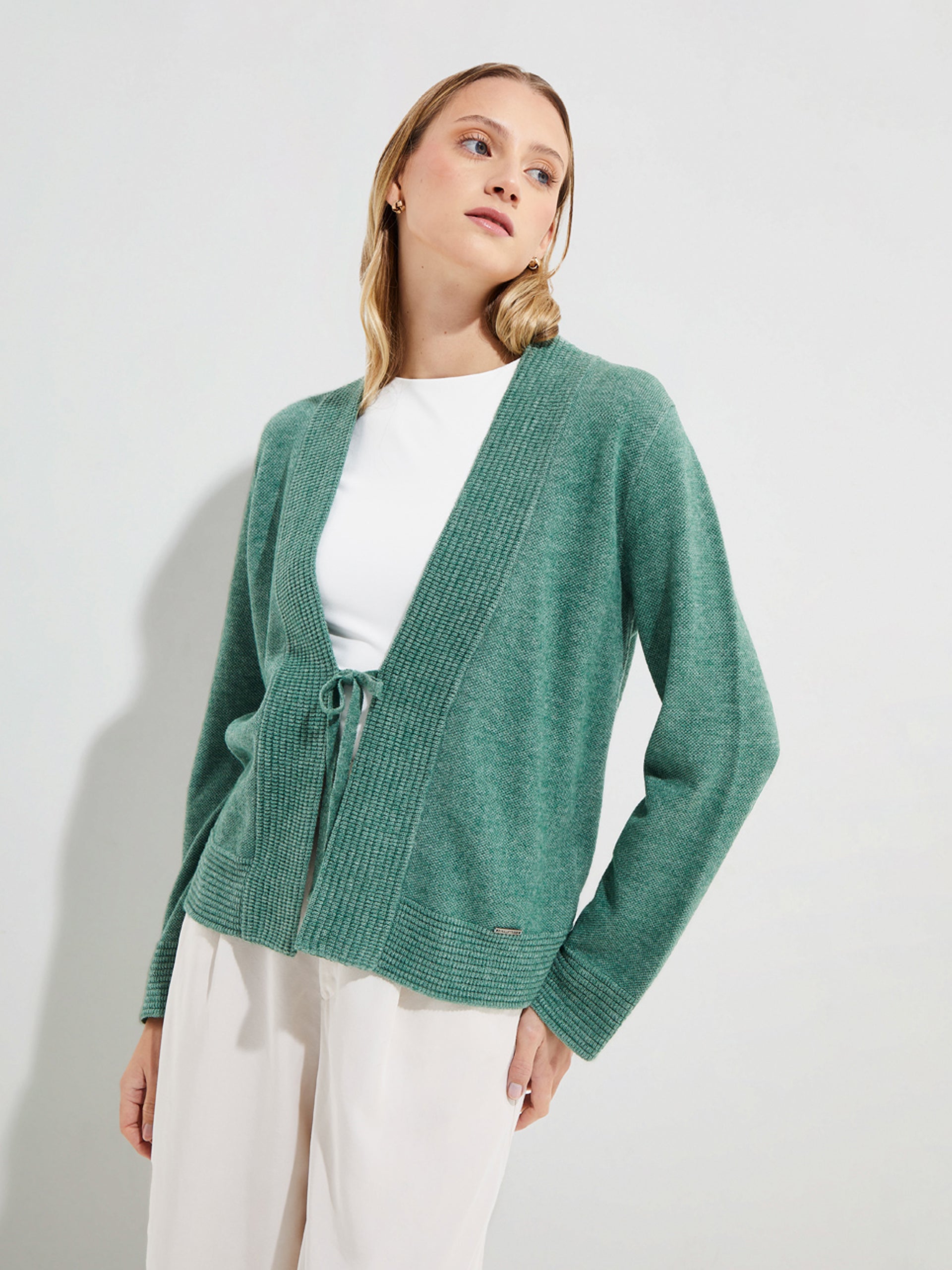 The Yalika cardigan, available in two colors characteristic of the collection, is made from a blend of organic cotton and baby alpaca. It features details on the bands and collar with a combination of reverse English half-stitch and jersey stitch. In addition, it features two knitted bows on the central part, adding a distinctive touch. | Predominant material: Cotton